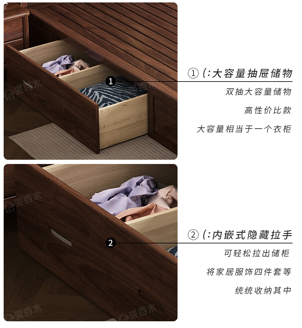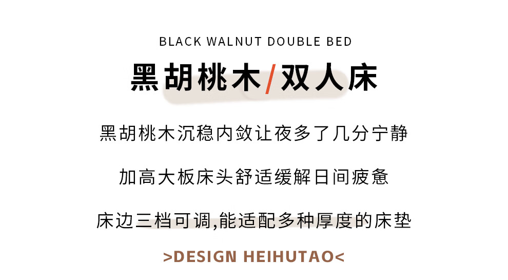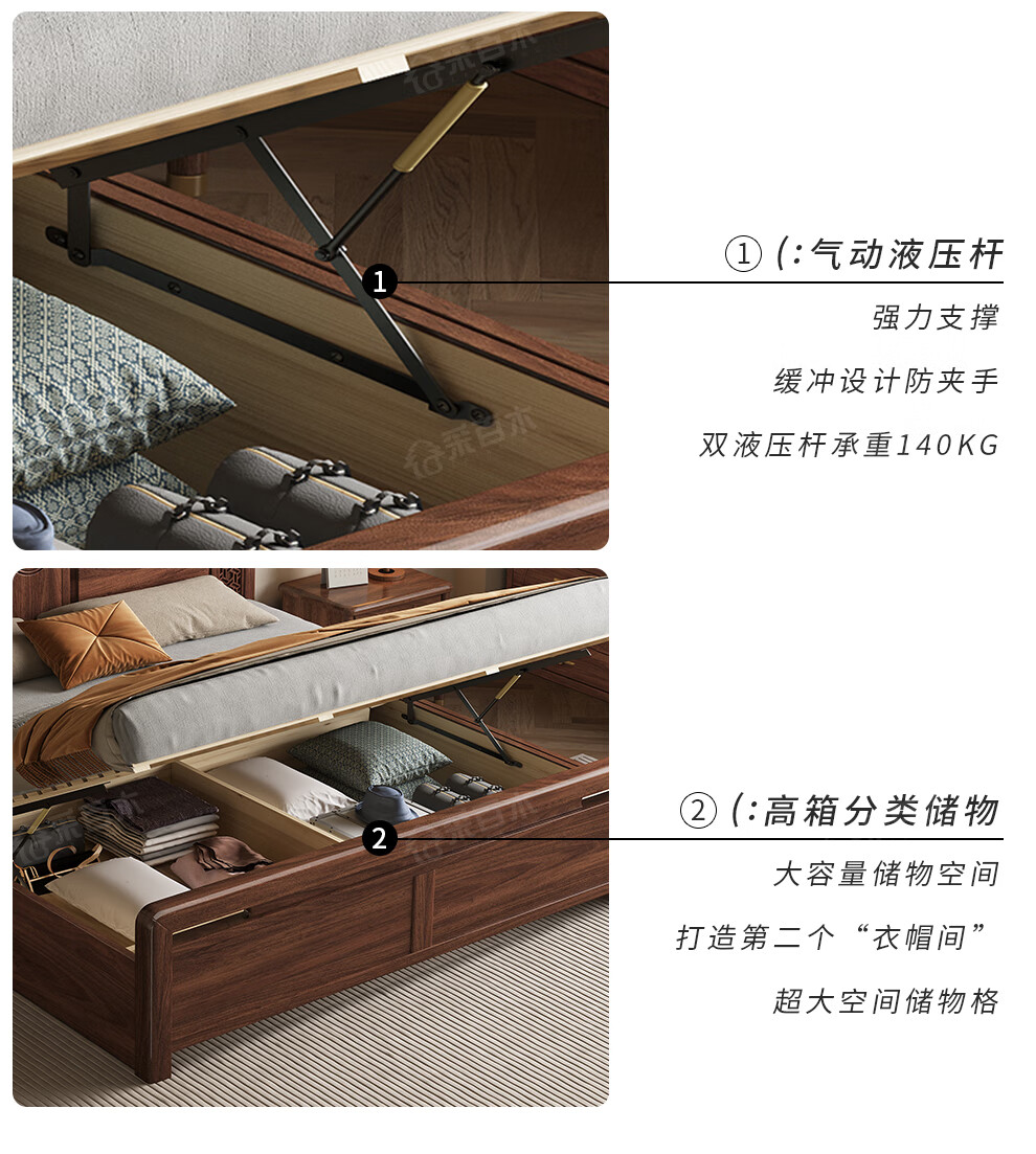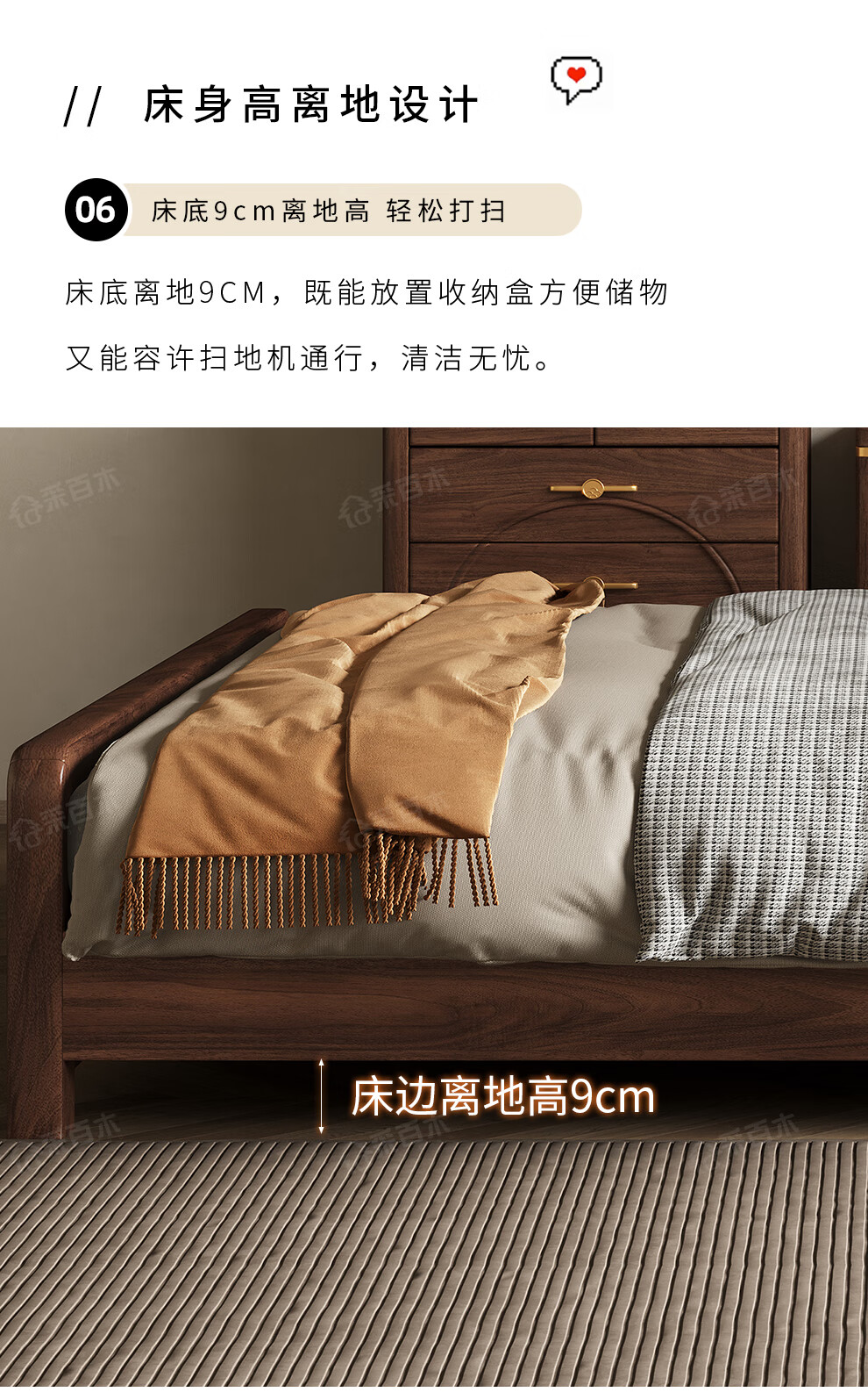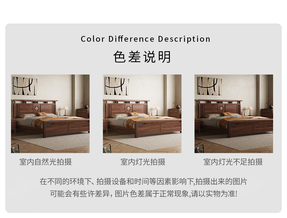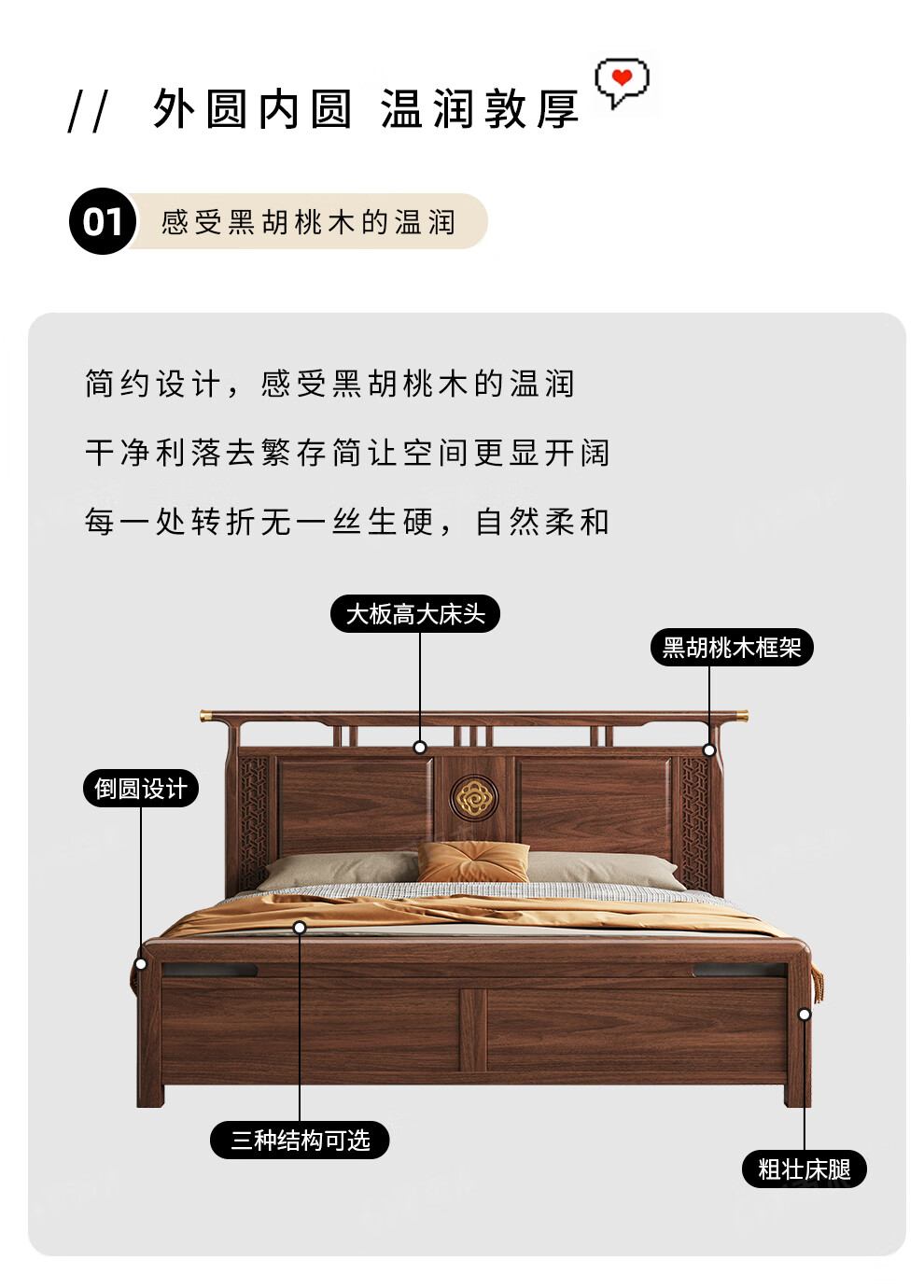 Caibaimu Bed Black Walnut New Chinese Solid Wood Bed Simple Modern Double Bed Master Bedroom Bed High-end Master Bedroom Furniture Bed Bracket Structure 1800*2000mm