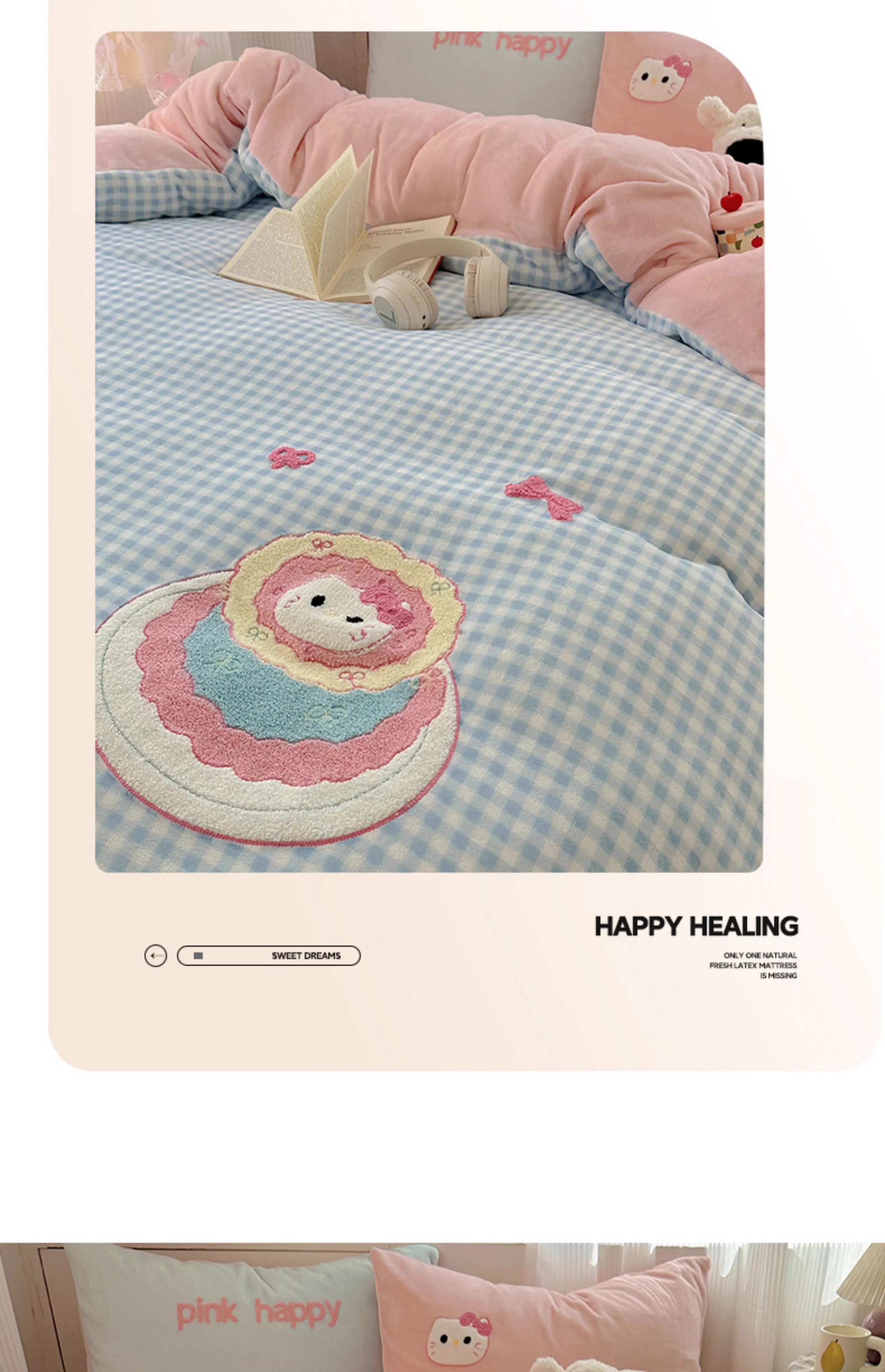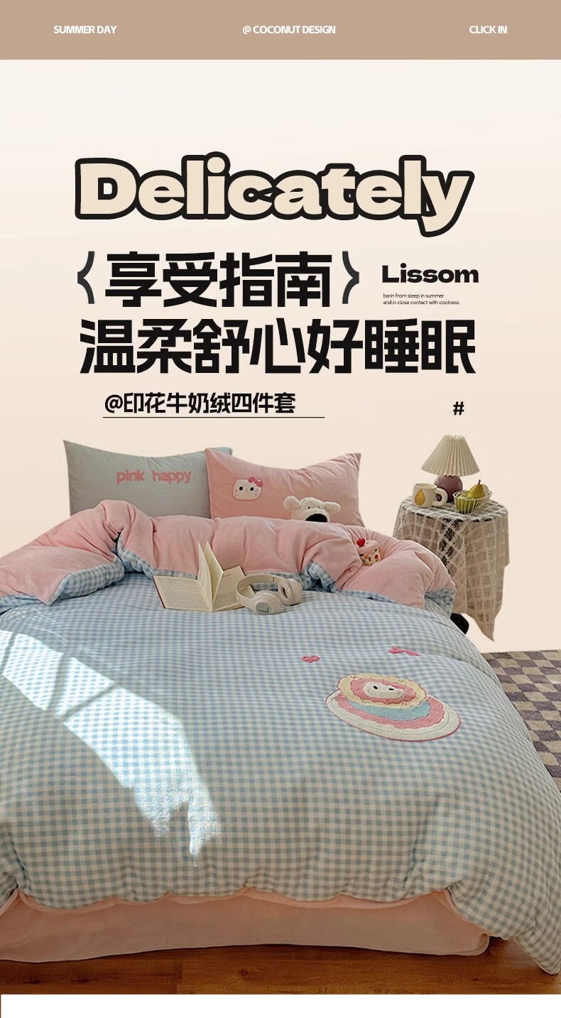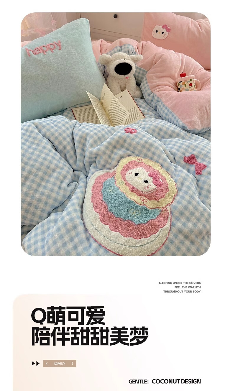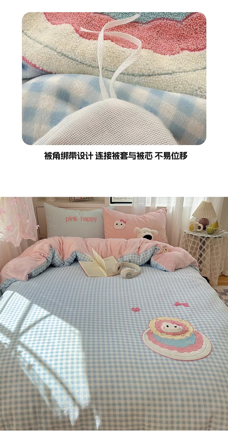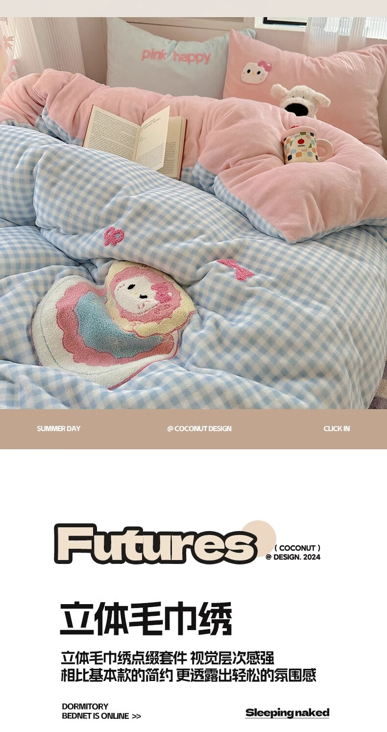 Enxing winter thickened plus velvet bed four-piece set coral milk flannel towel embroidered quilt cover sheet baby velvet bedding GL Blue Cat Cat A thickened milk velvet softer and warmer 1.5m bed sheet style four-piece set - quilt cover 200*230cm