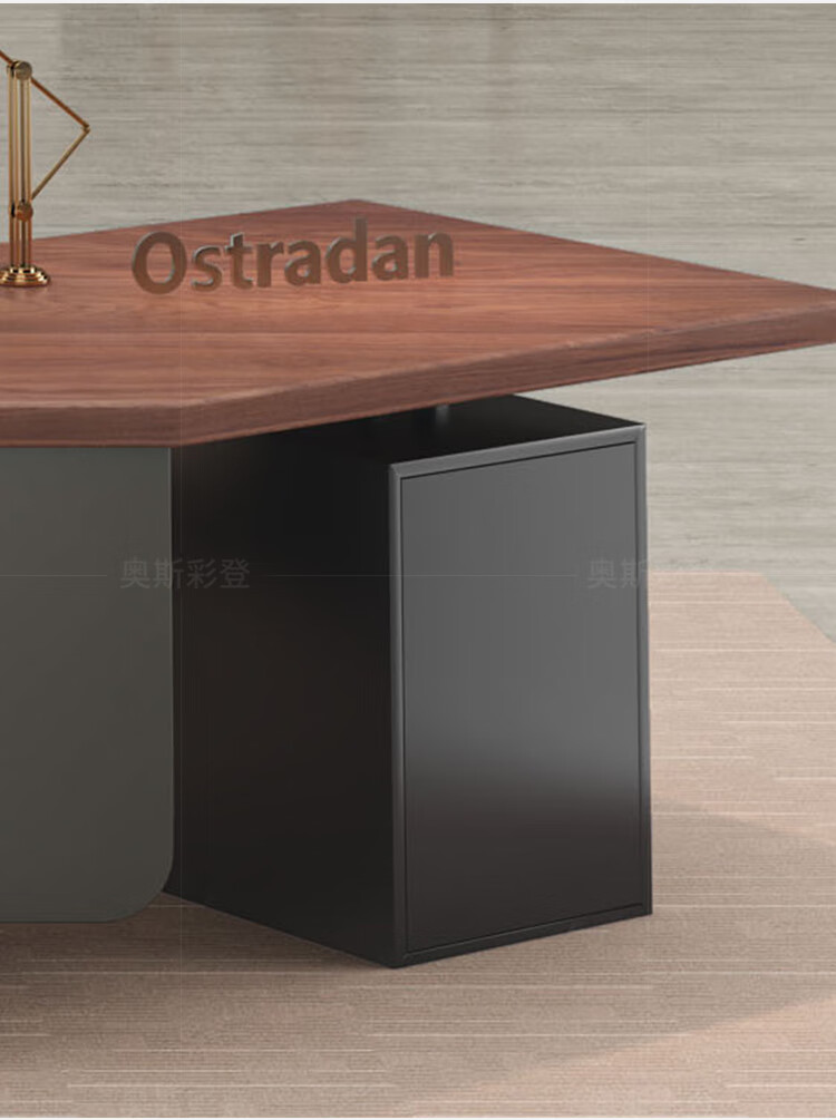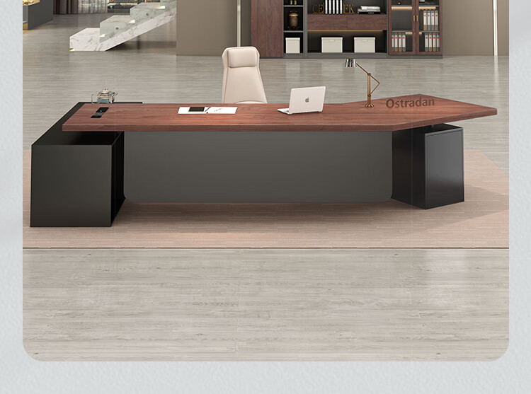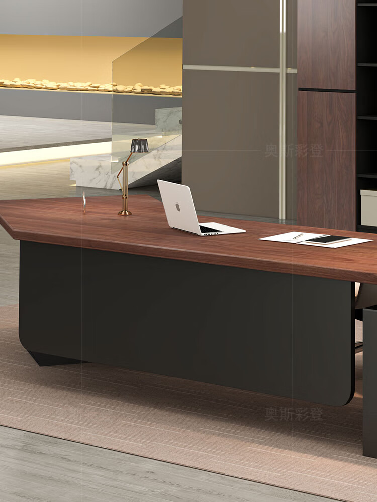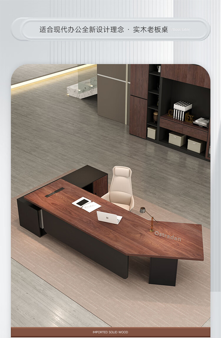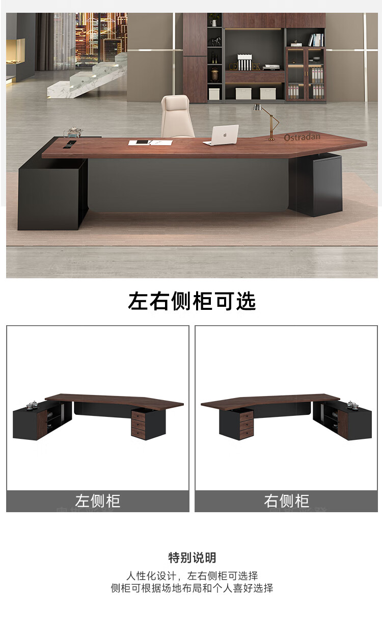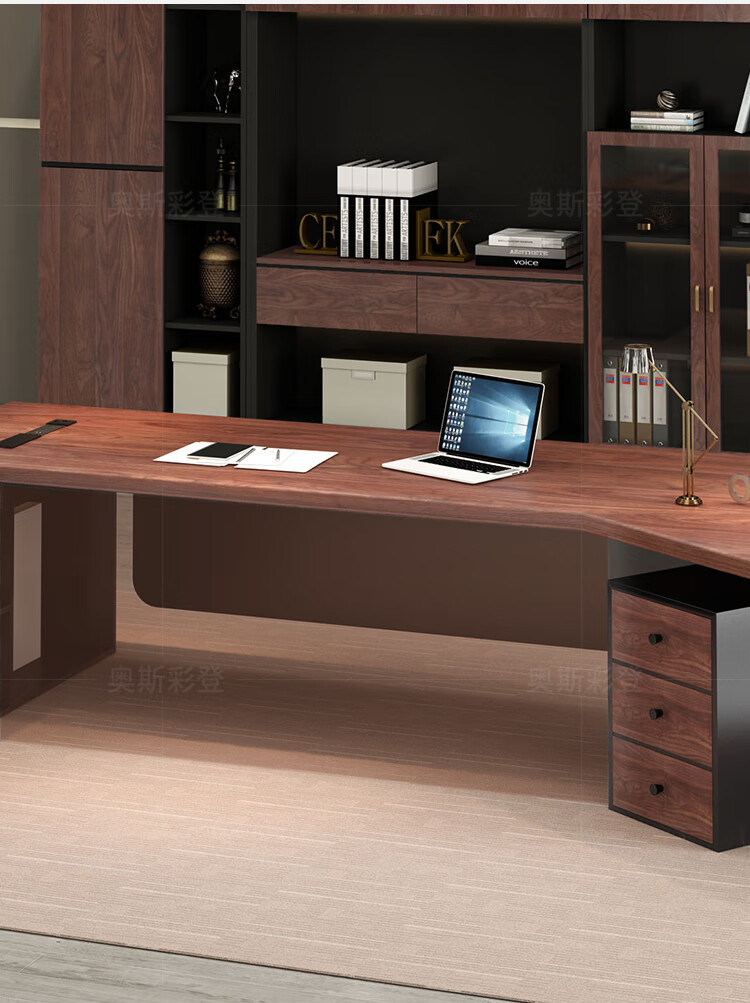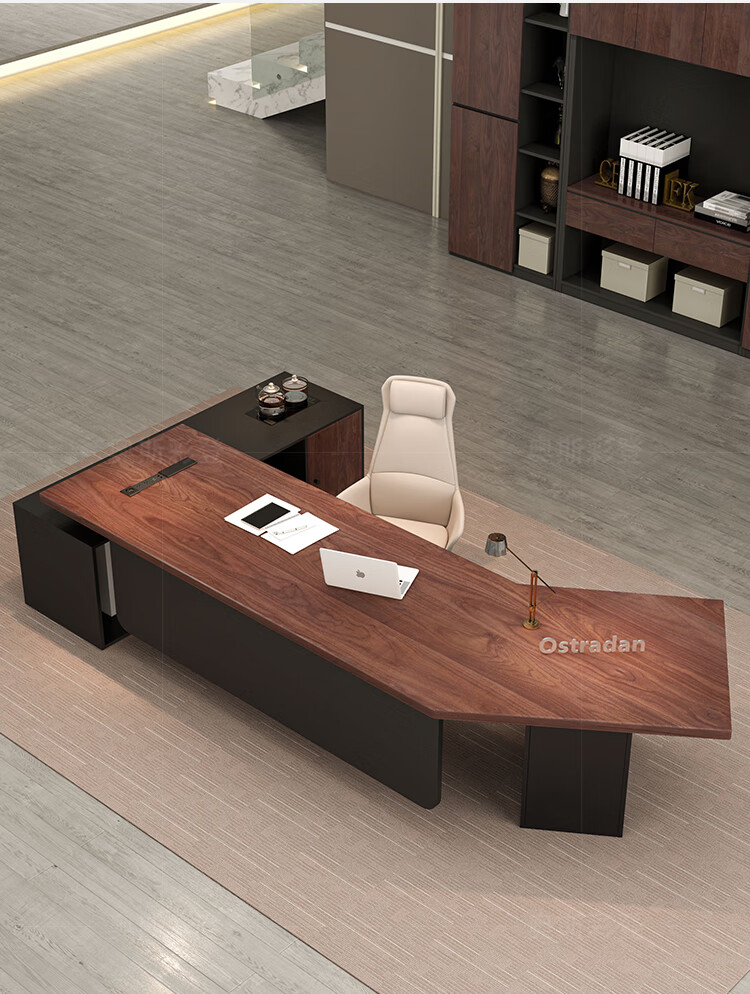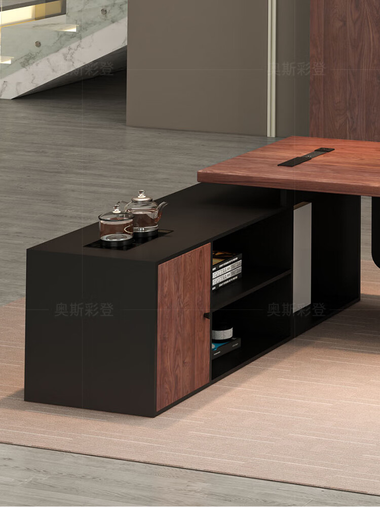 Oscarden Juzi Solid Wood Boss Desk with Side Cabinet Socket Black Walnut President Desk Law Firm Office Tea Table Integrated Style-Color-Size Customized Photoshoot