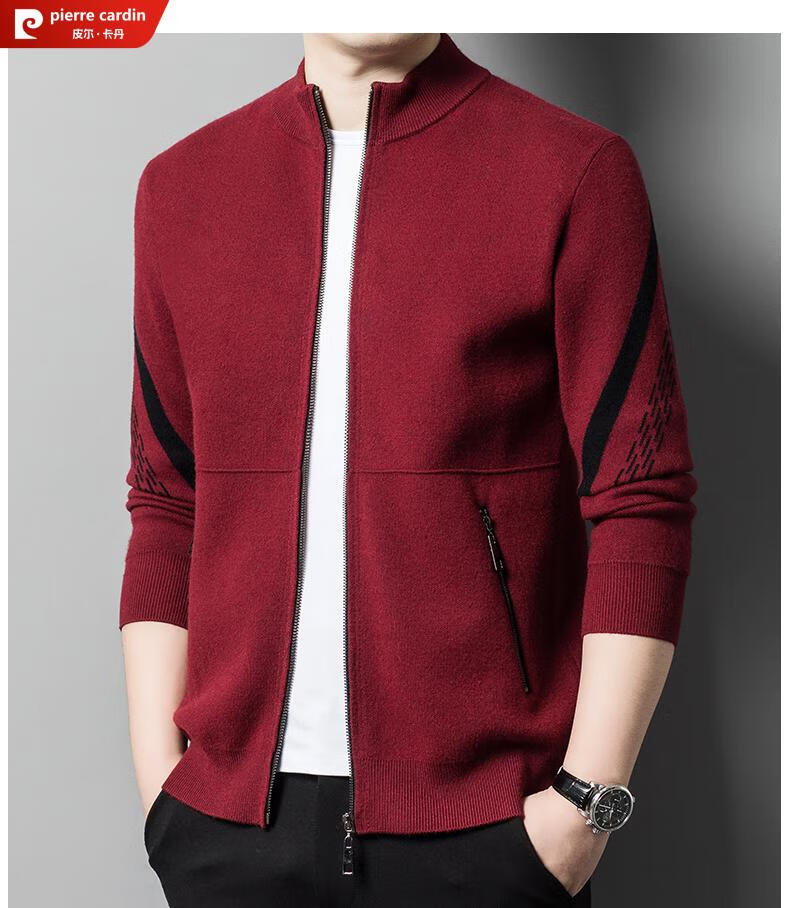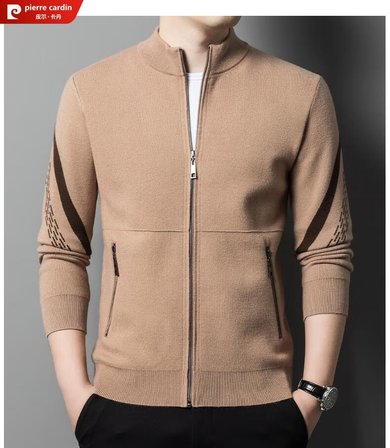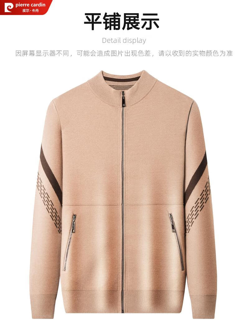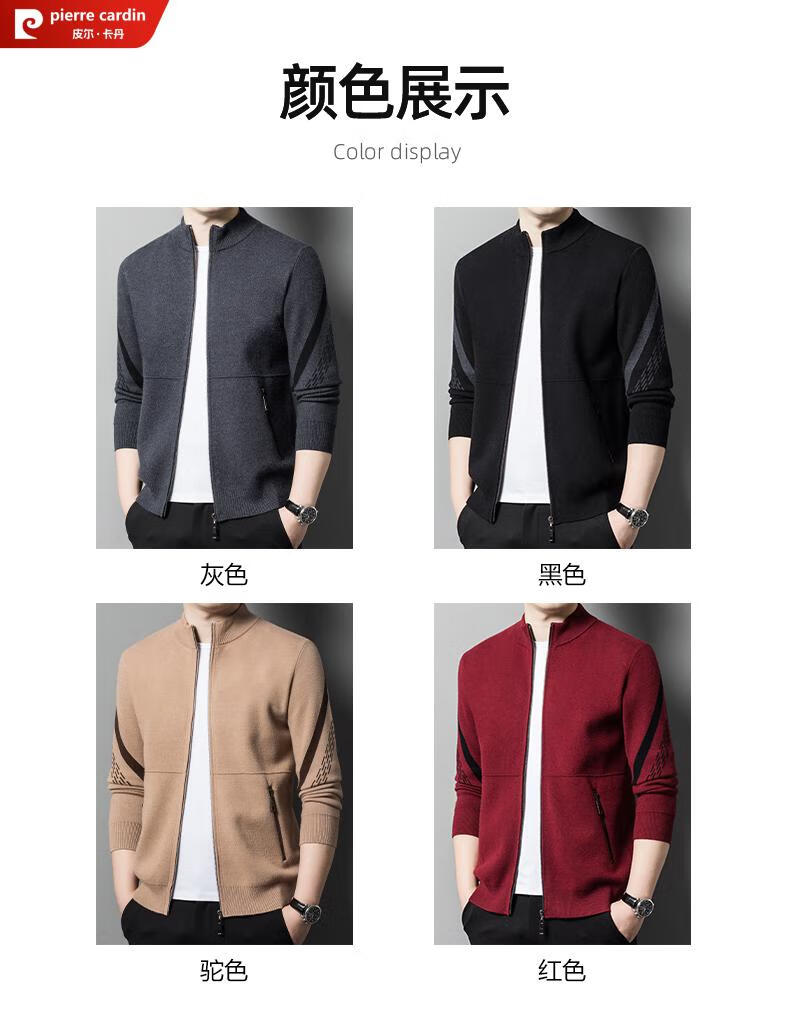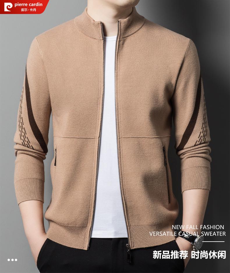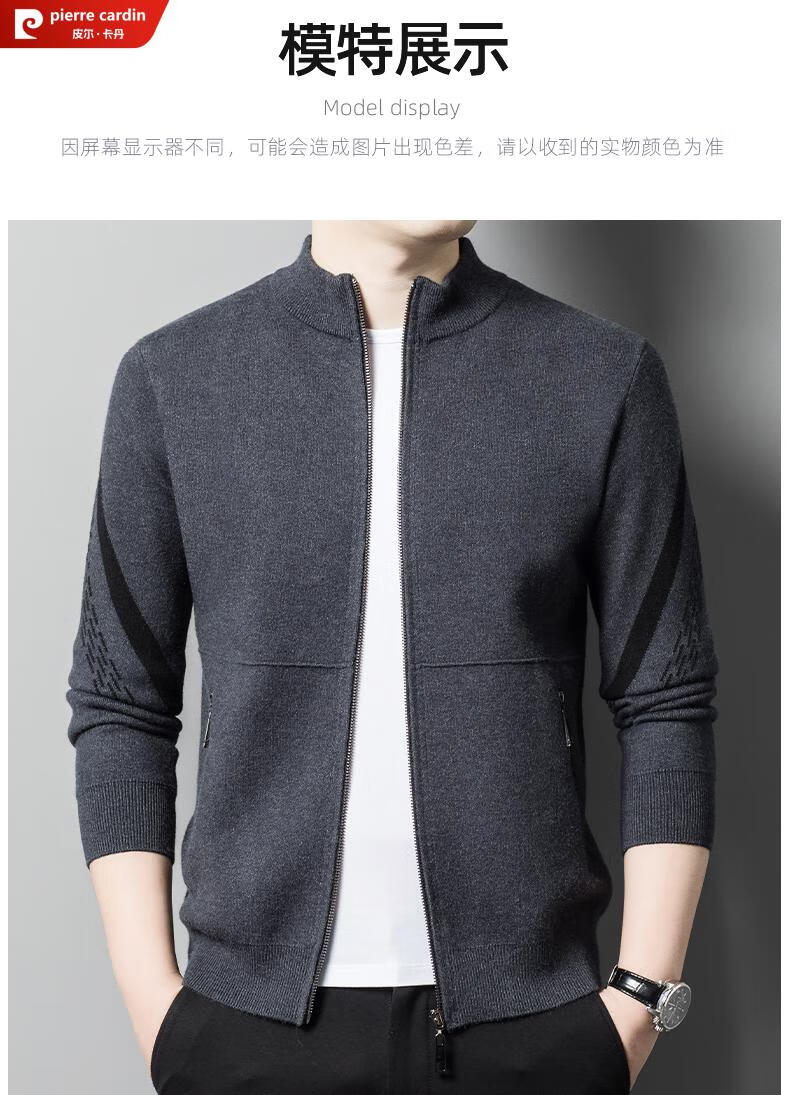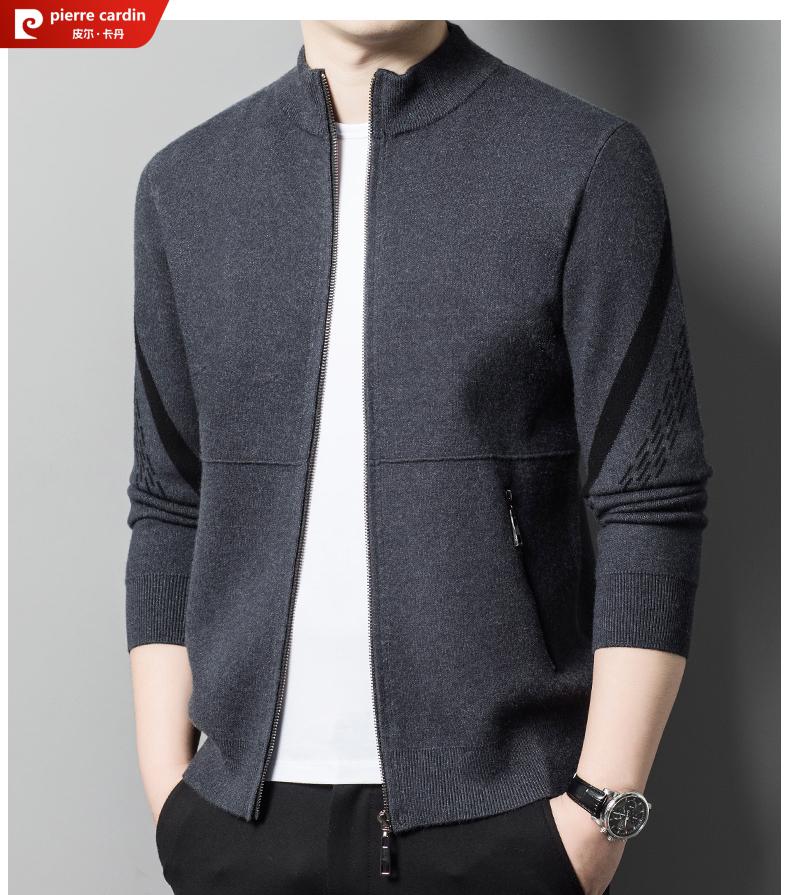 Pierre Cardin 100% Wool Knitted Cardigan Men's Stand Collar Spring and Autumn Jacket Korean Style Men's Casual Sweater Zippered Outer Top Gray XL 175 Recommended 135-150Jin Jin equals 0.5 kg