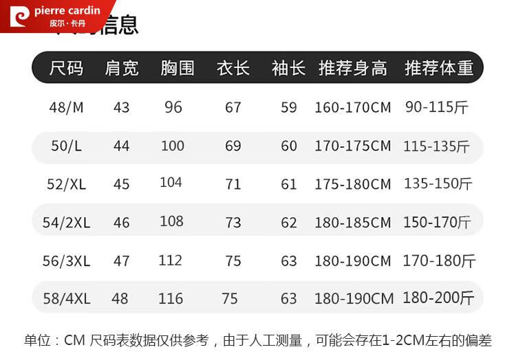 China (cm) 165 / 88-90 170 / 96-98 175 / 108-110 180 / 118-122 185 / 126-130