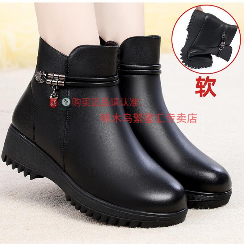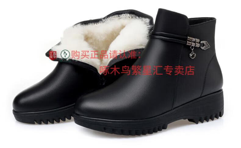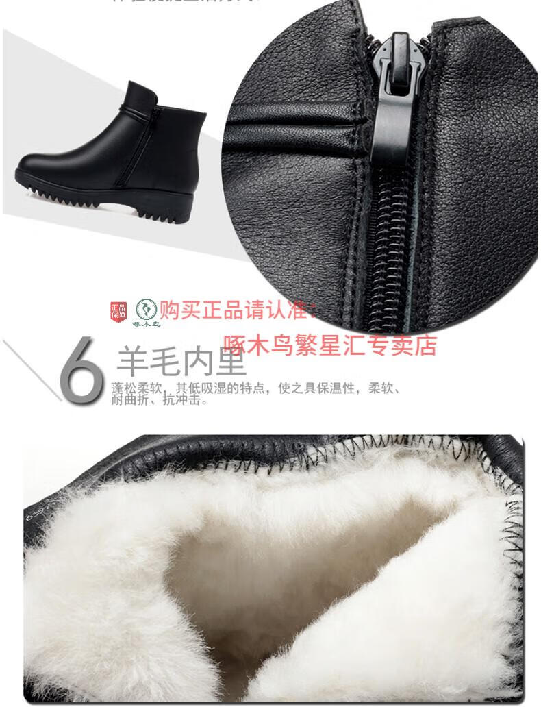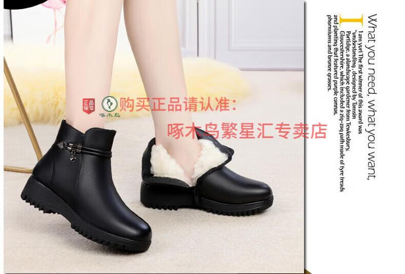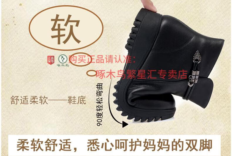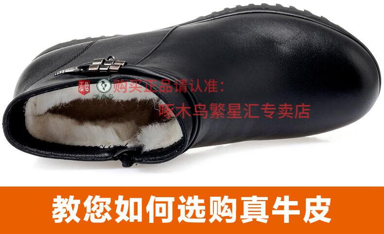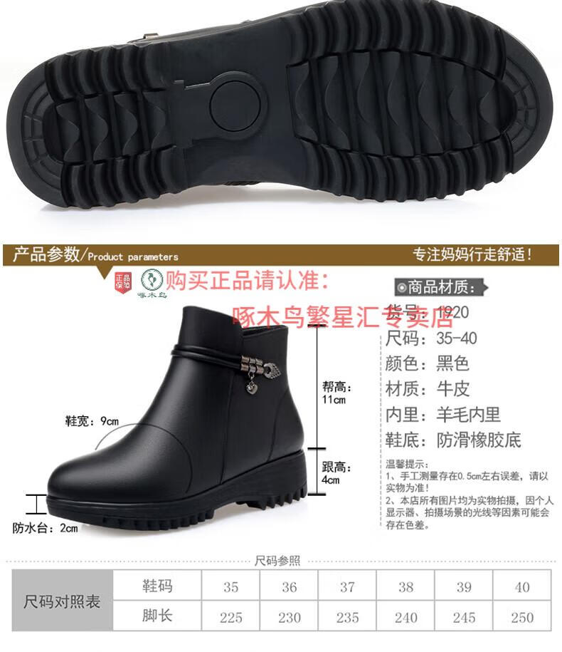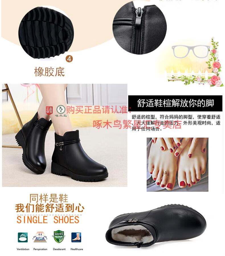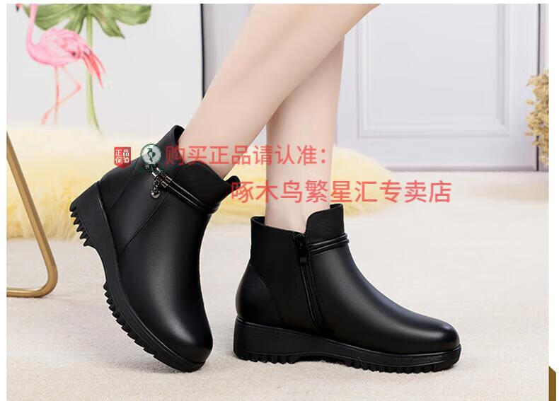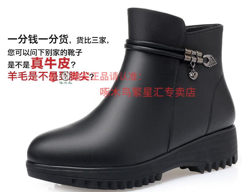Woodpecker full cowhide short boots for women genuine leather wedge flat mother cotton shoes winter plus suede leather shoes wool winter shoes large size women's boots black full cowhide + thickened pure wool lining 37