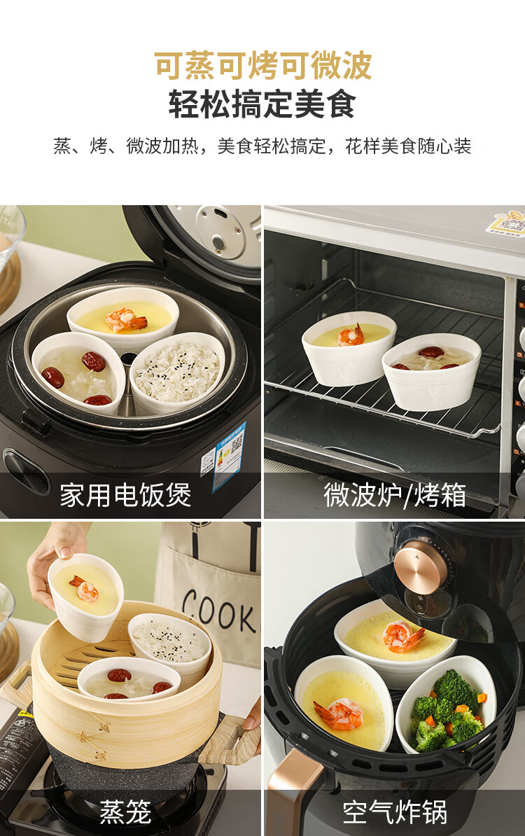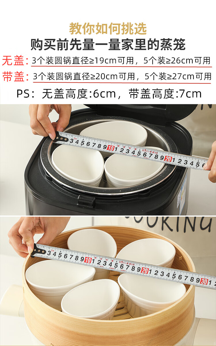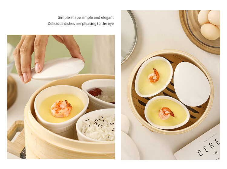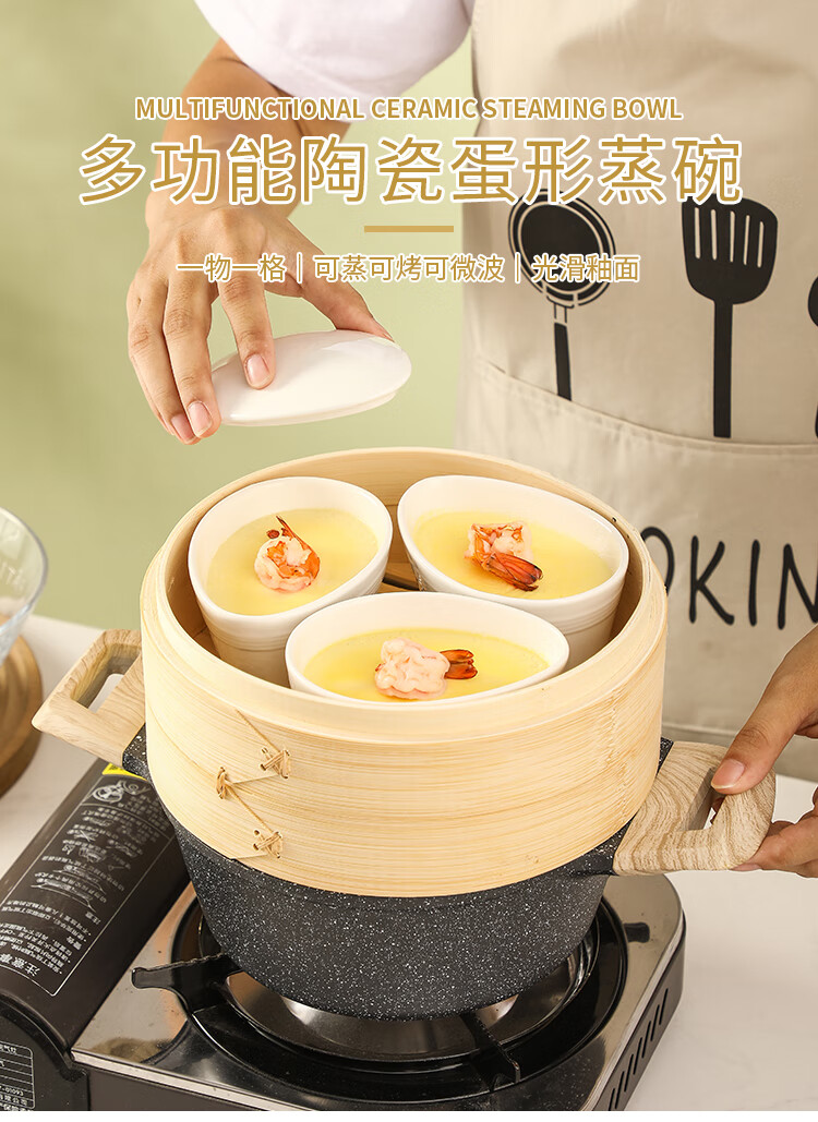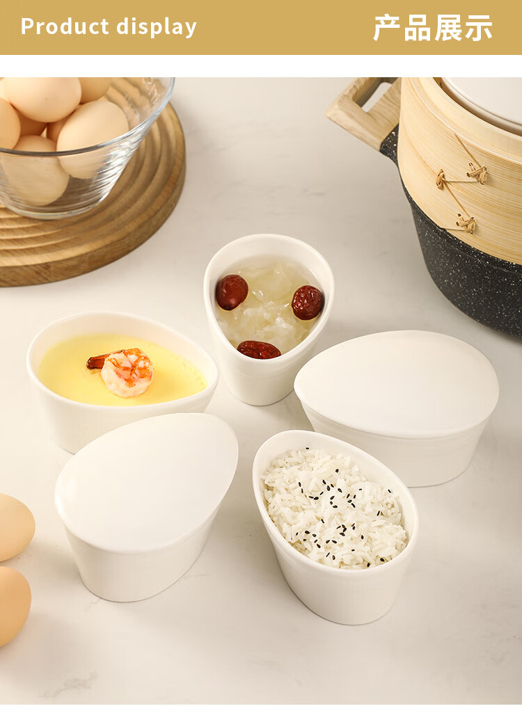 Muziqiu ceramic steaming bowl with lid, baby stew pot, small steaming cup, water-proof steamed egg, steamed rice, stewed egg, steamed egg custard special bowl, egg-shaped high-temperature ceramic bowl*3+porcelain lid*3