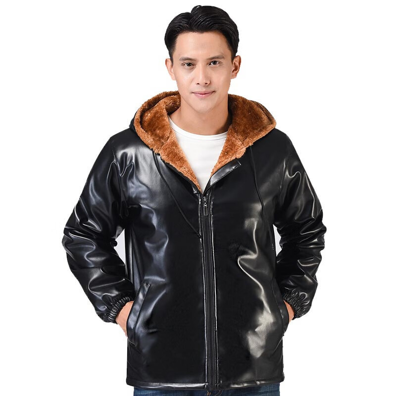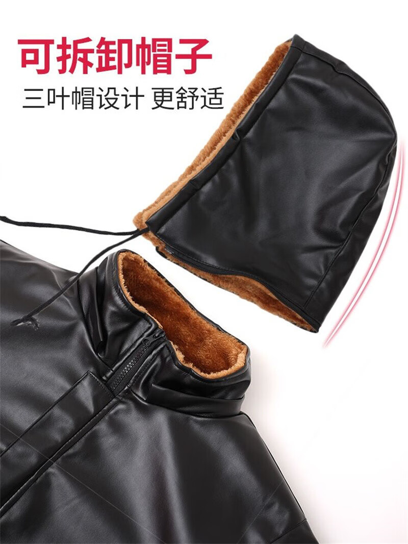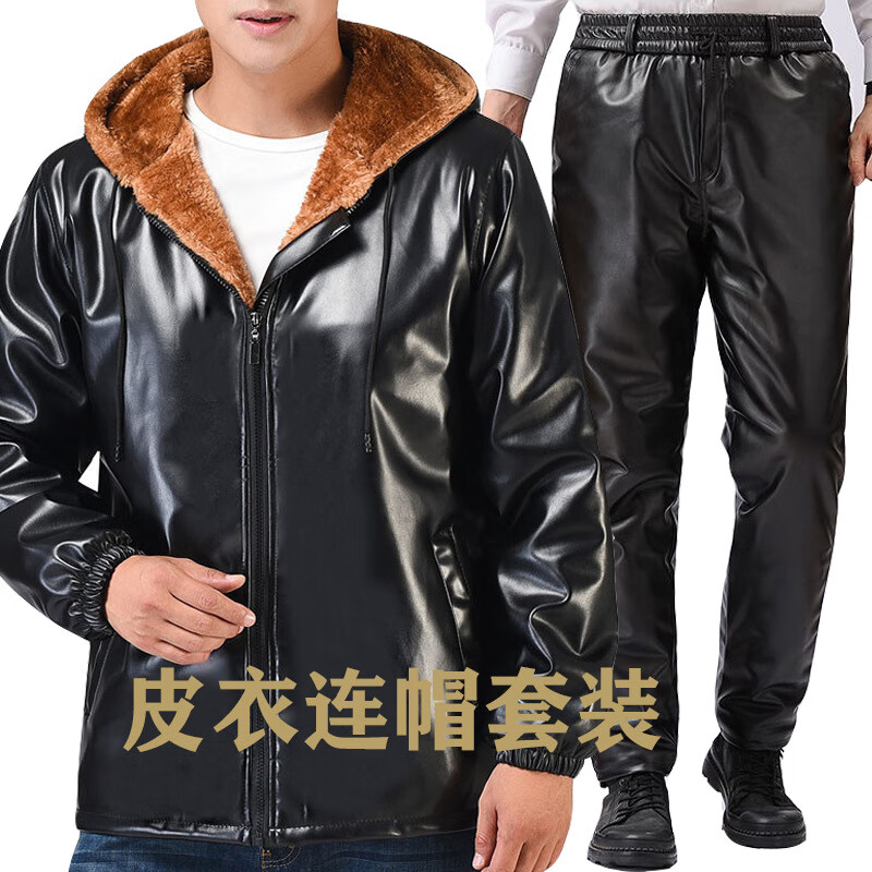 AJXOOR leather jacket and leather pants suit plus velvet and thickened men's leather jacket waterproof loose casual winter hooded work cotton coat detachable hooded top thickened 3XL recommended 138-155 Jin Jin equals 0.5 kg