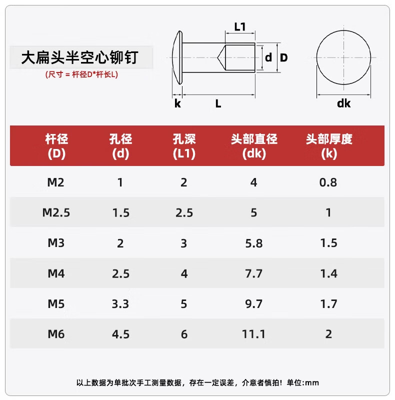Tianzhuo Hardware GB873 aluminum rivets large flat head semi-hollow rivets semi-round head hollow rivets round head M2M2.5M3M4M5M6 M4*30 50 pieces