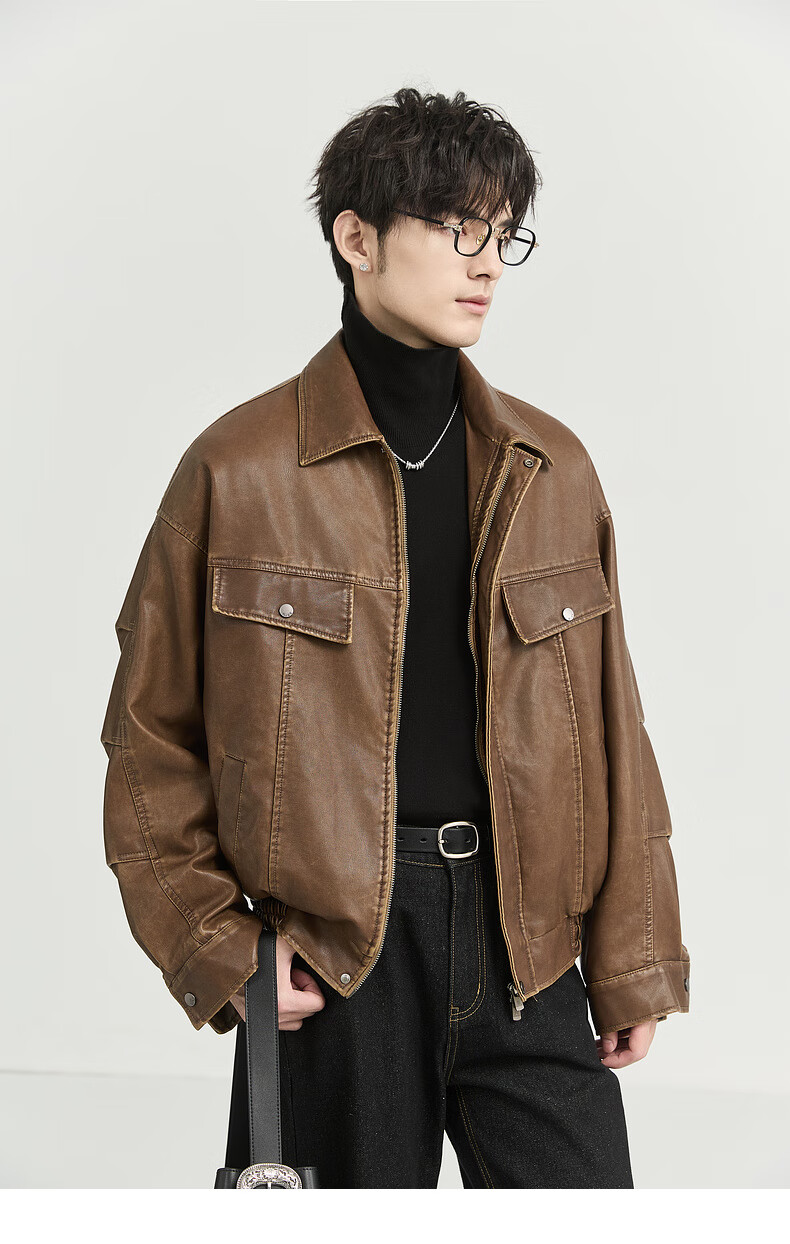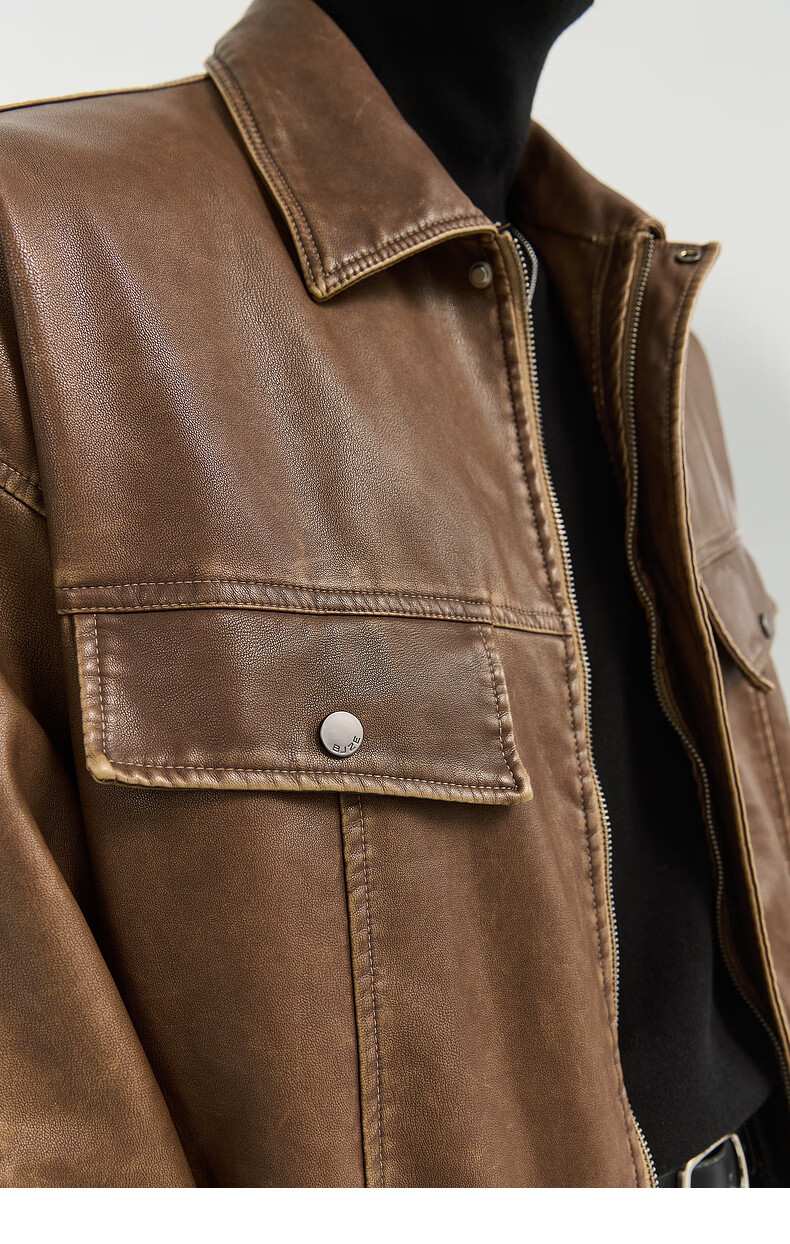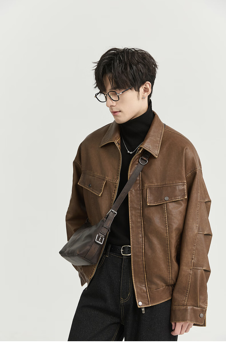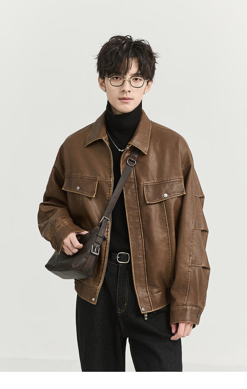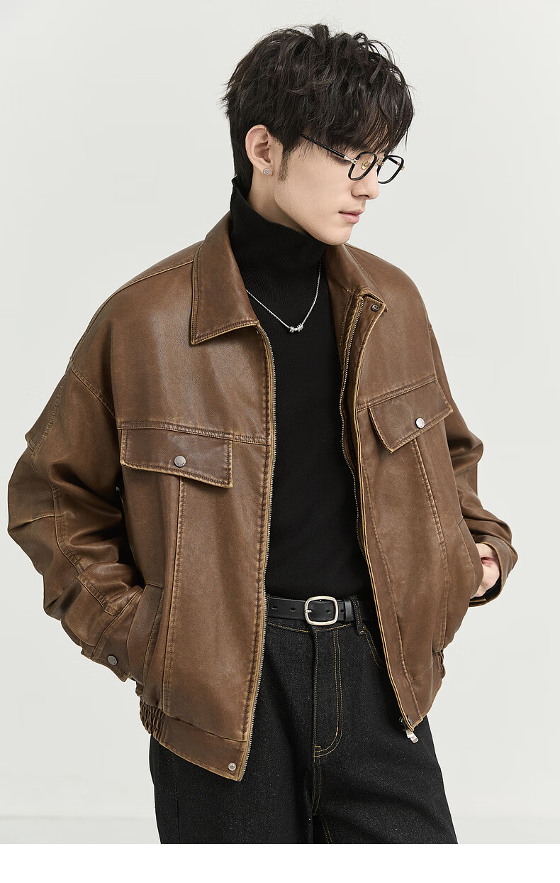 Earl Zall washed and rubbed color cotton PU imitation leather leather jacket men's warm jacket 2024 autumn and winter new style E441658 Root Beer 2XL 185