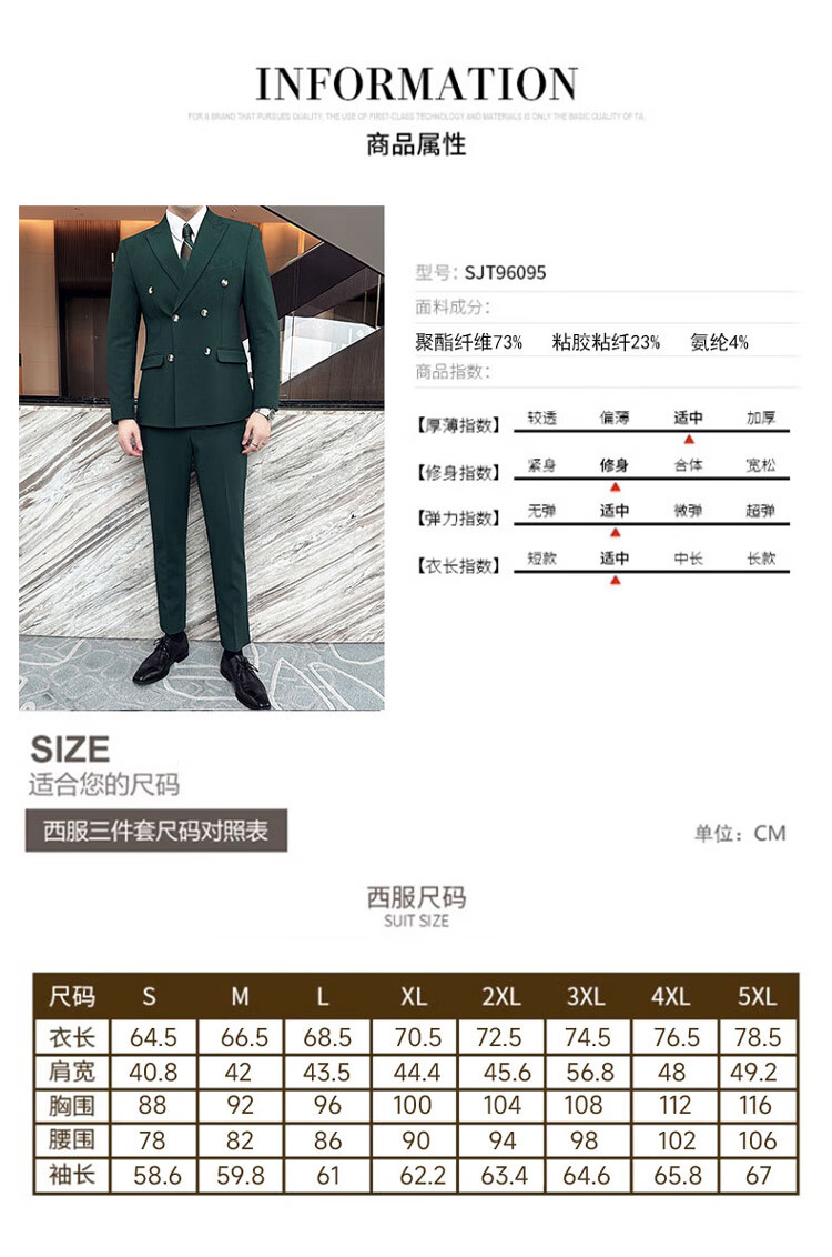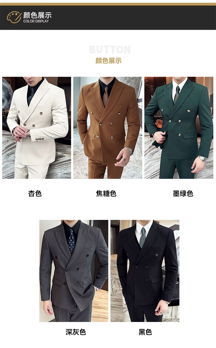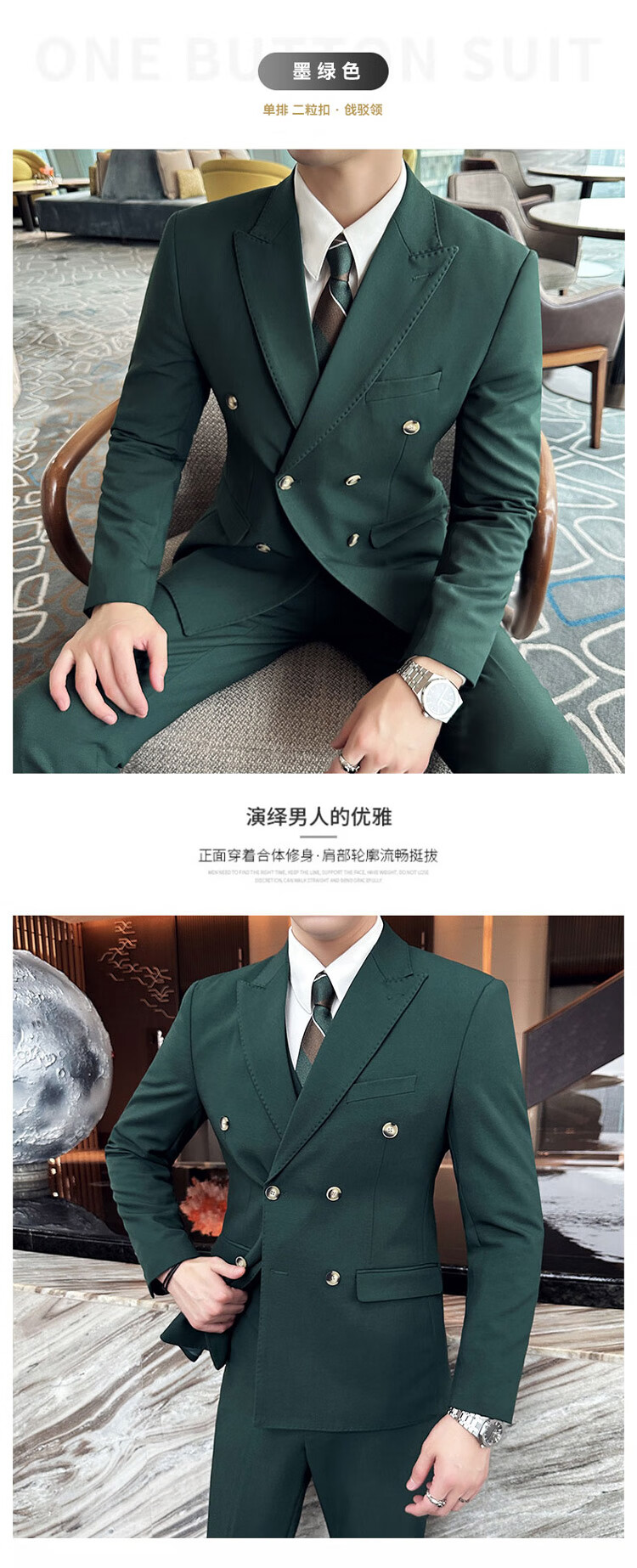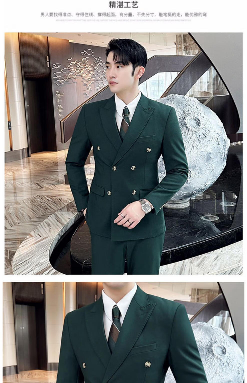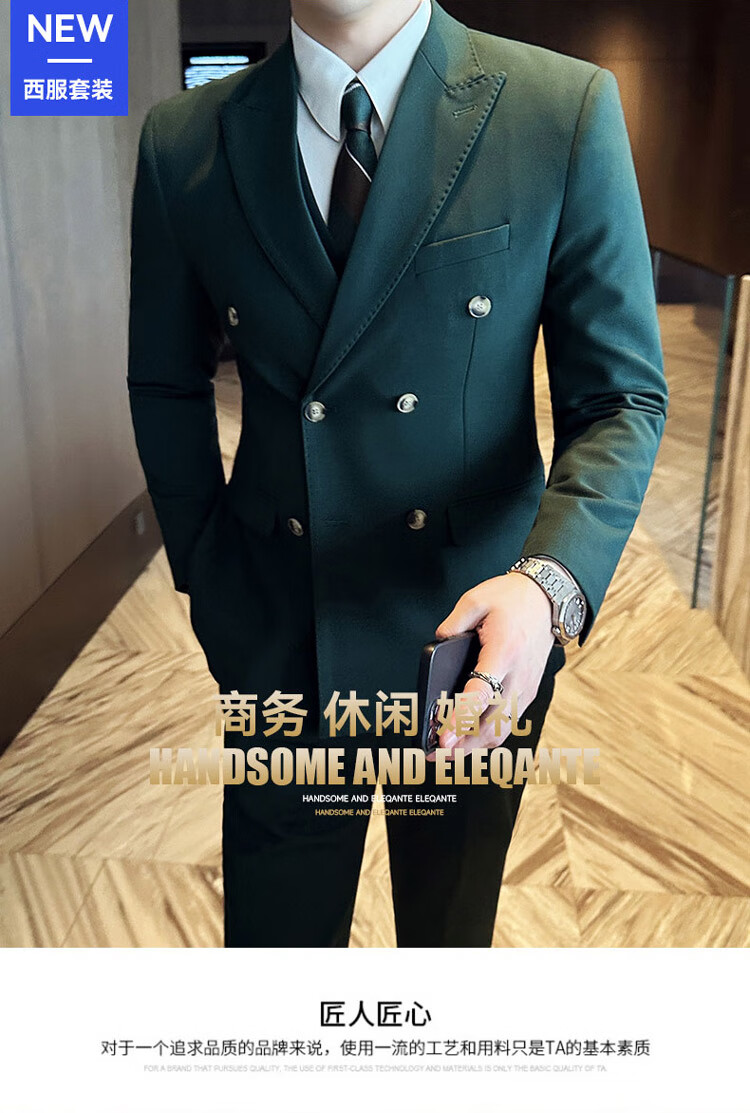 ROMON dark green suit men's suit groom double-breasted suit men's casual slim wedding dress peaked lapel dark green (suit + pants) tie M