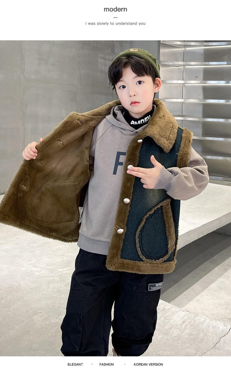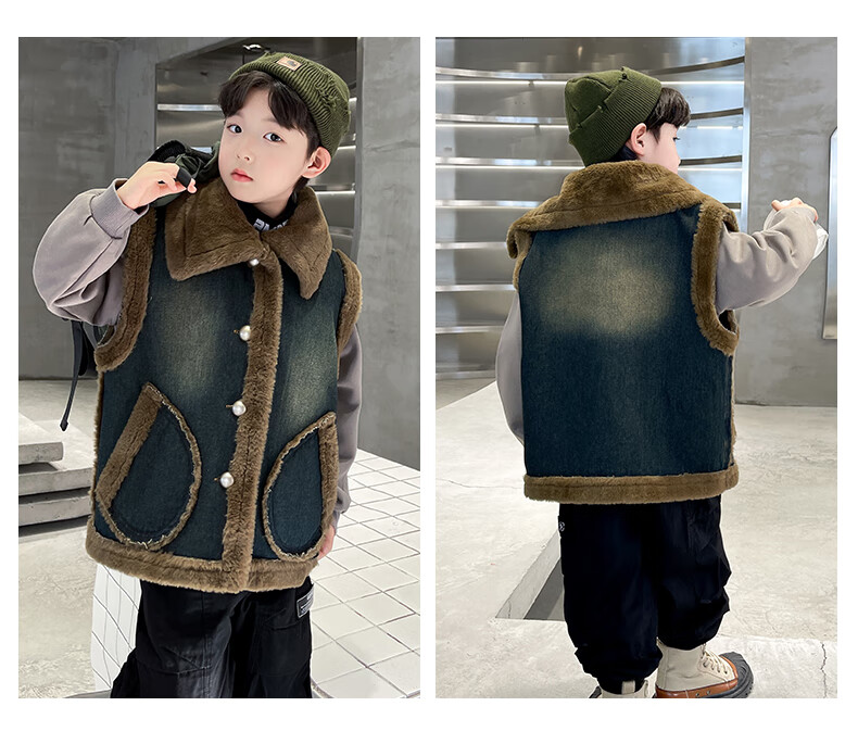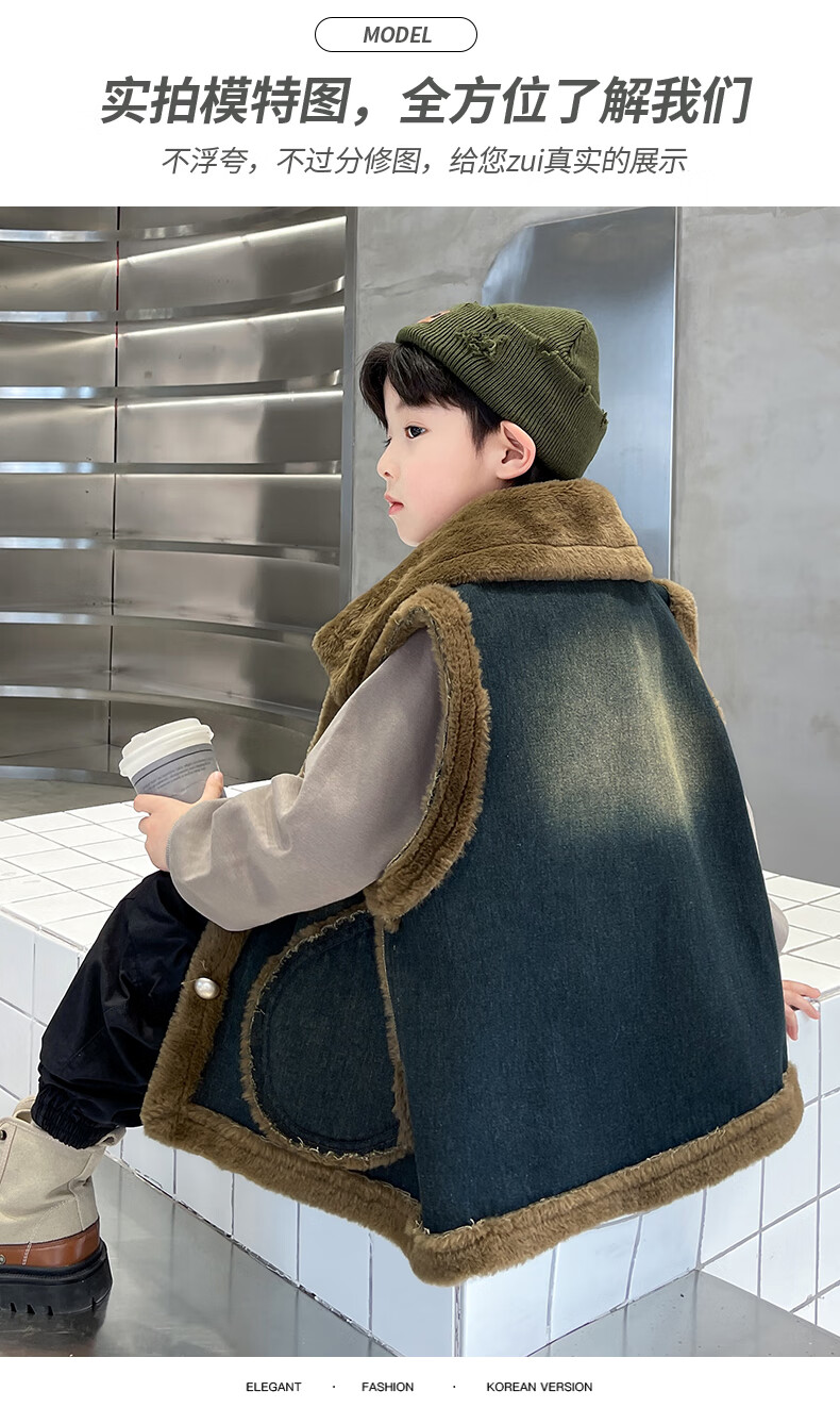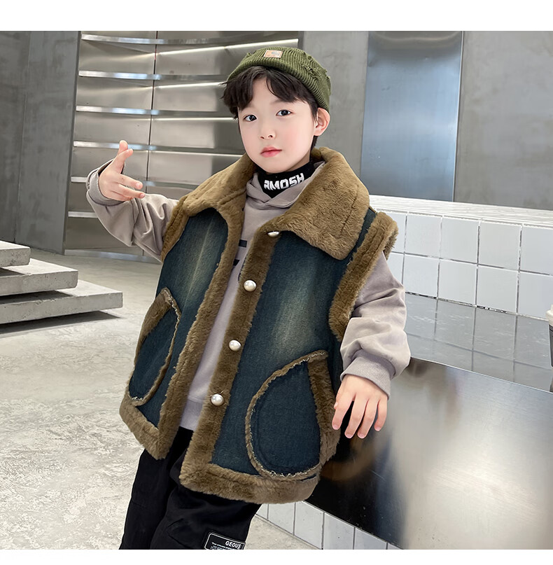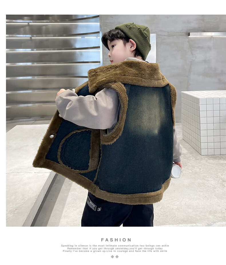 Fairy Tale Classroom Children's Thickened Denim Vest Jacket to Wear 2024 Winter Boys' New Warm Vest for Medium and Large Children Blue 160cm Recommended height is around 145-155cm