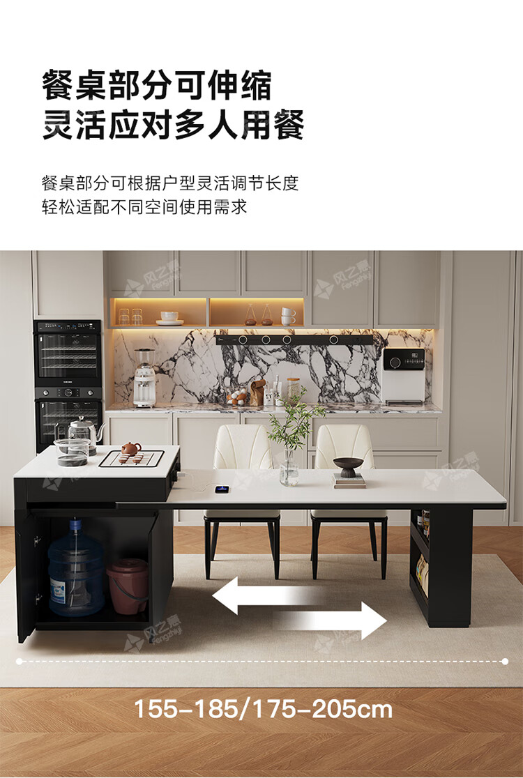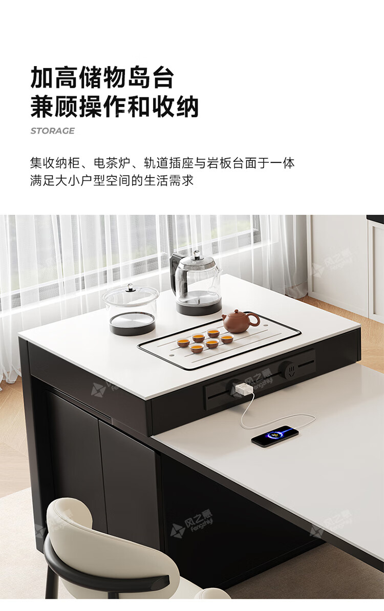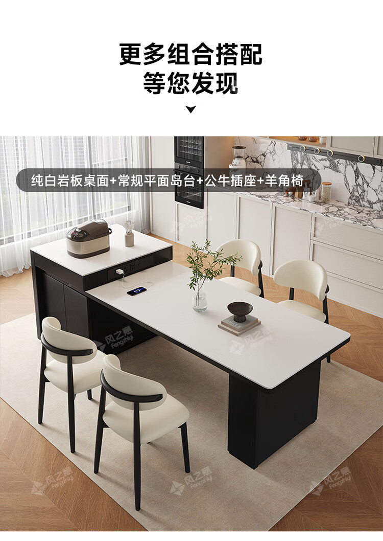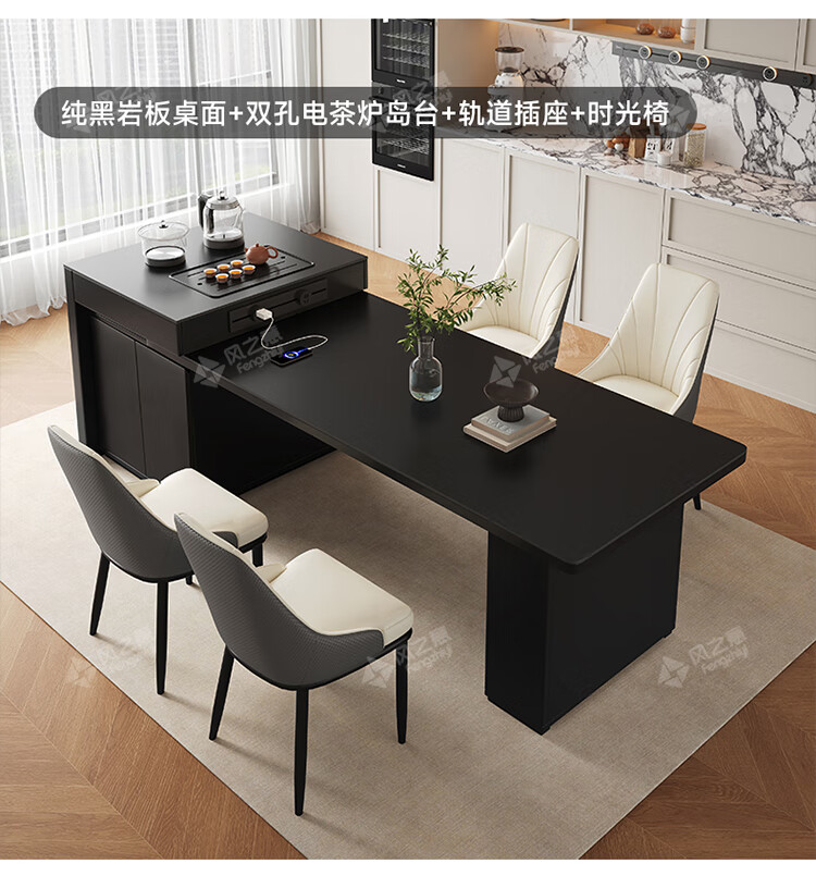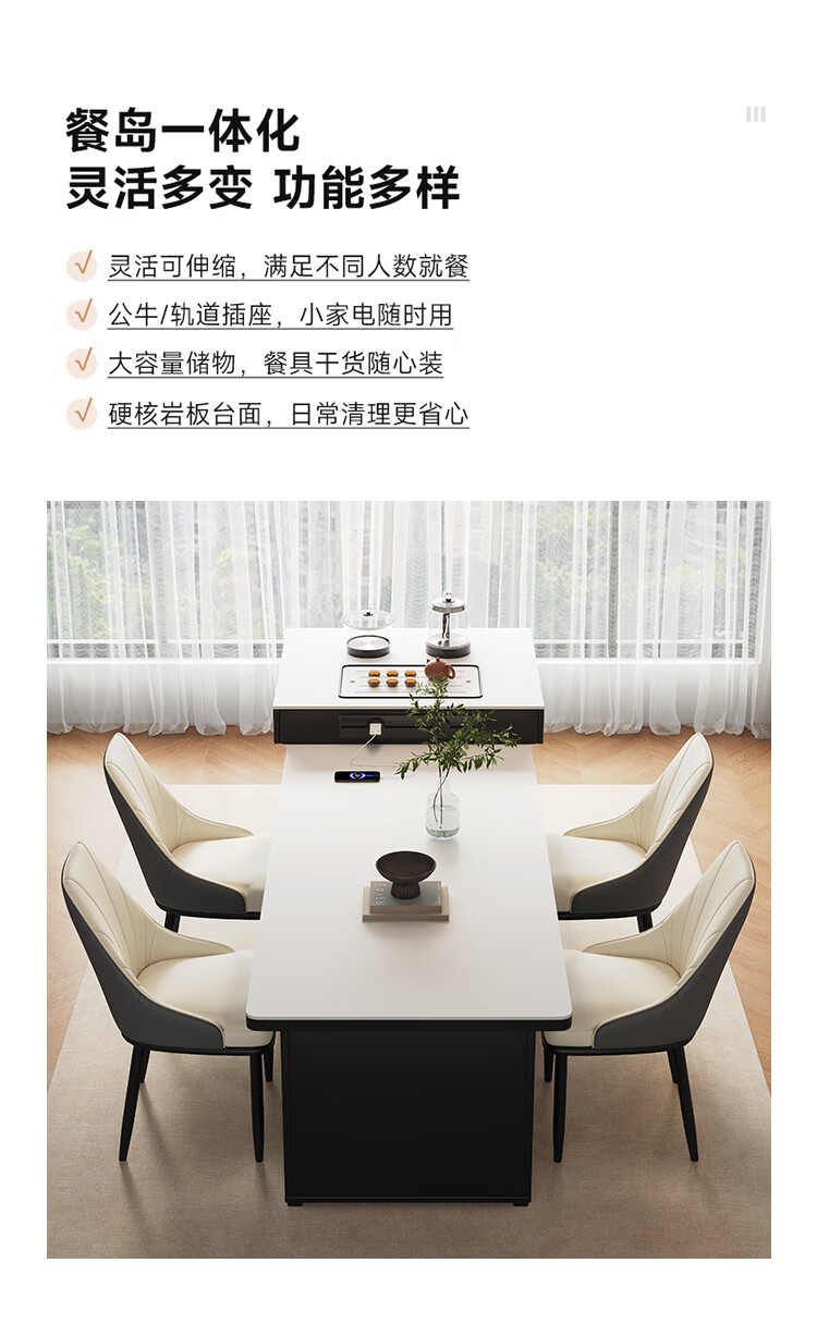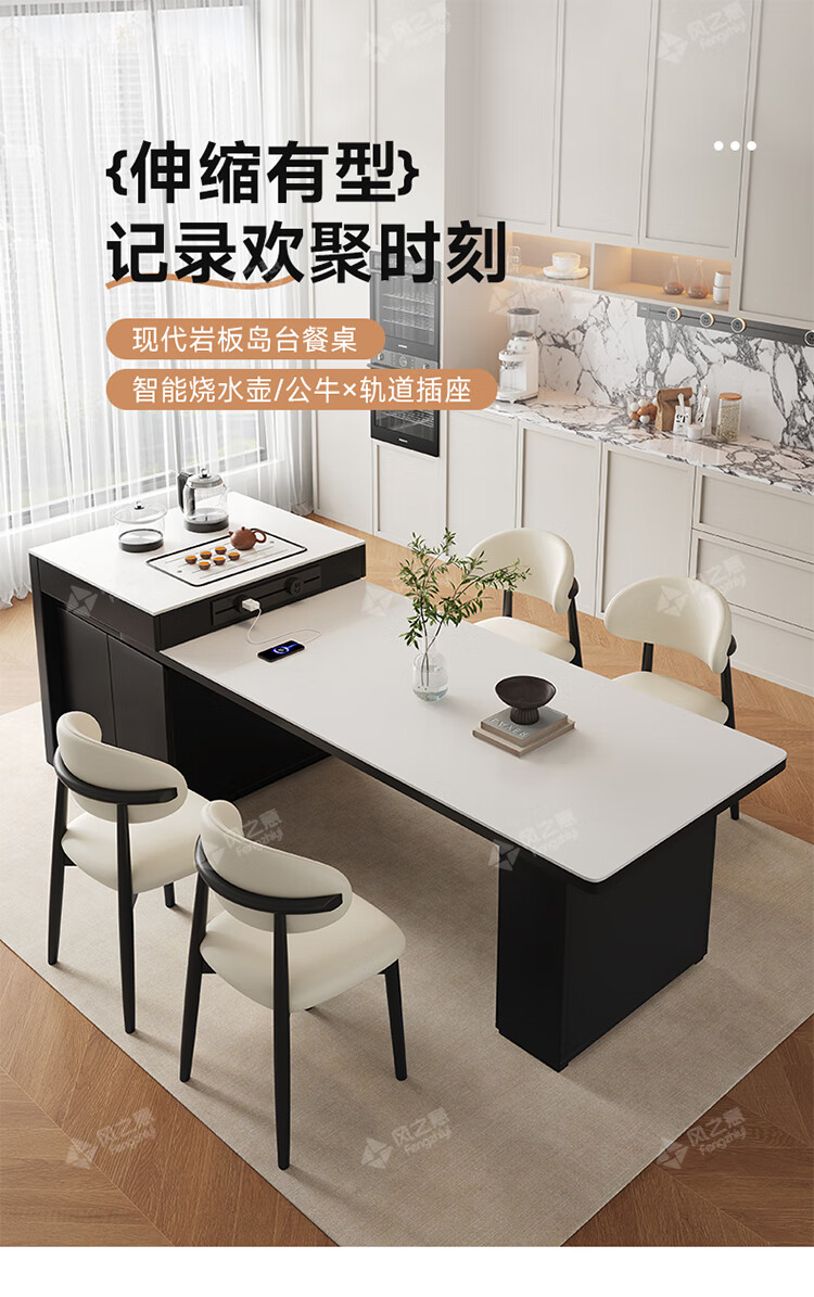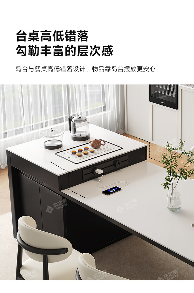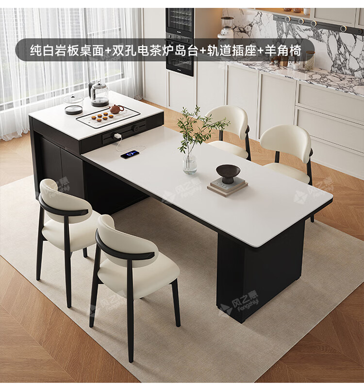 Fengzhiyi solid wood island dining table integrated multi-functional medieval style retractable dining table living room kitchen high-end central guide table LJ-633 retractable island (including cabinet) + horn chair * 4 1.6m (slide rail socket + double hole tea stove)