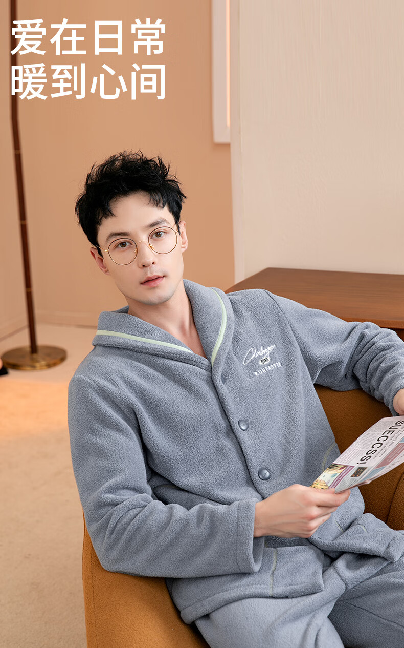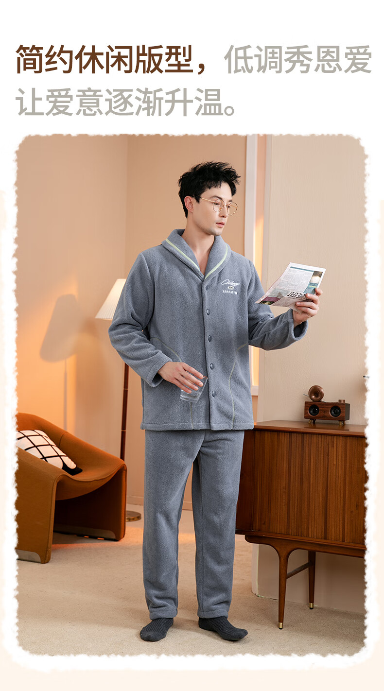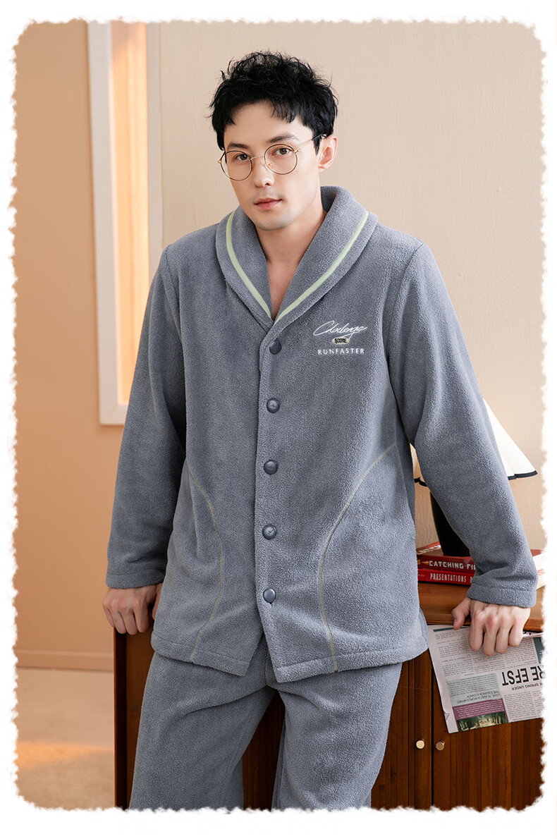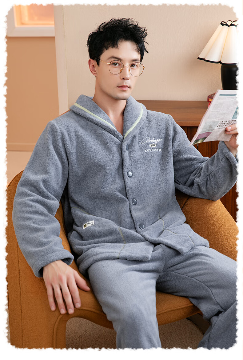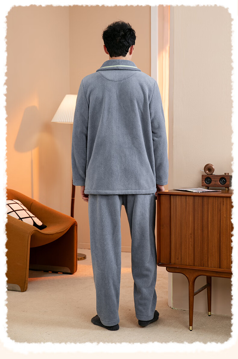 Fenten Couple Pajamas Thickened Double-sided Warm Velvet Autumn and Winter Lapel Long Sleeve Simple Warm Home Clothing Set Light Gray Blue-Men's 2XL