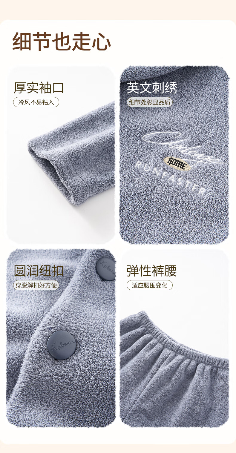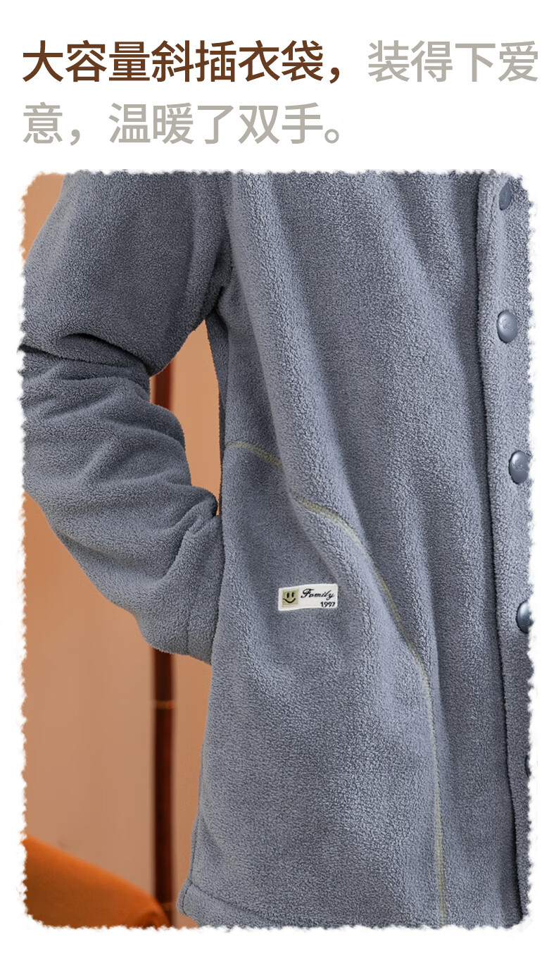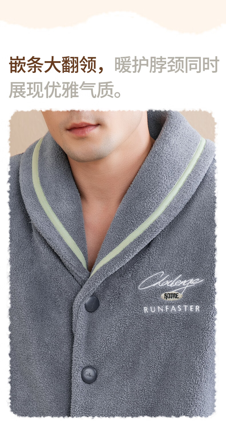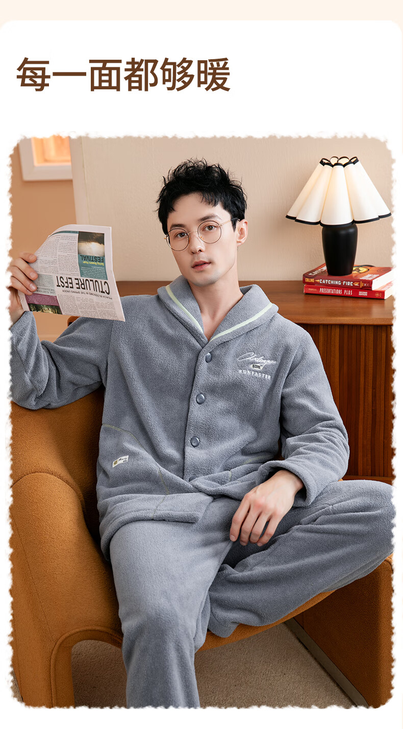 Fenten Couple Pajamas Thickened Double-sided Warm Velvet Autumn and Winter Lapel Long Sleeve Simple Warm Home Clothing Set Light Gray Blue-Men's 2XL