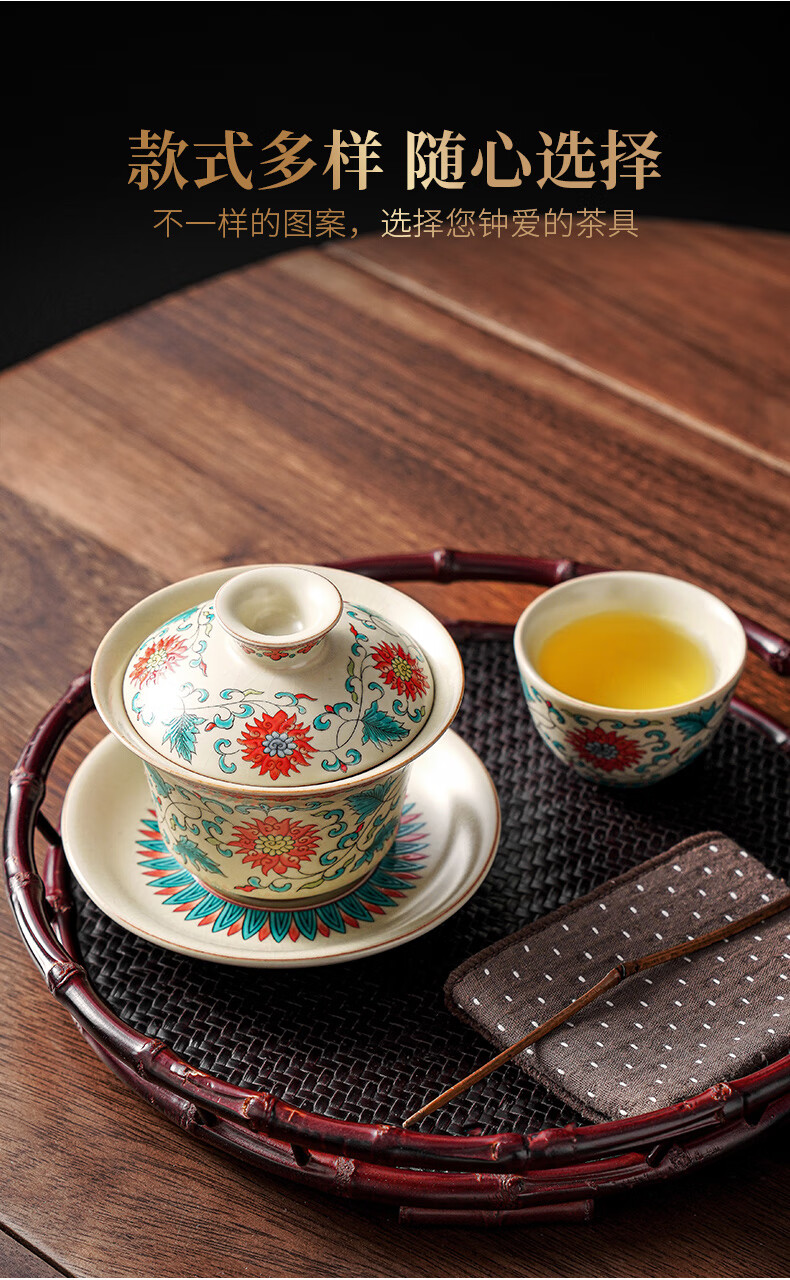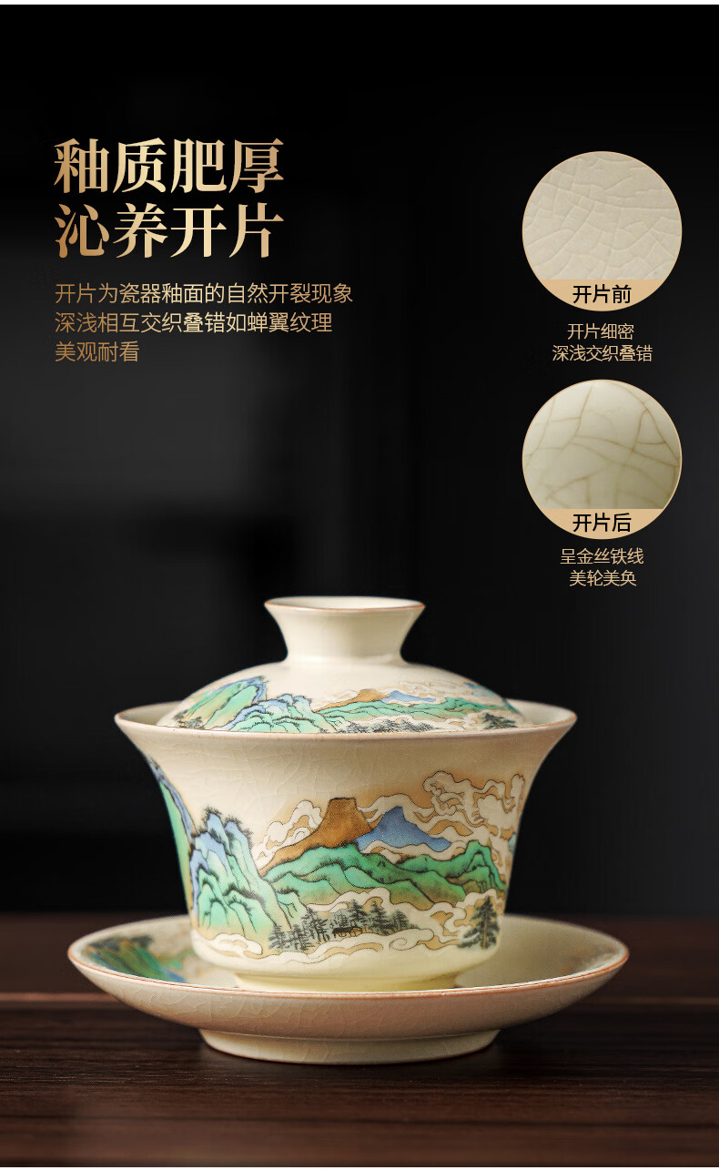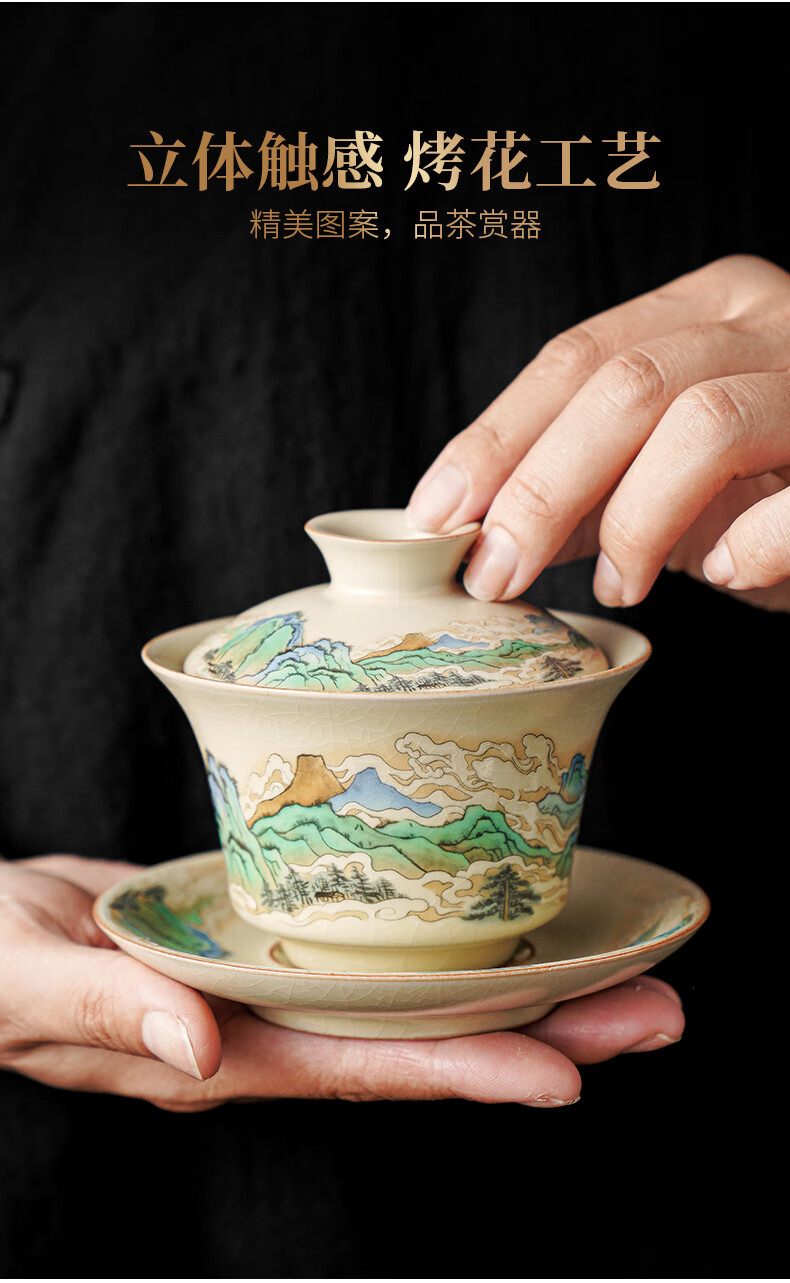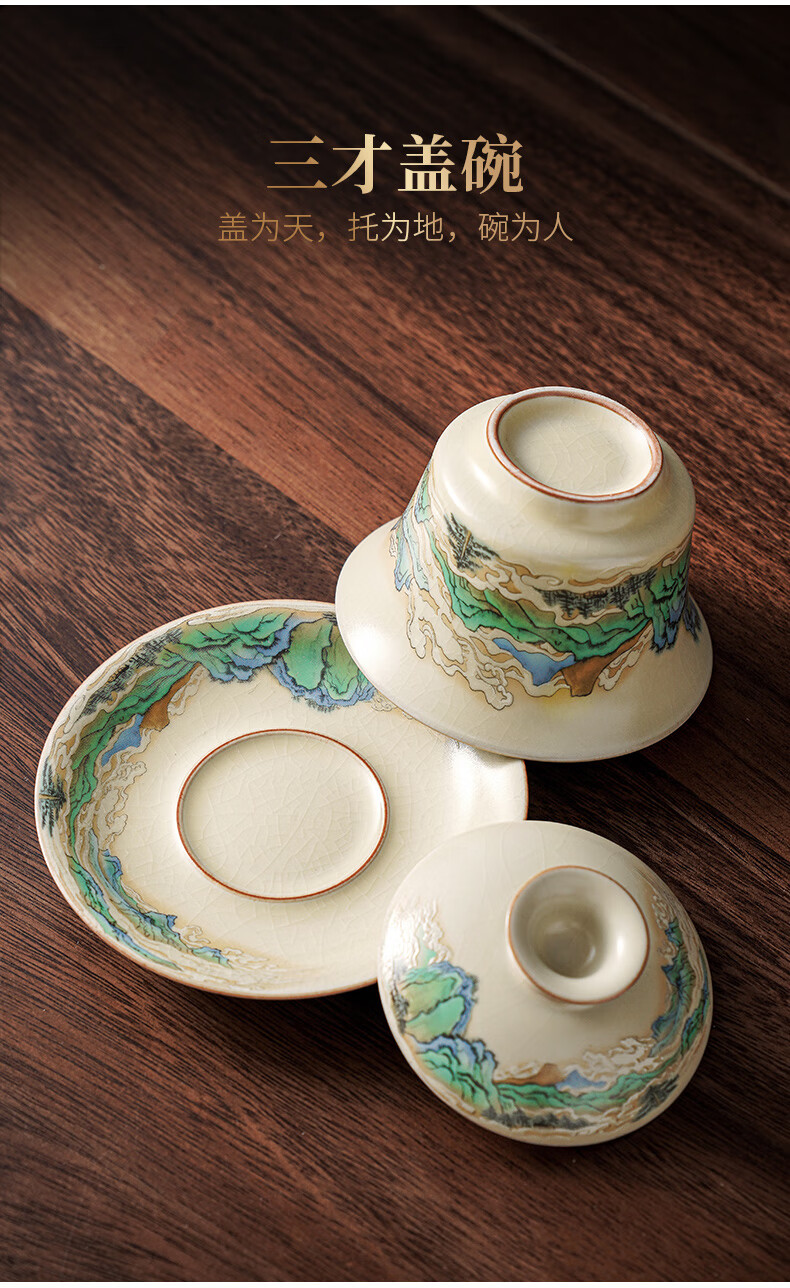 Qixuanyuan Ru kiln Sancai covered bowl tea cup single high-end tea cup anti-scalding with lid fair cup three-piece tea set set mutton fat jade porcelain covered bowl + Ruyi two cups + male cup tea tray