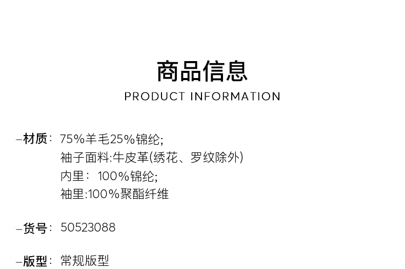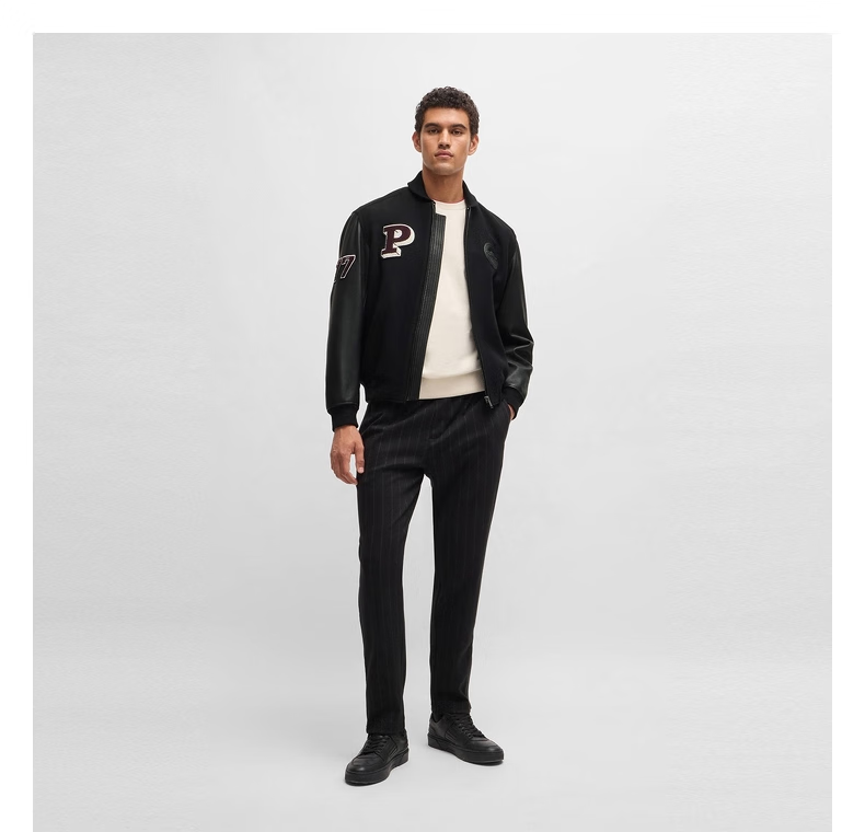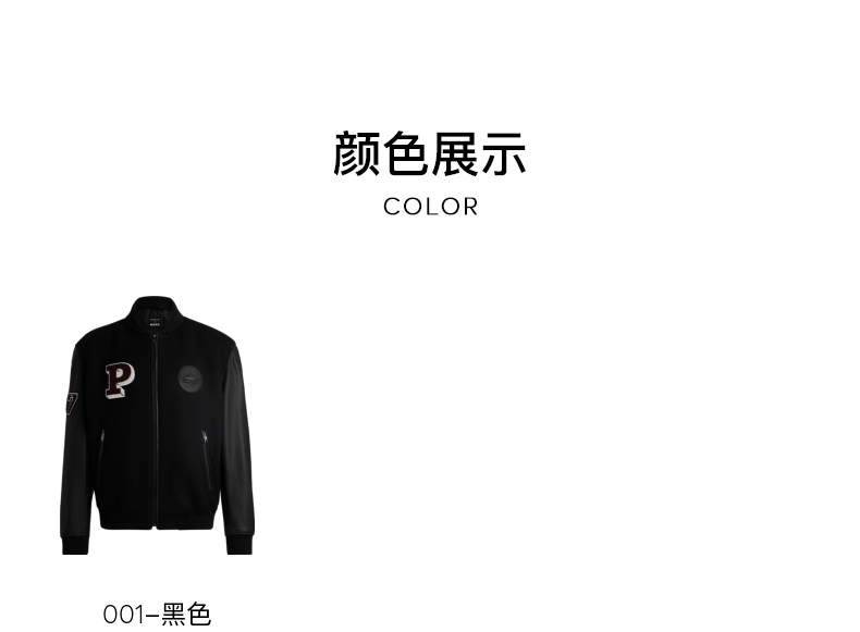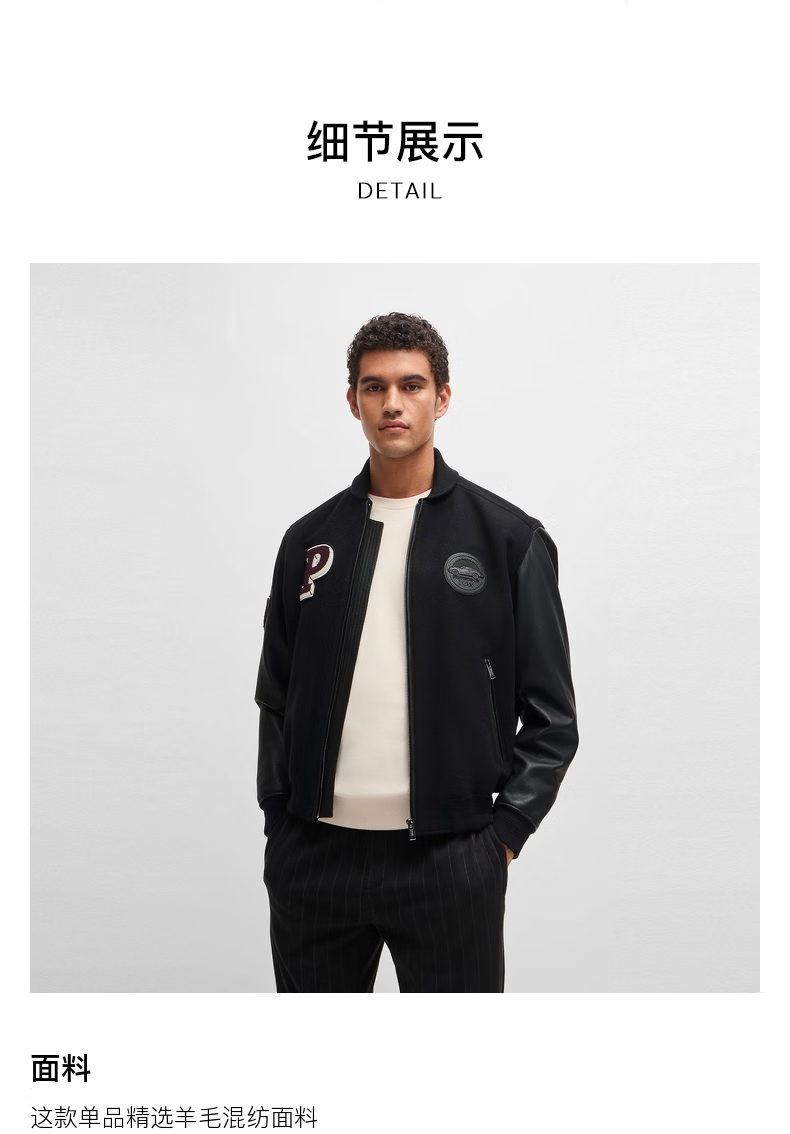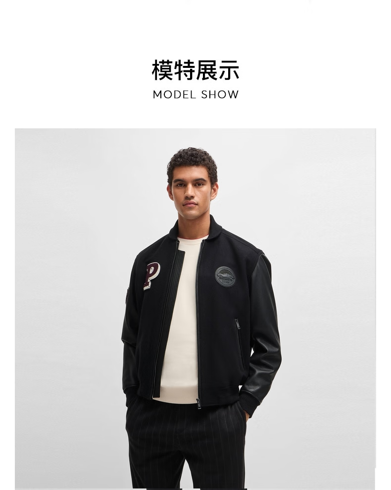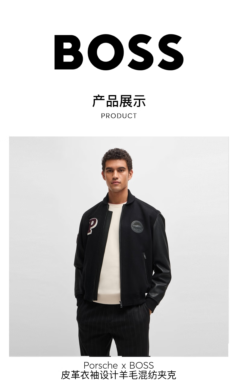 BOSS Porsche co-branded BOSS men's 2024 autumn leather sleeve design wool blend jacket 001-black 46