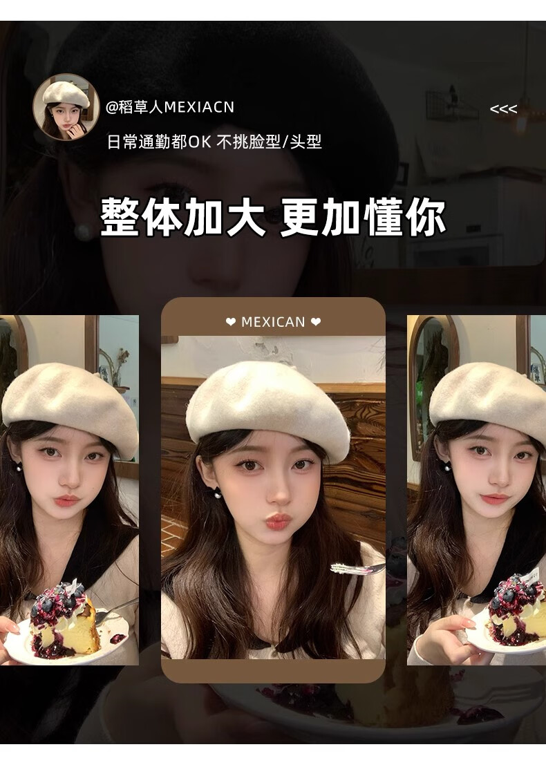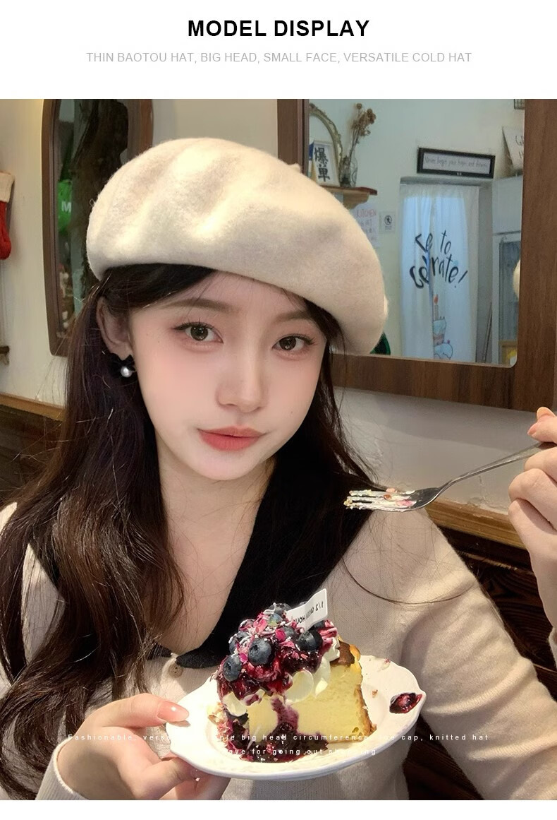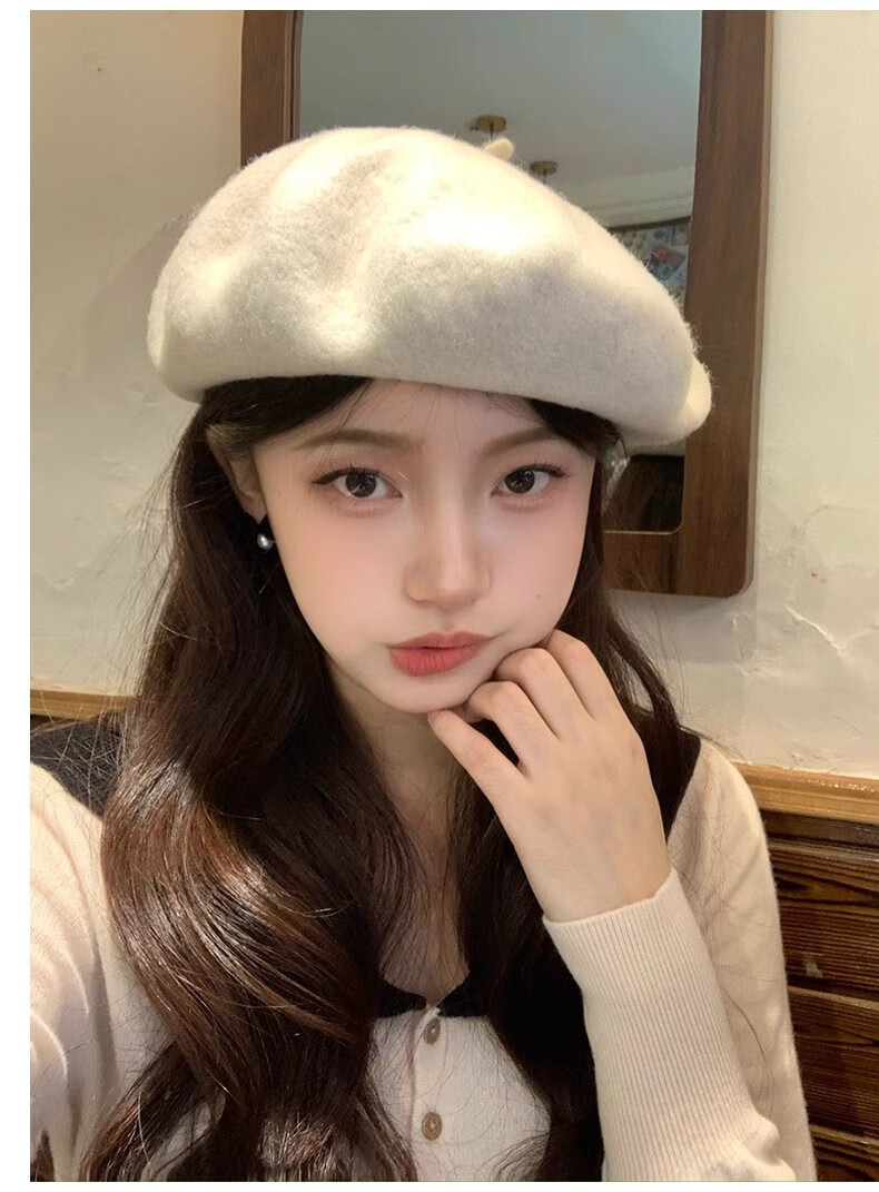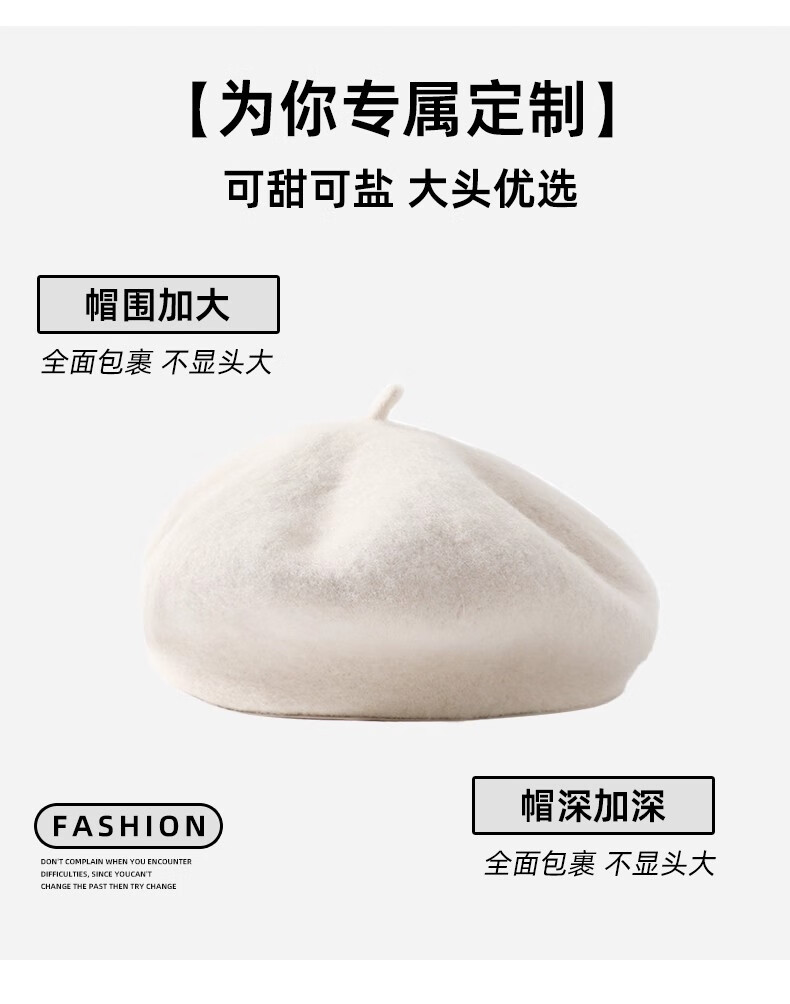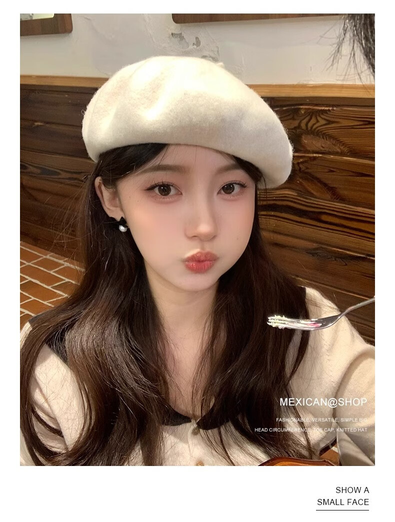 Scarecrow Beret 2024 Autumn and Winter New Wool Fashion Big Head Hat Retro Face-Showing Little Painter Hat Beige Milky White - Upgraded Big Head Circumference (Suitable for 56-62 Big Head Circumference) One Size