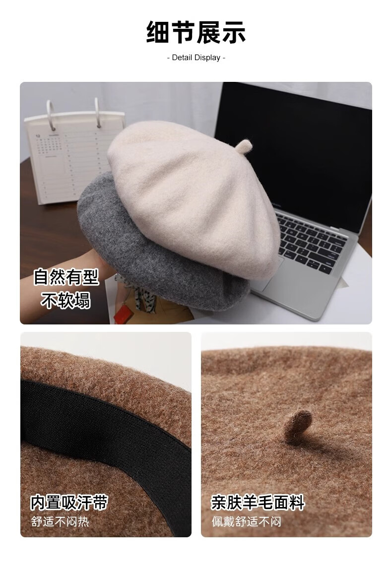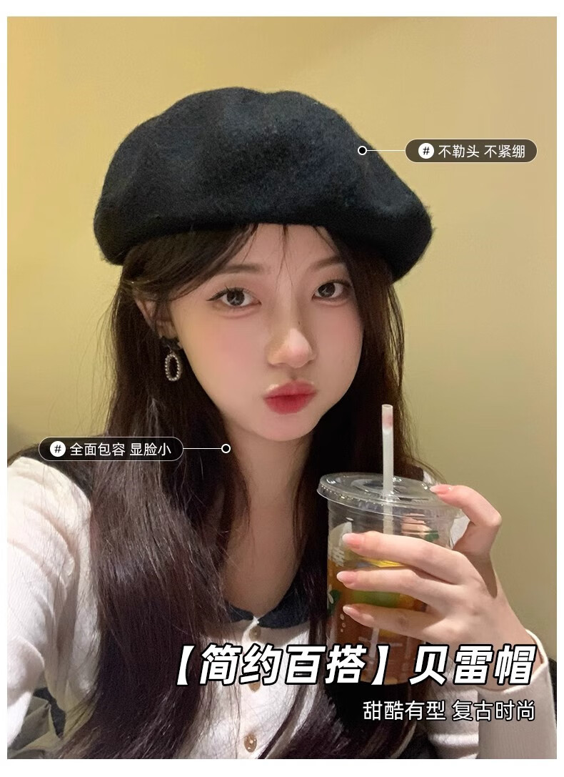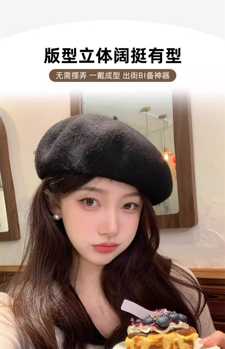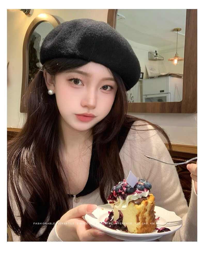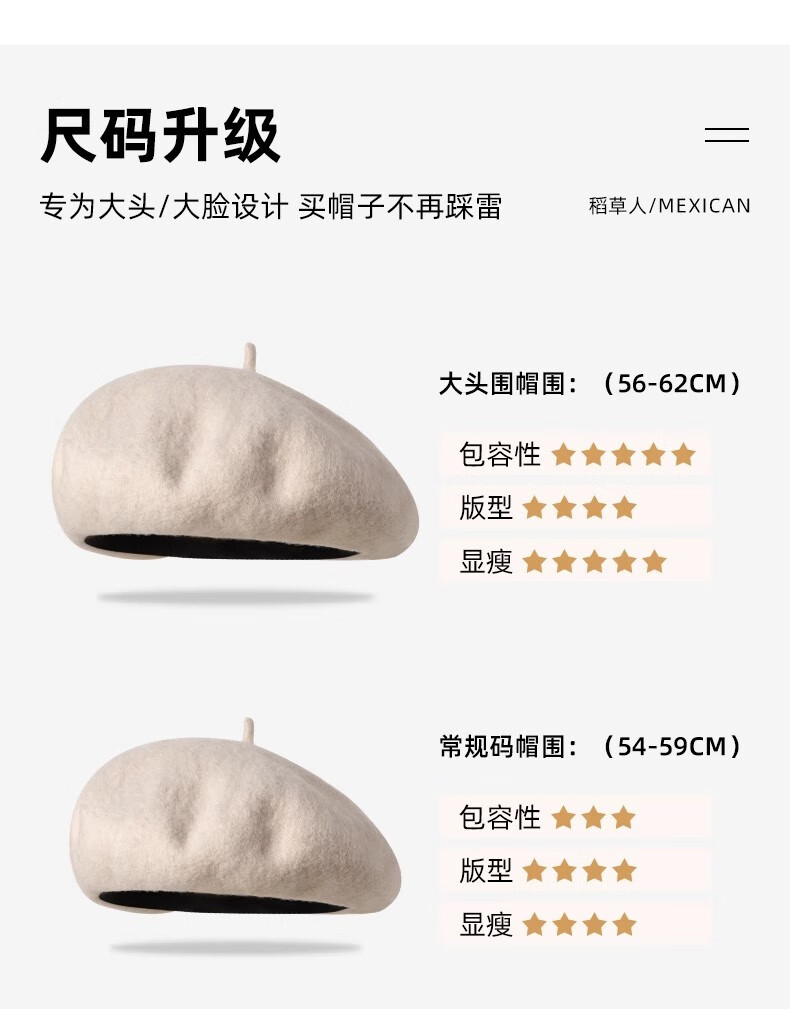 Scarecrow Beret 2024 Autumn and Winter New Wool Fashion Big Head Hat Retro Face-Showing Little Painter Hat Beige Milky White - Upgraded Big Head Circumference (Suitable for 56-62 Big Head Circumference) One Size