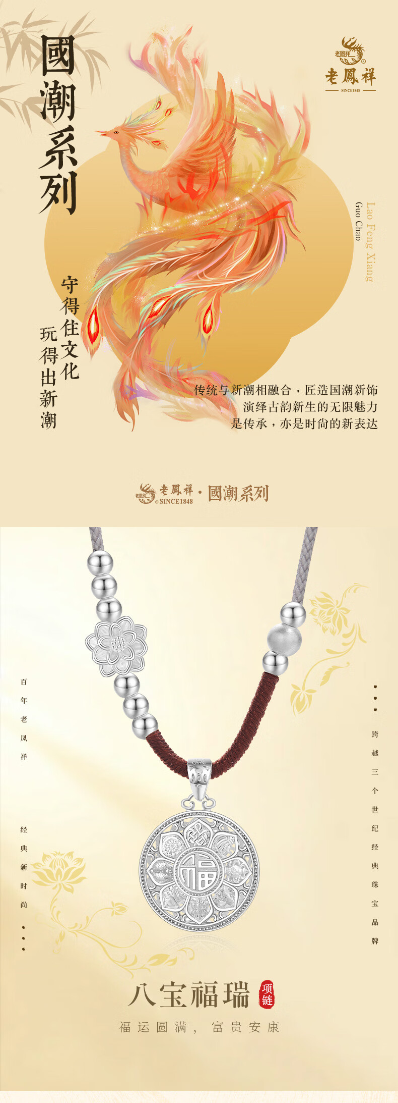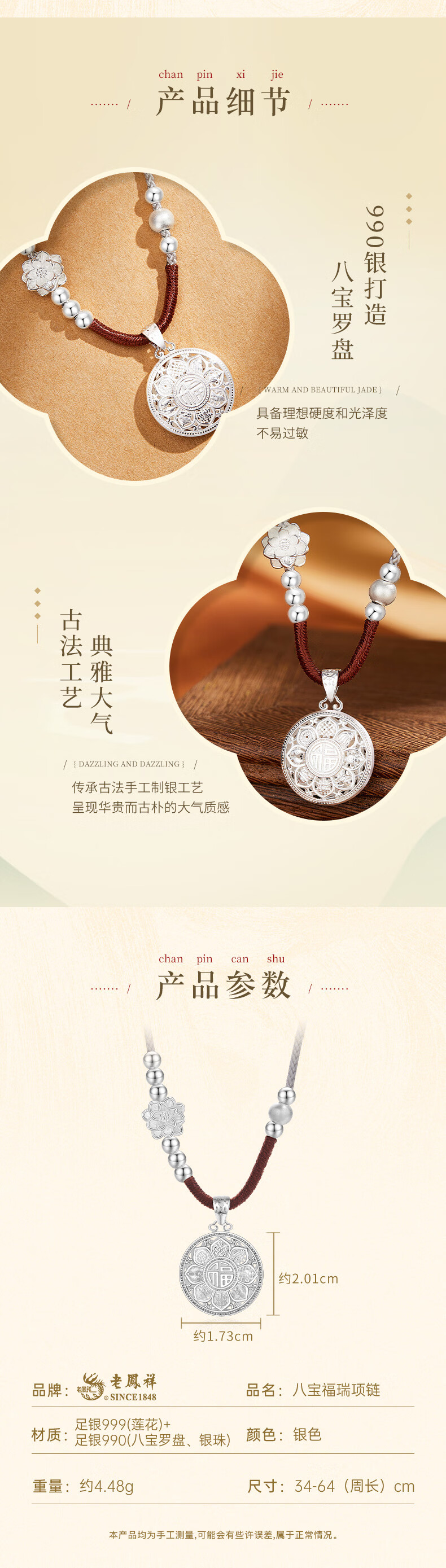 Lao Fengxiang Eight Treasures Compass Pure Silver Necklace Pure Silver Women's Pendant High-end Anniversary Birthday Gift for Girlfriend and Wife 990 Pure Silver*Eight Treasures Furui Necklace*Brand Gift Box
