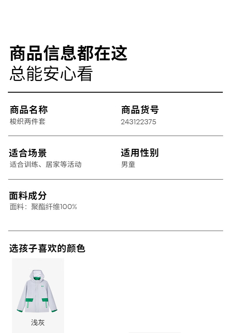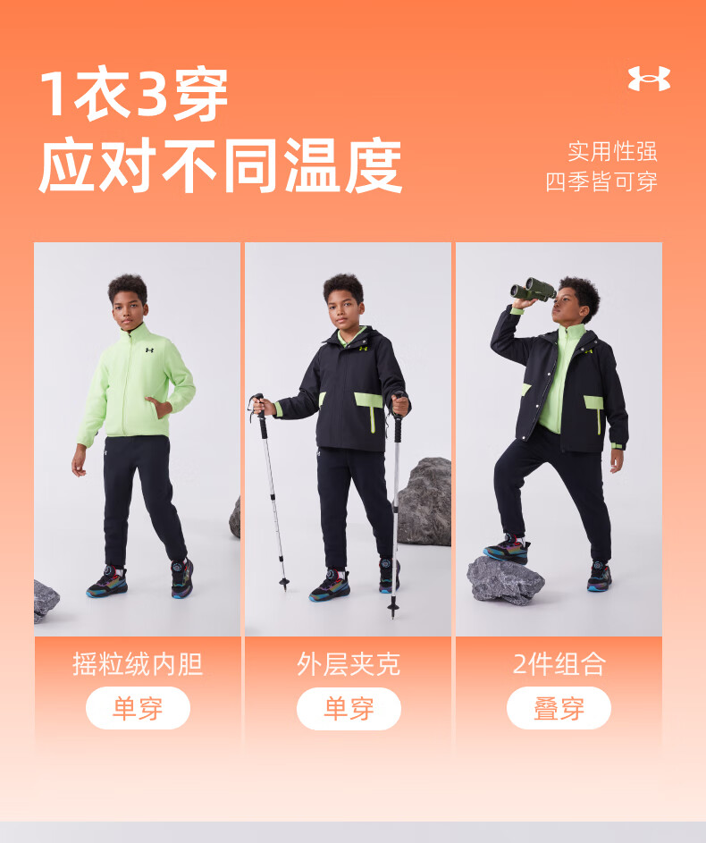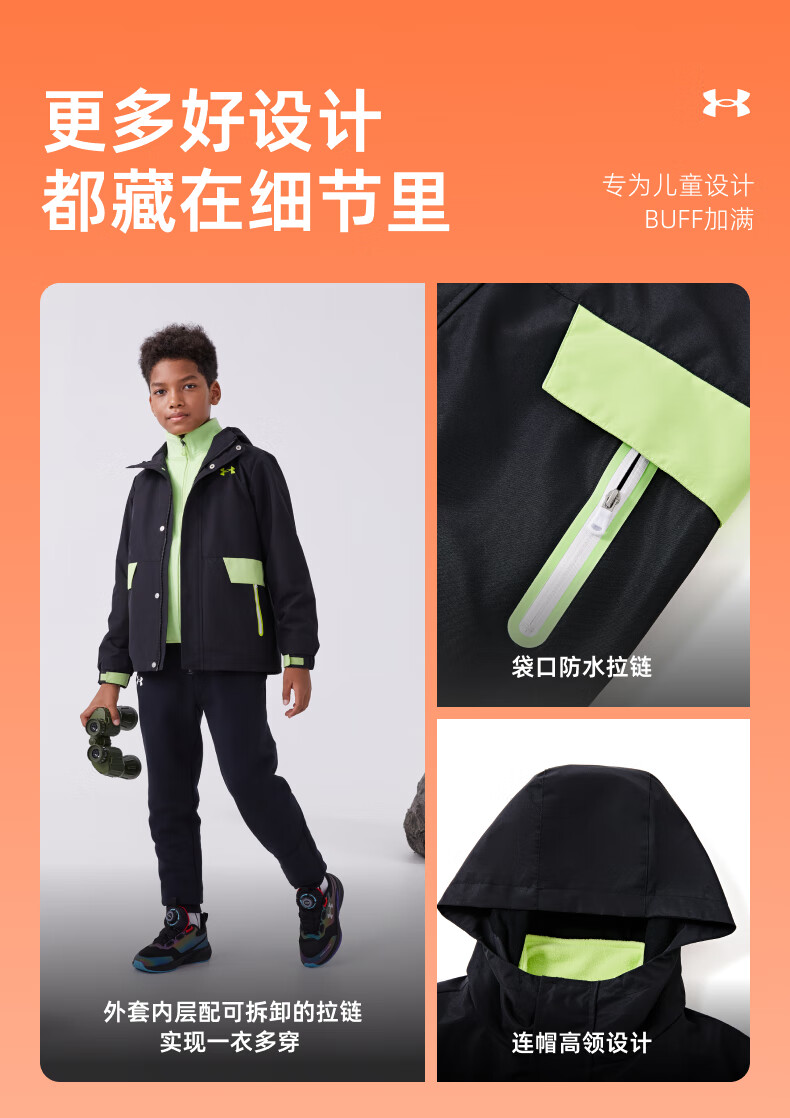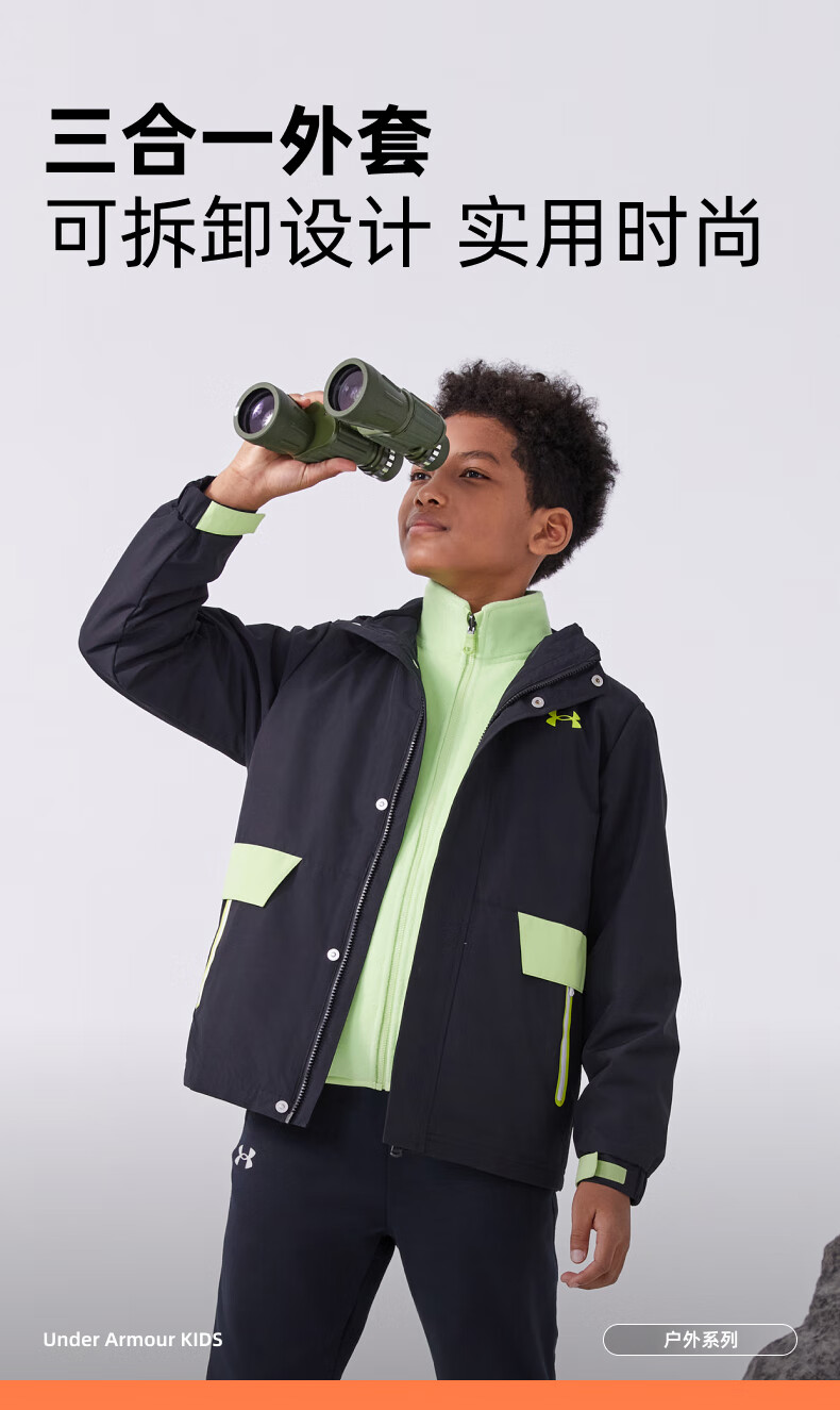 Under Armor children's clothing children's woven outdoor two-piece set for boys and girls hooded spring detachable jacket 244122340 black/grey 170
