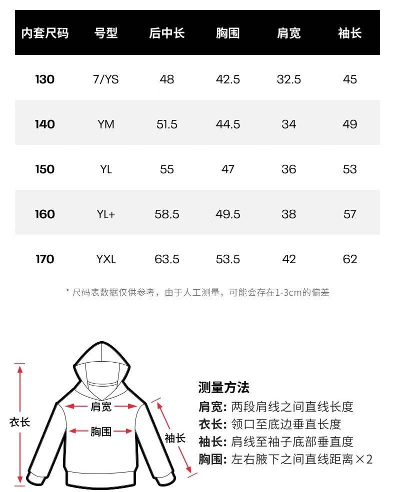 China (cm) 165 / 88-90 170 / 96-98 175 / 108-110 180 / 118-122 185 / 126-130