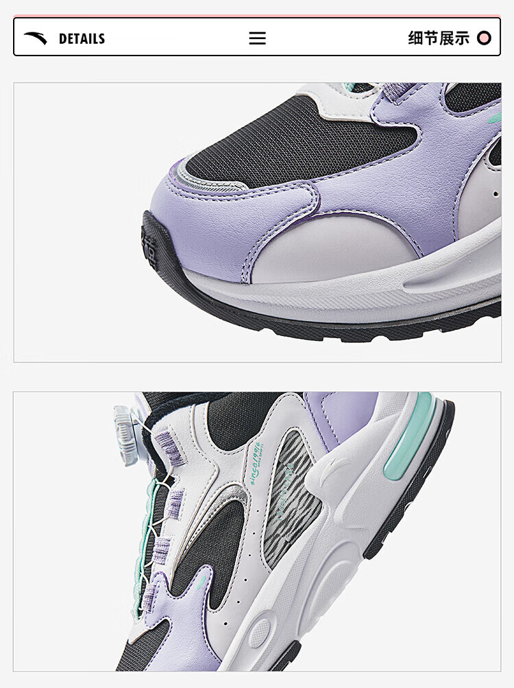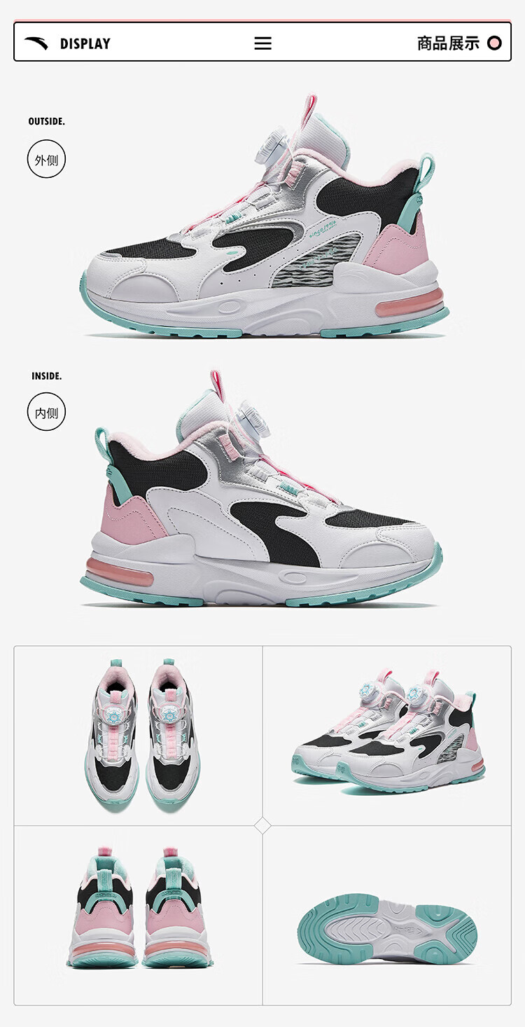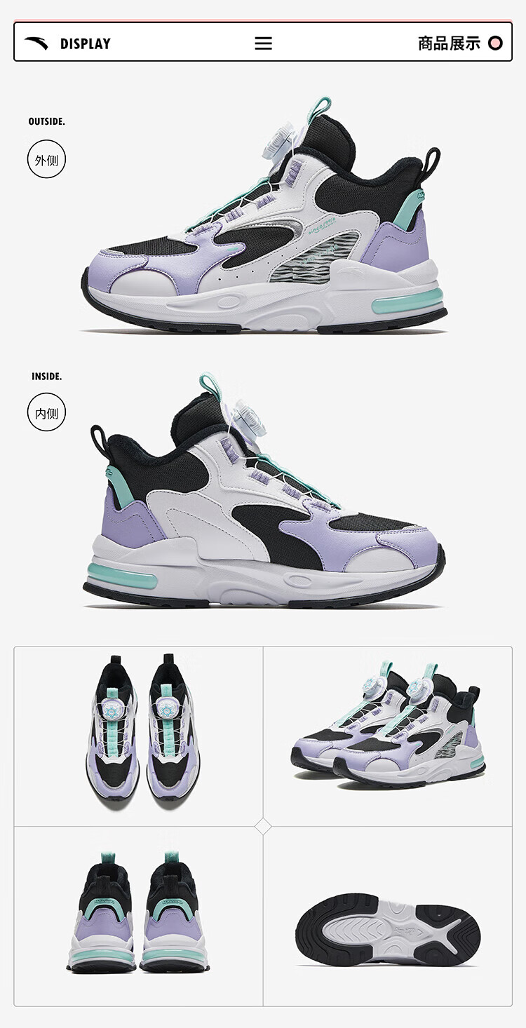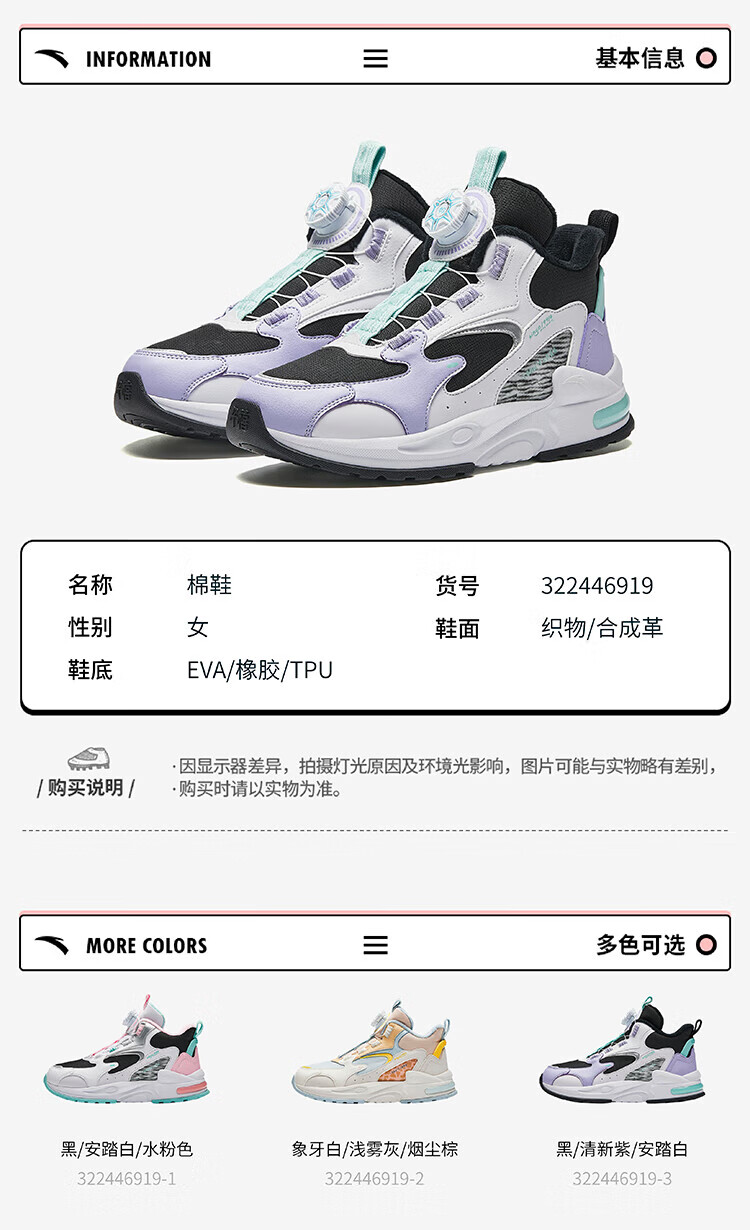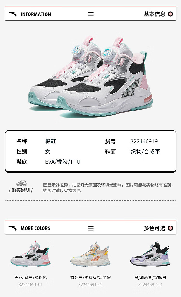 ANTA Children's Cotton Shoes for Men and Women Big Kids' Shoes 2024 Winter Plus Velvet Warm Knob Buckle Snow Non-Slip Succulent Cotton Boots Women's Leather Black/Fresh Purple/White 6919N-2 36