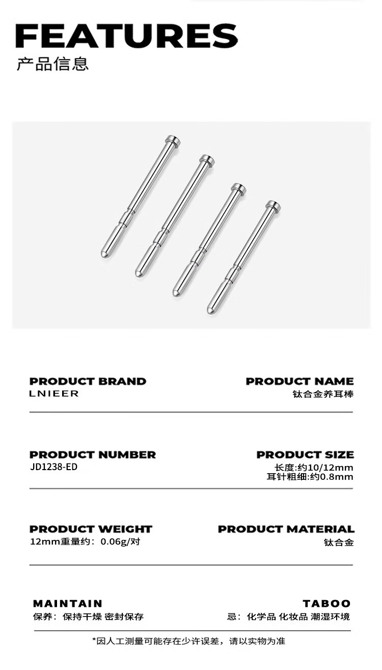 LnieerF136 medical titanium alloy ear sticks, earrings, women's ear piercing earrings, ear bone nails, men's mini invisible anti-blocking needle earrings, 1 pair, 10mm ear sticks, titanium alloy