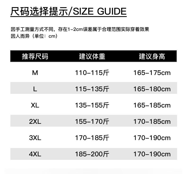 China (cm) 160-165/84-86 165-170 / 88-90 167-172 / 92-96 168-173 / 98-102 170-176 / 106-110