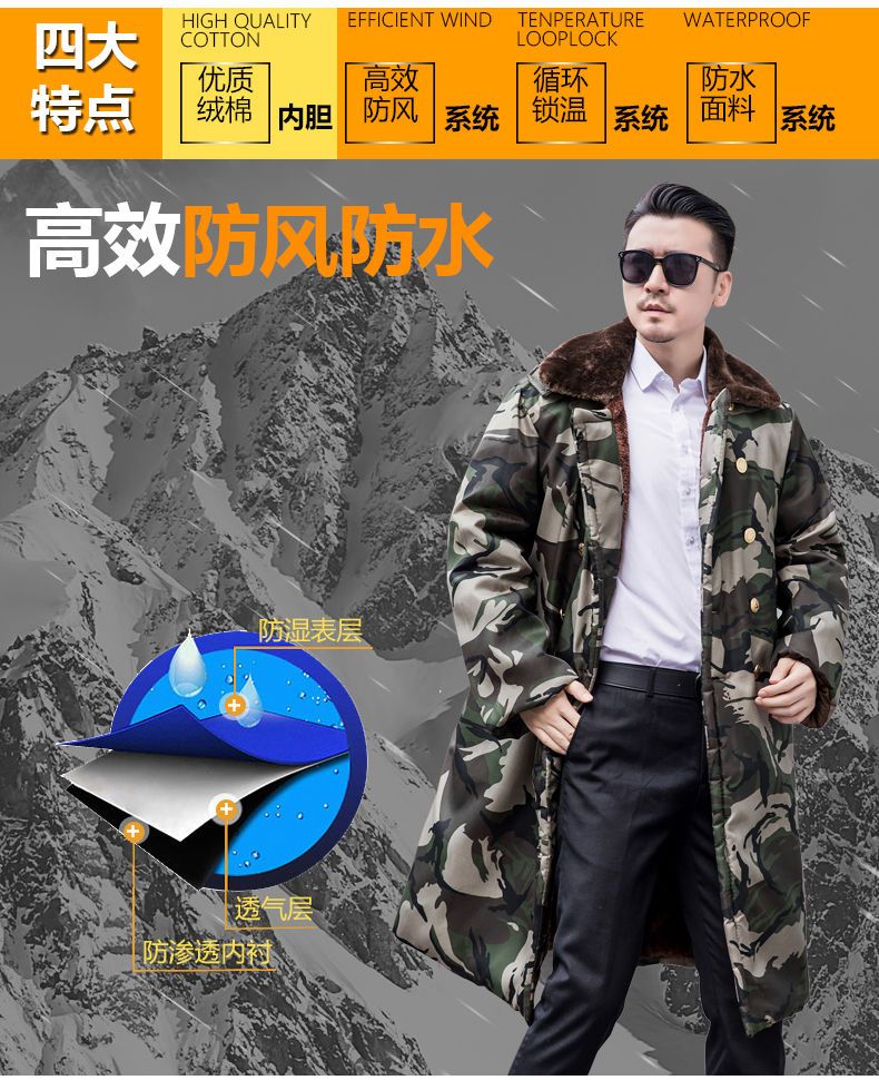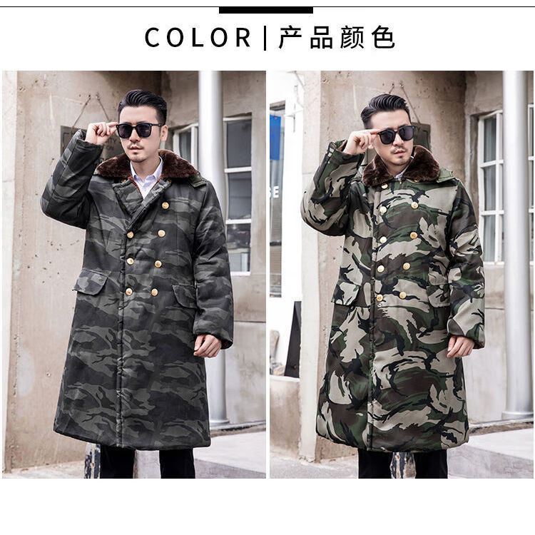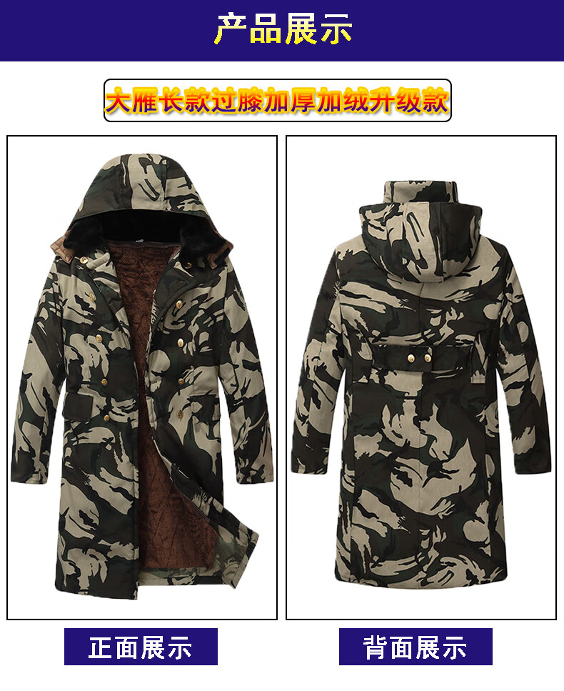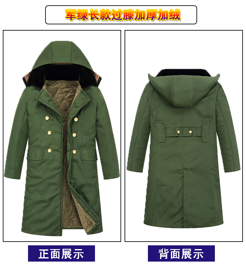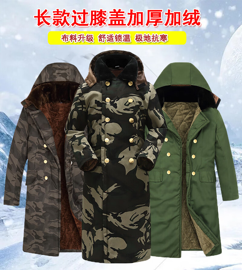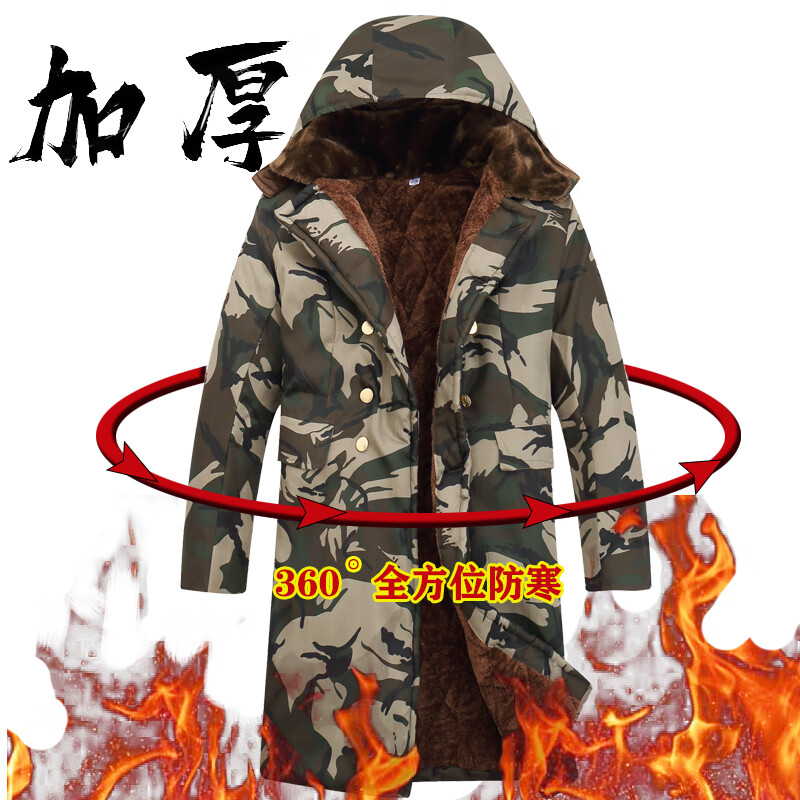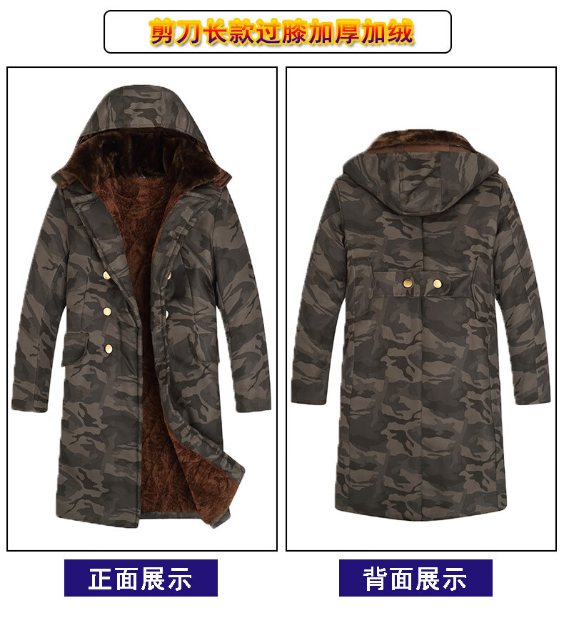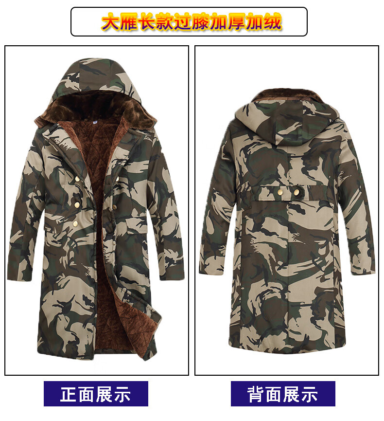 Hengyuanxiang camouflage cotton coat men's winter thickened middle-aged cotton coat plus velvet cotton coat cold storage cold-proof cotton jacket overalls waterproof extra-long military green (to the middle and lower calf) small size (suitable for 100-130Jin Jin equals 0.5 kg)