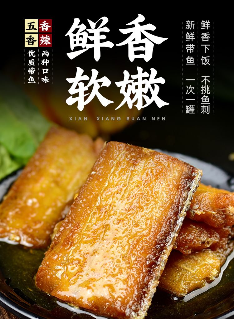 Five-spice and spicy canned hairtail to satisfy your cravings. Snacks. Quick cooked meals. Crispy seafood. Instant food. Spicy Internet celebrity. Delicious. Canned five-spice hairtail. 1 can.