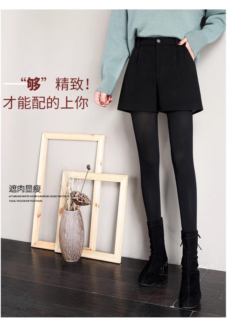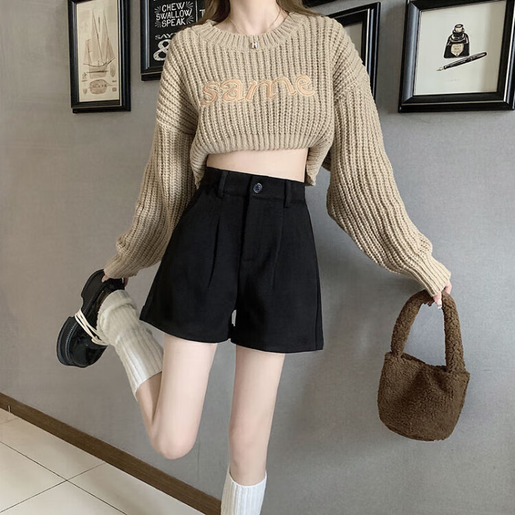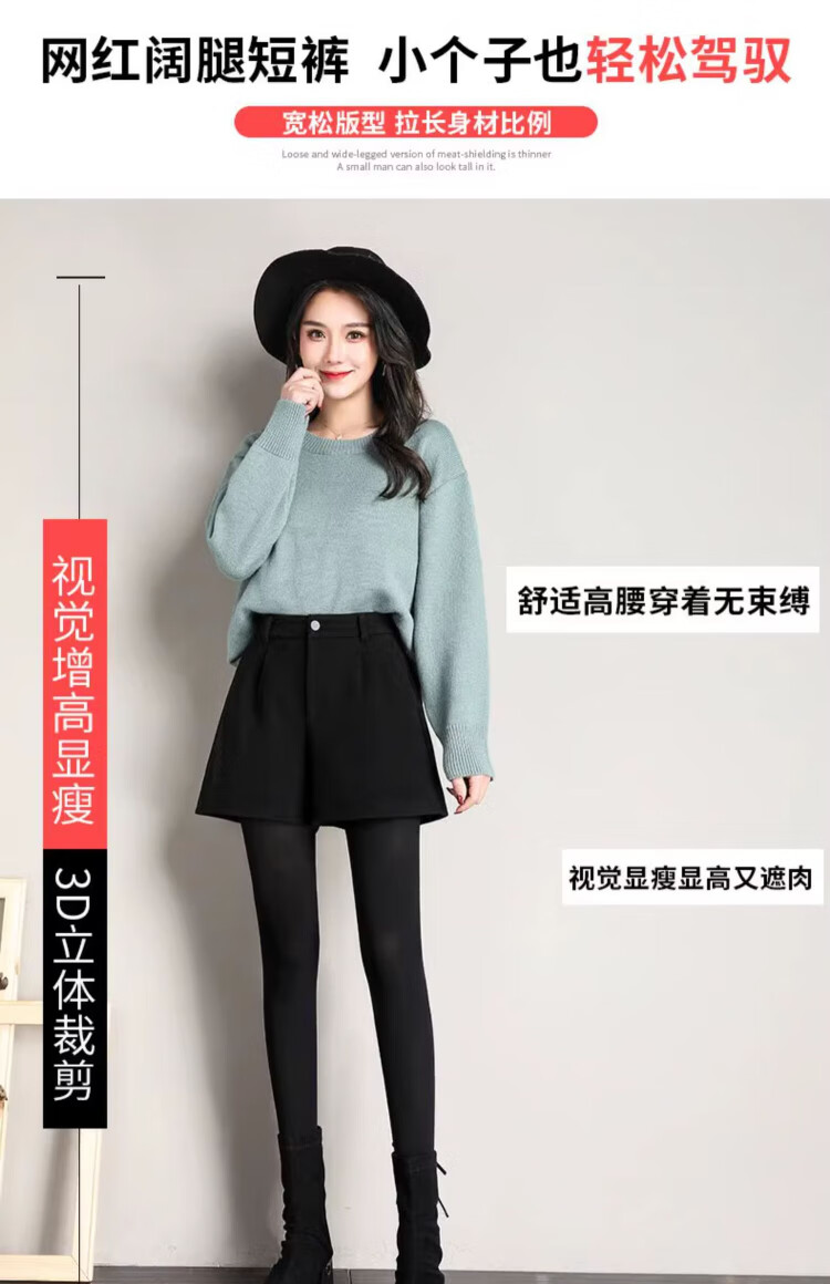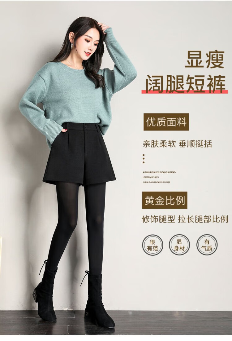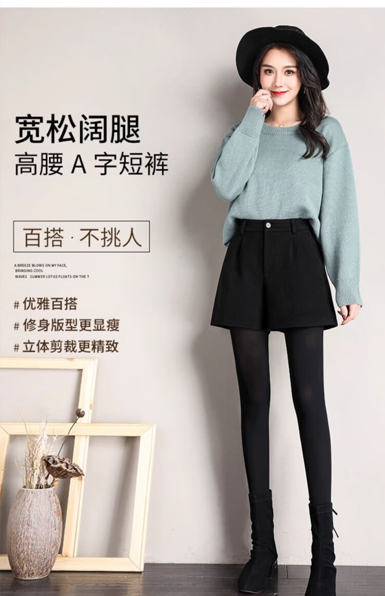 FOX.G black shorts for women for autumn and winter casual loose leggings showing long legs for girls women's commuter suit pants black button elastic waist woolen shorts without belt M recommended 100-115 Jin Jin equals 0.5 kg
