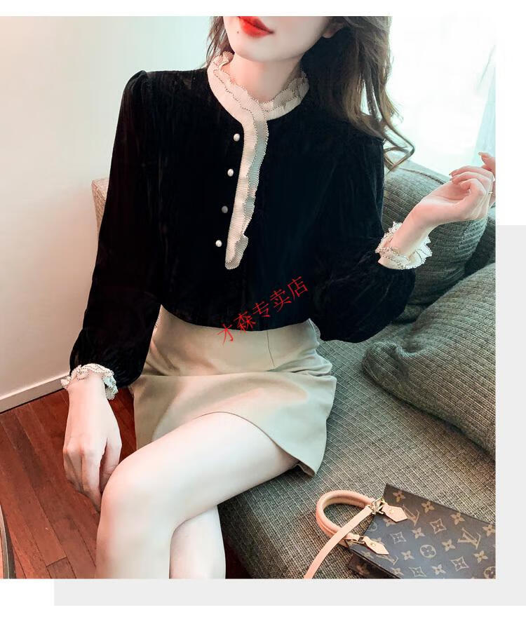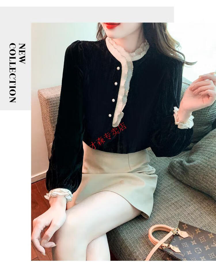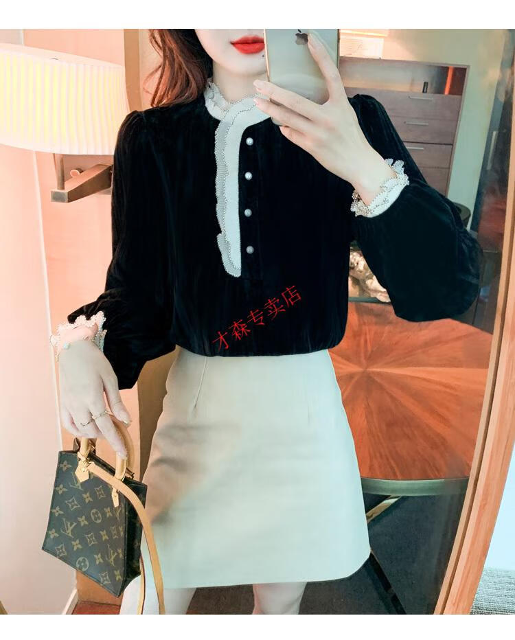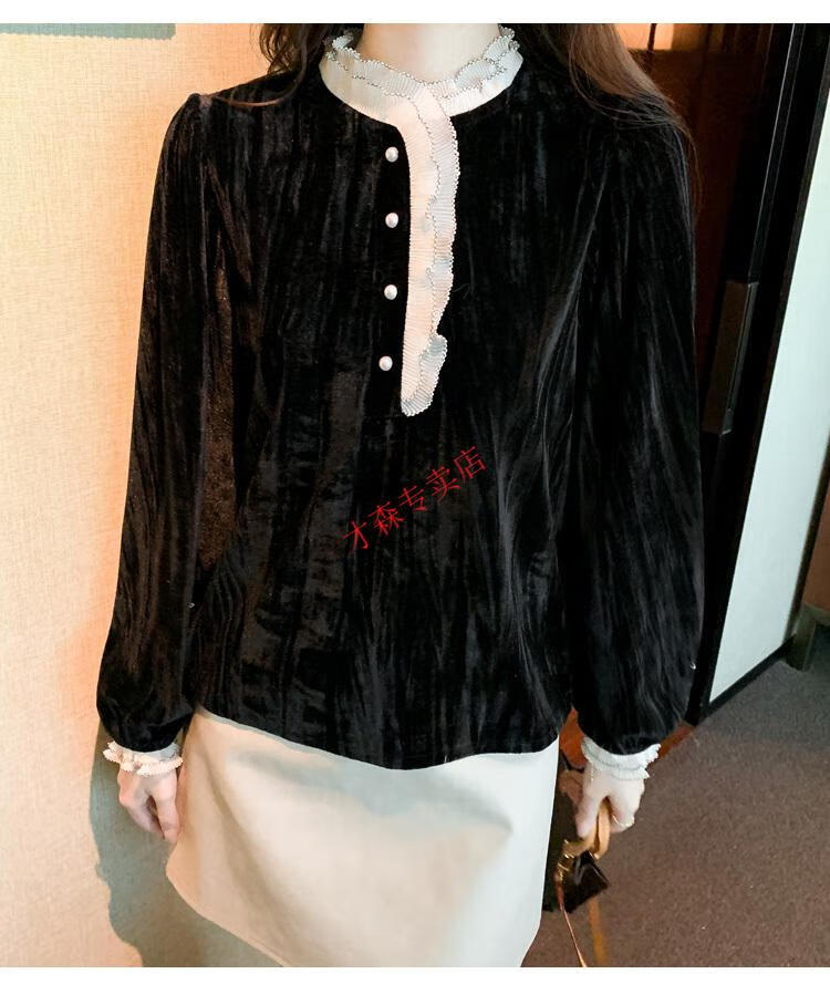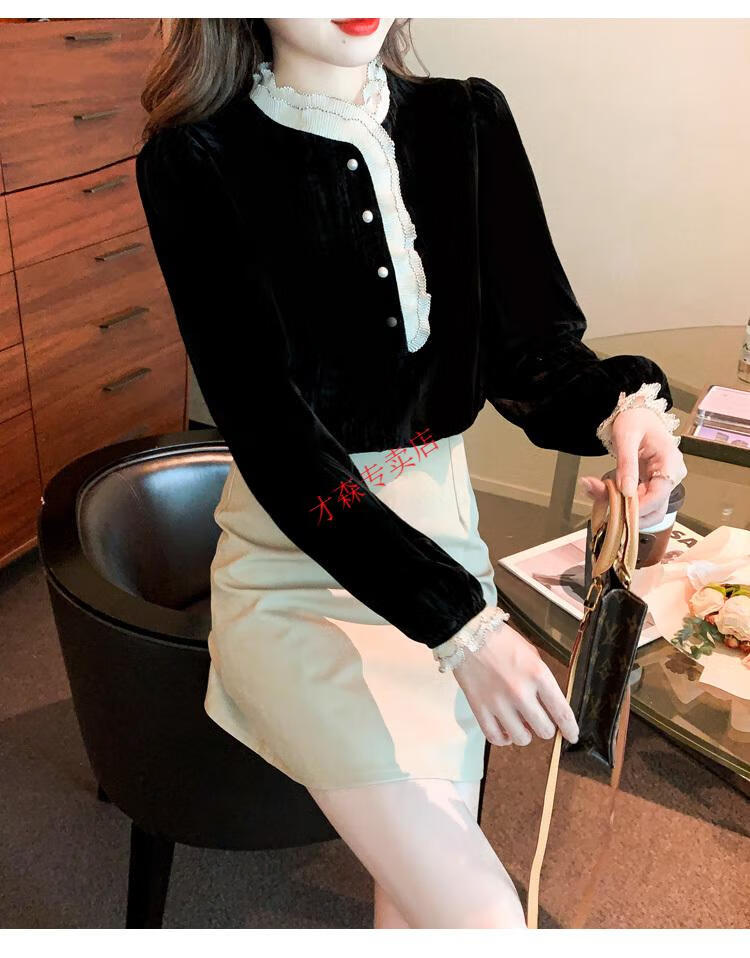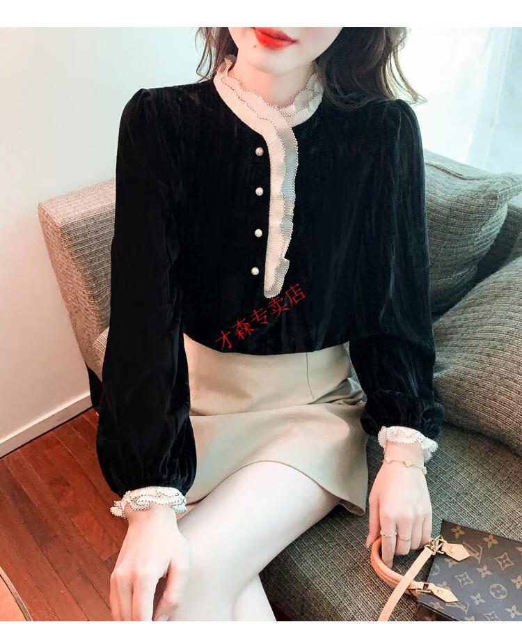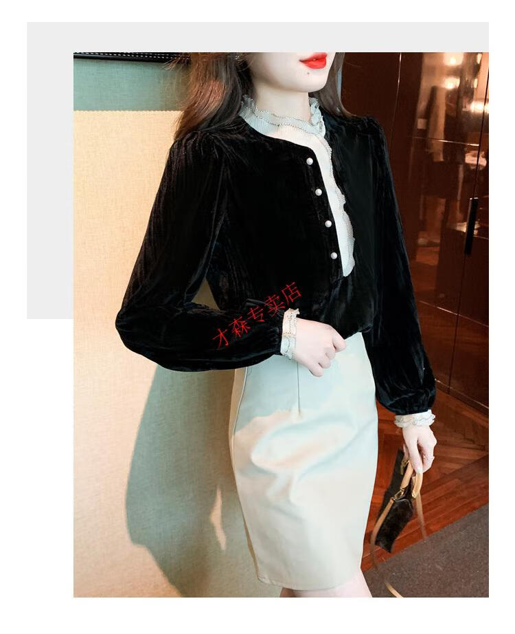 Pierre Cardin Autumn and Winter Thickened Gold Velvet Top Women's New Fashion Stand-up Collar Lace Shirt Bottoming Black Shirt Black 5XL 170-185Jin Jin is equal to 0.5 kg