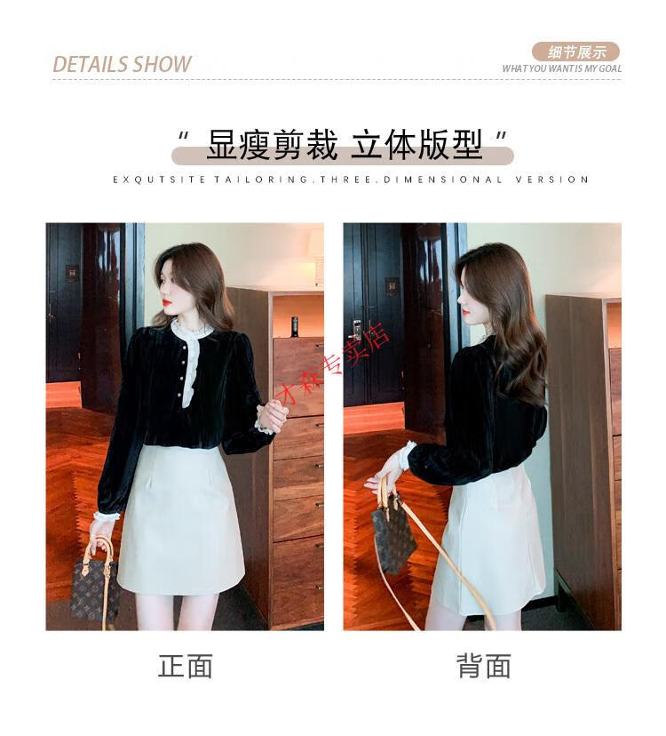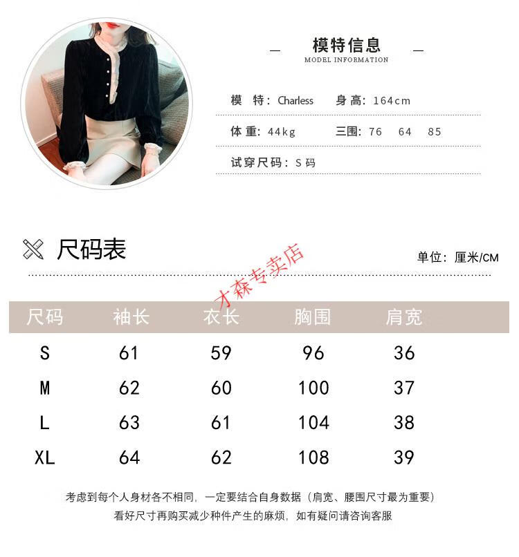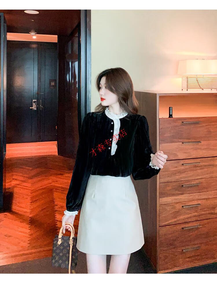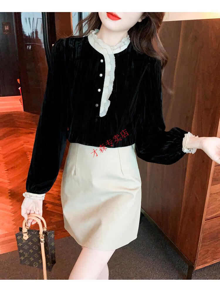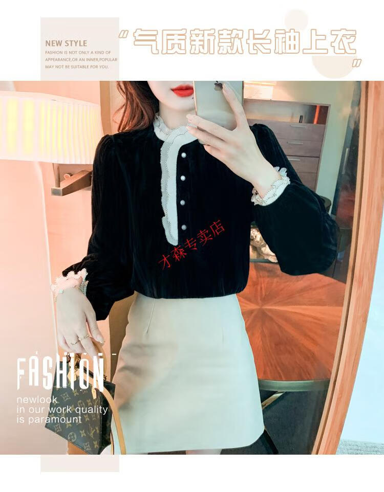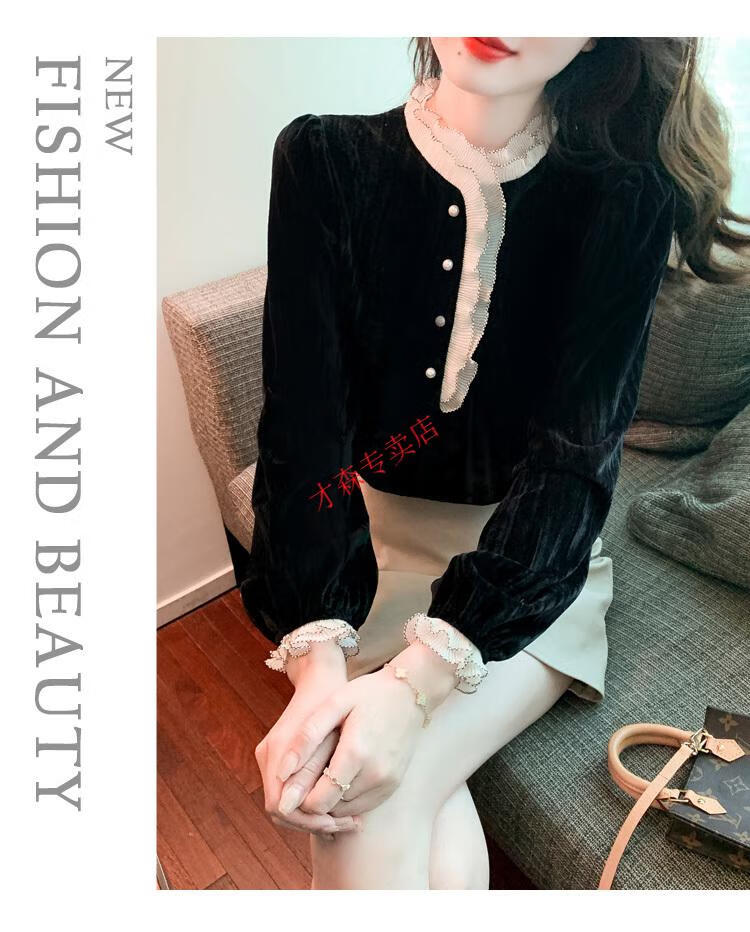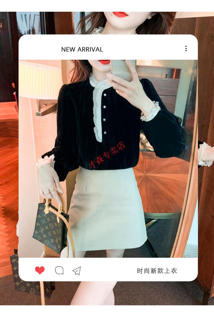 Pierre Cardin Autumn and Winter Thickened Gold Velvet Top Women's New Fashion Stand-up Collar Lace Shirt Bottoming Black Shirt Black 5XL 170-185Jin Jin is equal to 0.5 kg
