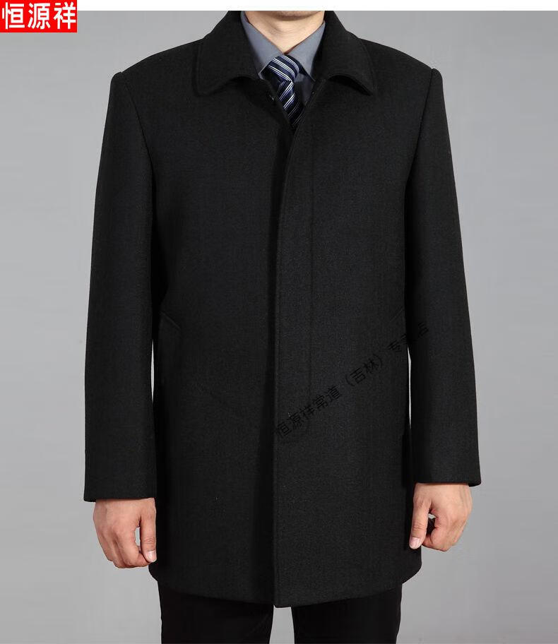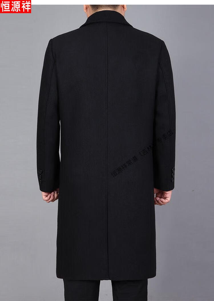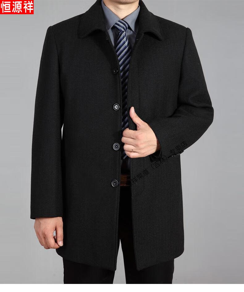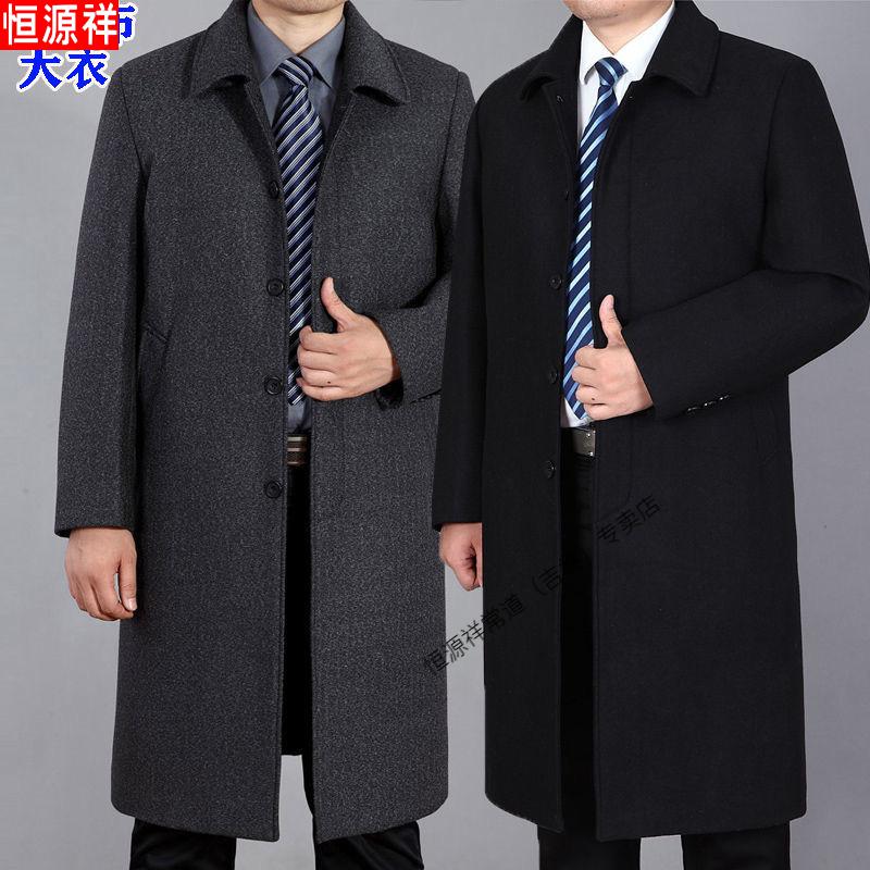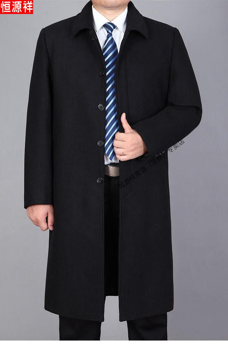 Hengyuanxiang middle-aged and elderly autumn and winter woolen coat long knee-length men's woolen woolen coat thickened dad men's long coat long black medium thick 1310 185/XXL