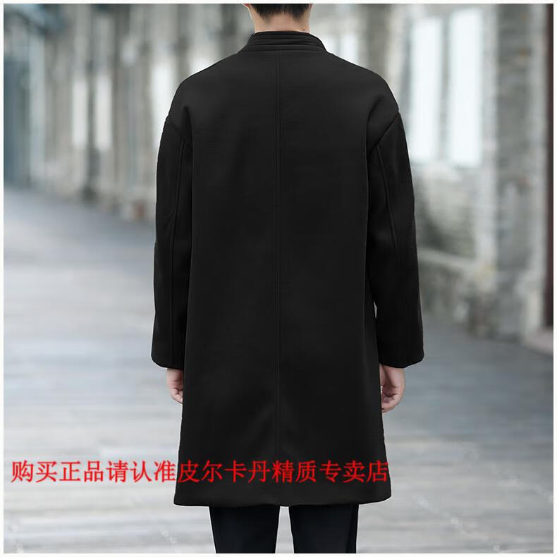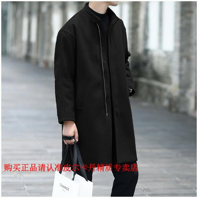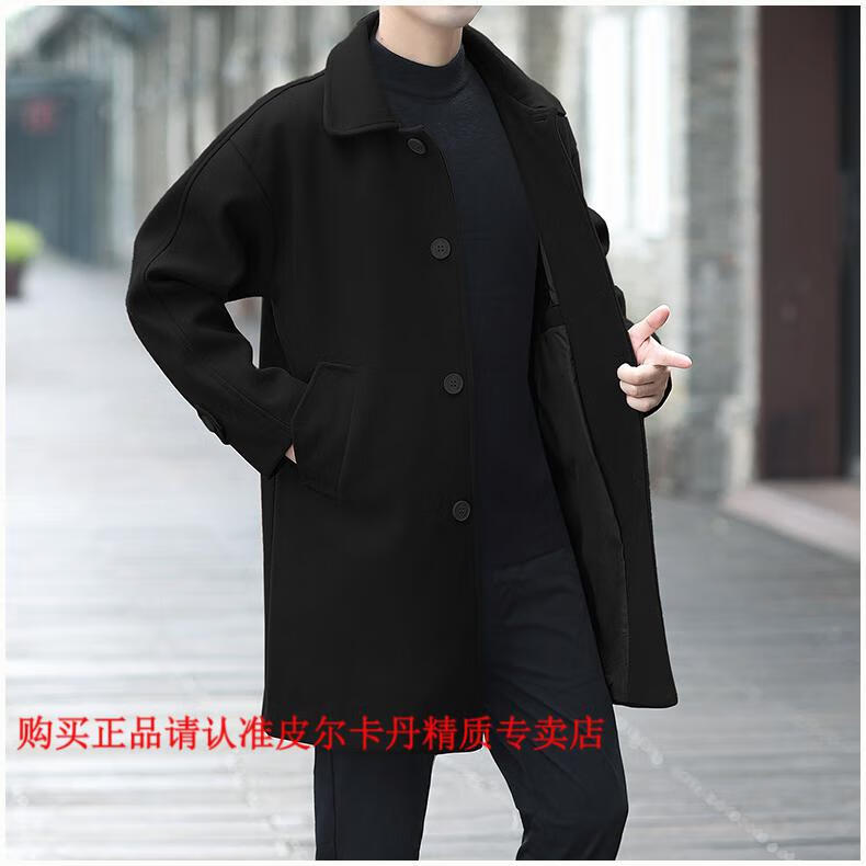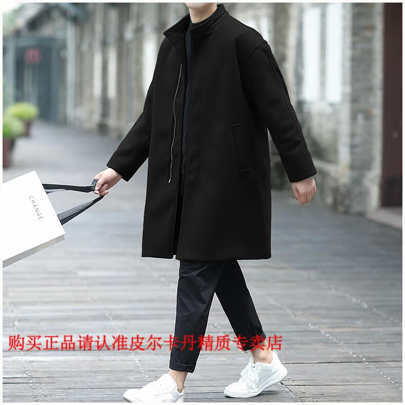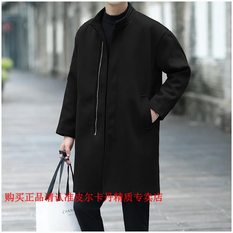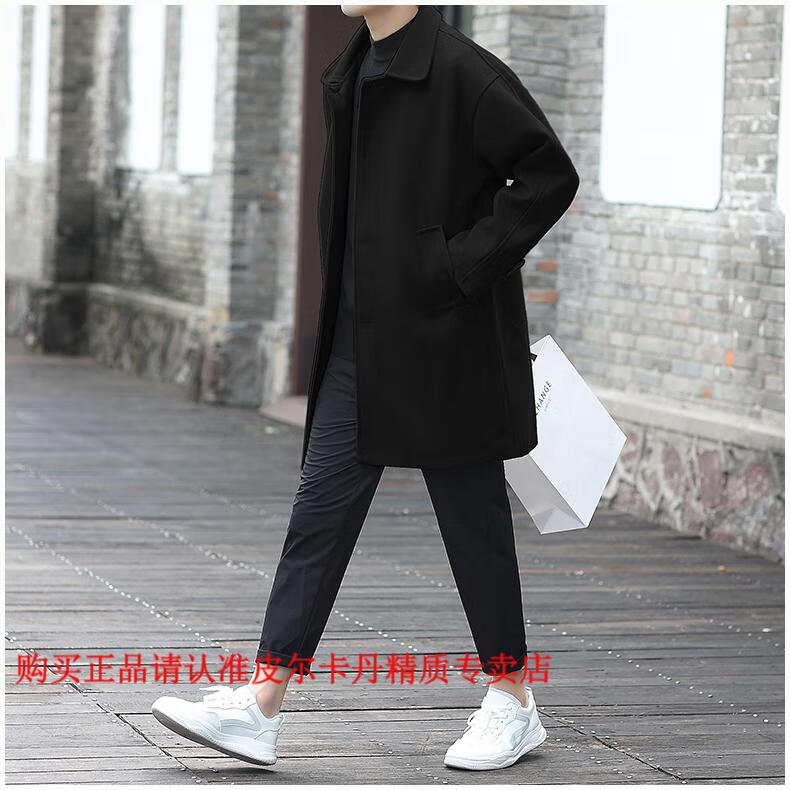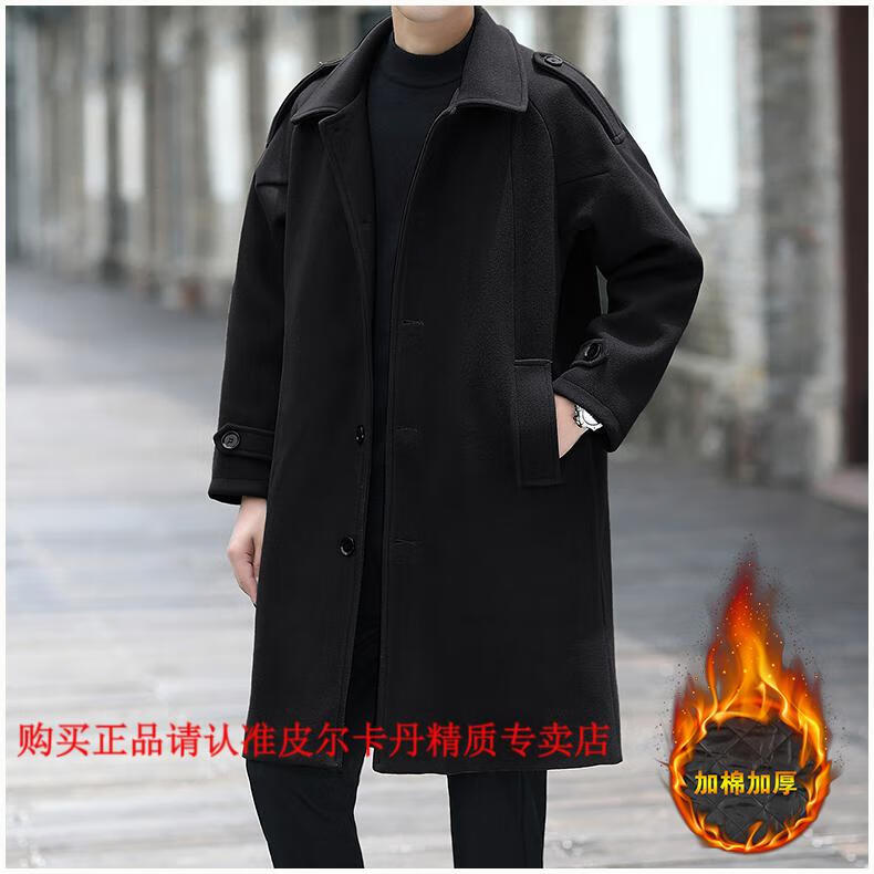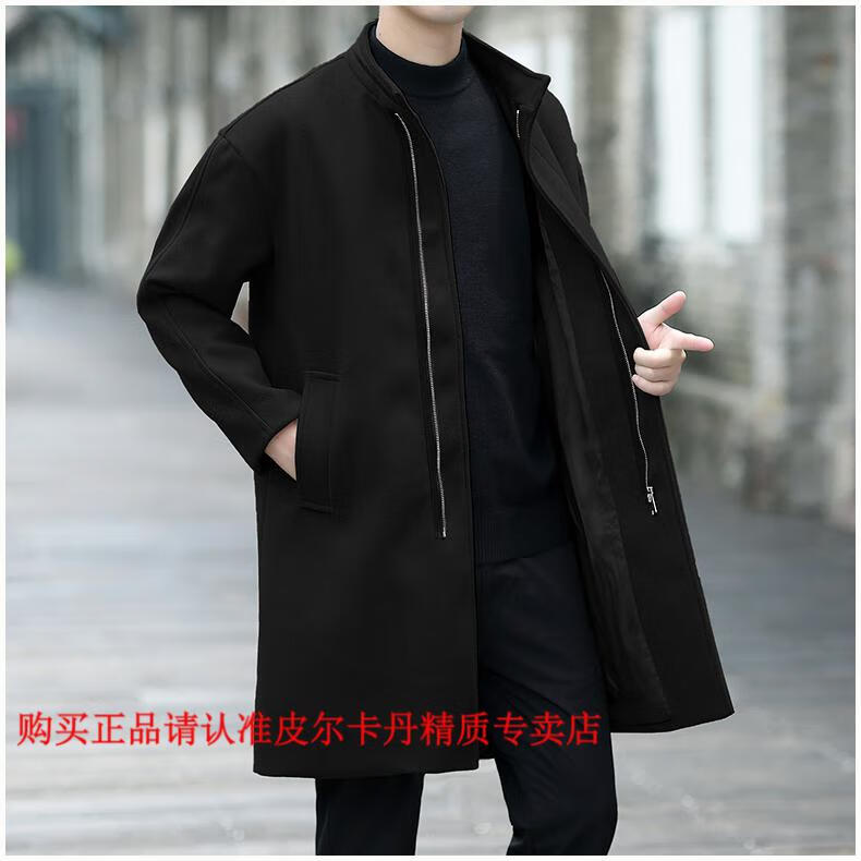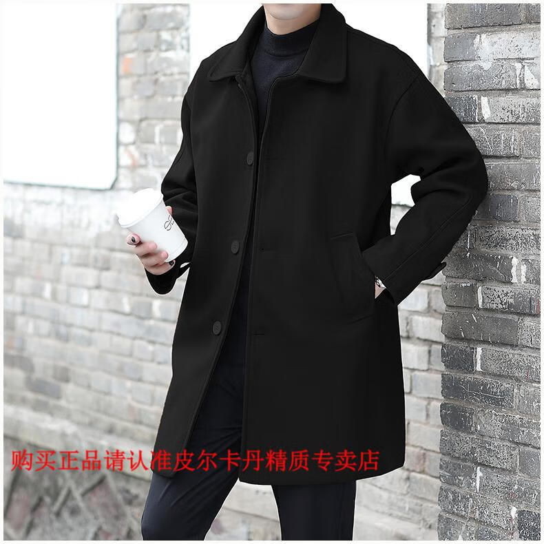 Pierre Cardin autumn and winter new trendy men's thickened mid-length windbreaker casual woolen coat loose and handsome woolen coat cotton black thickened M