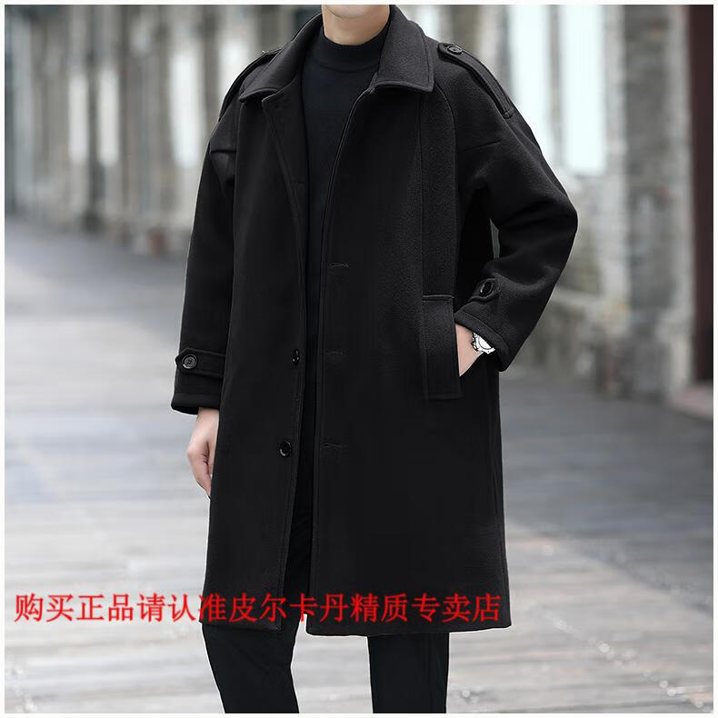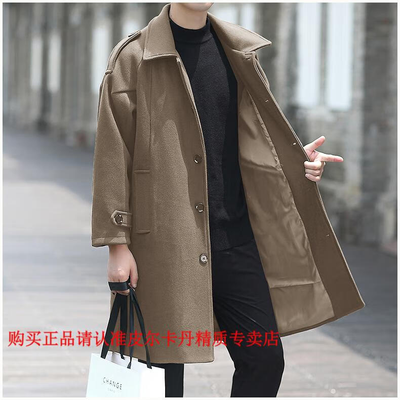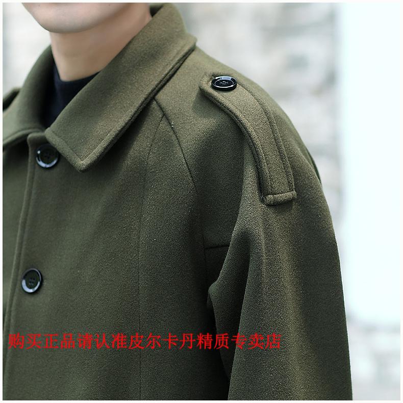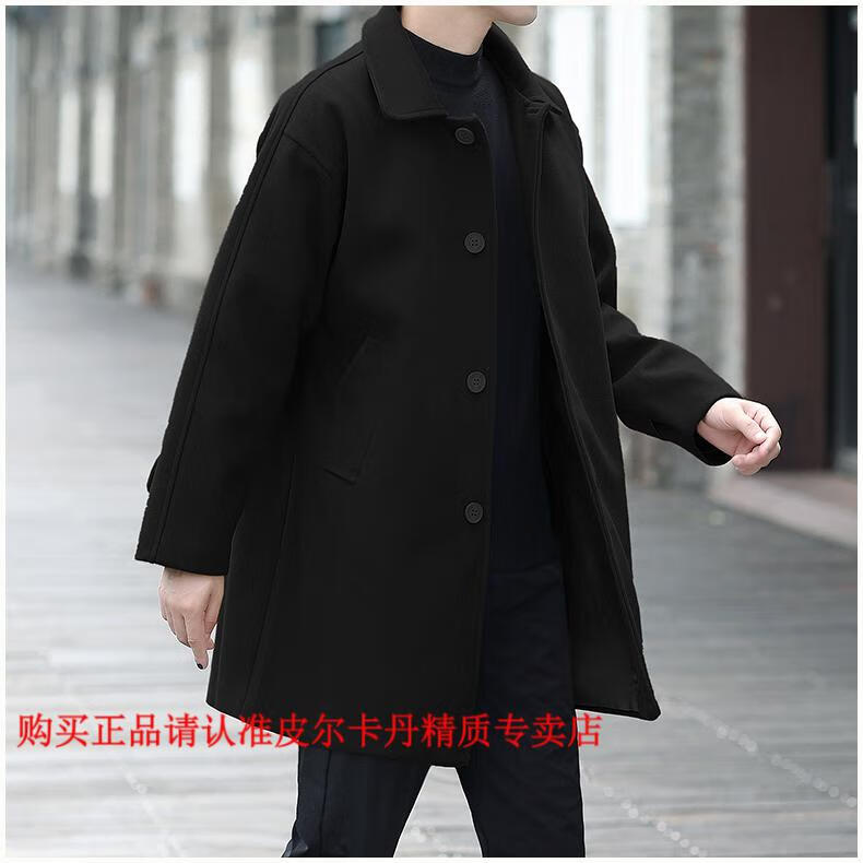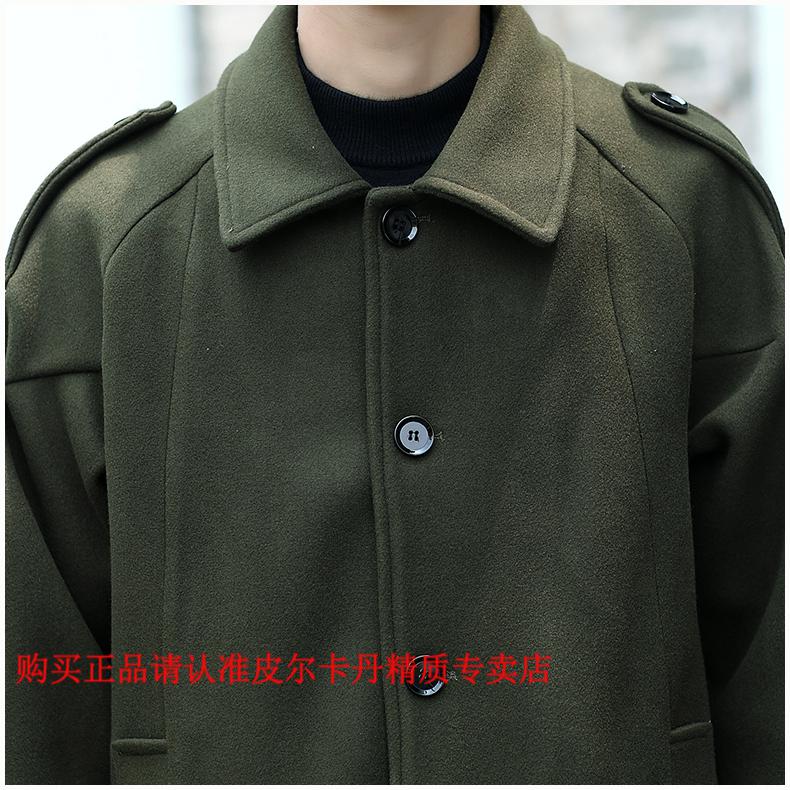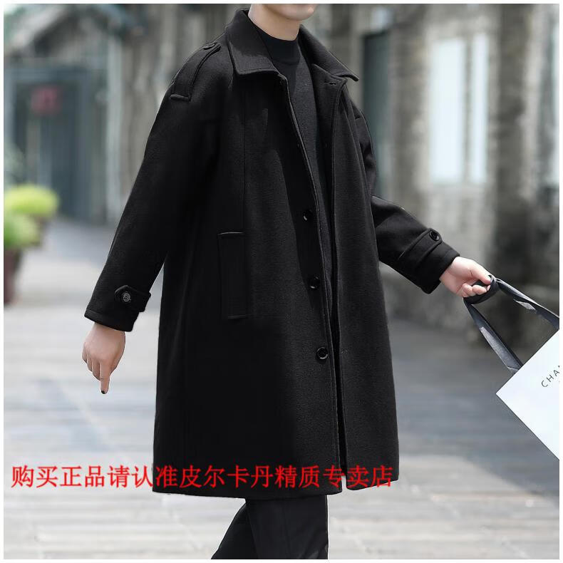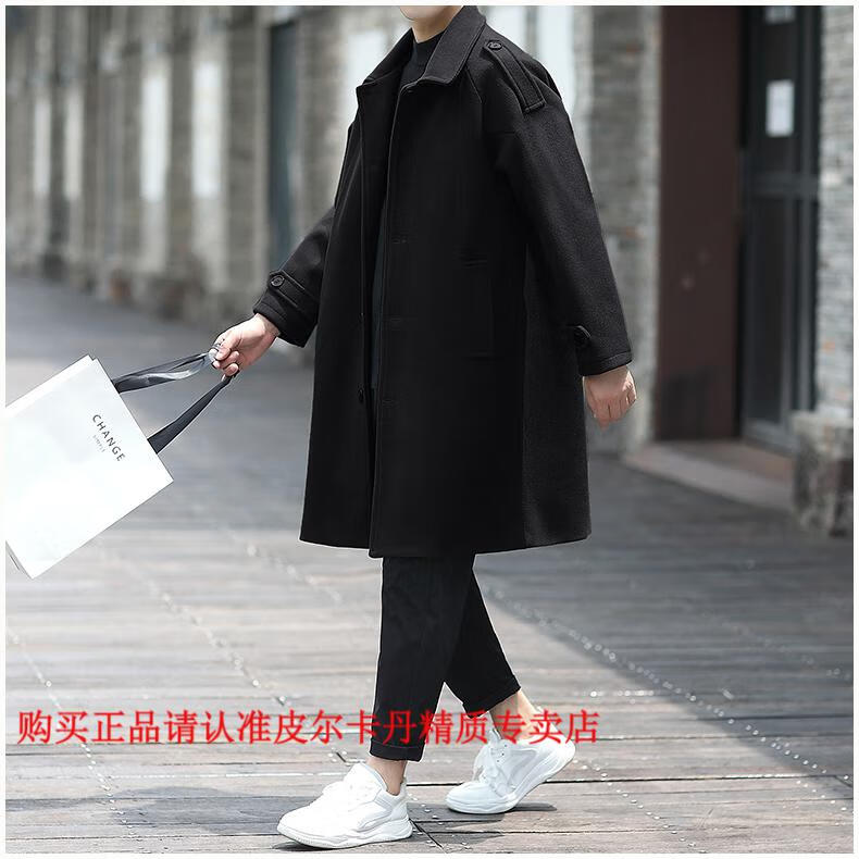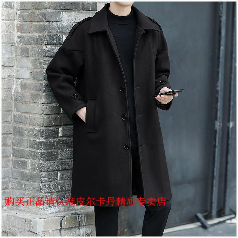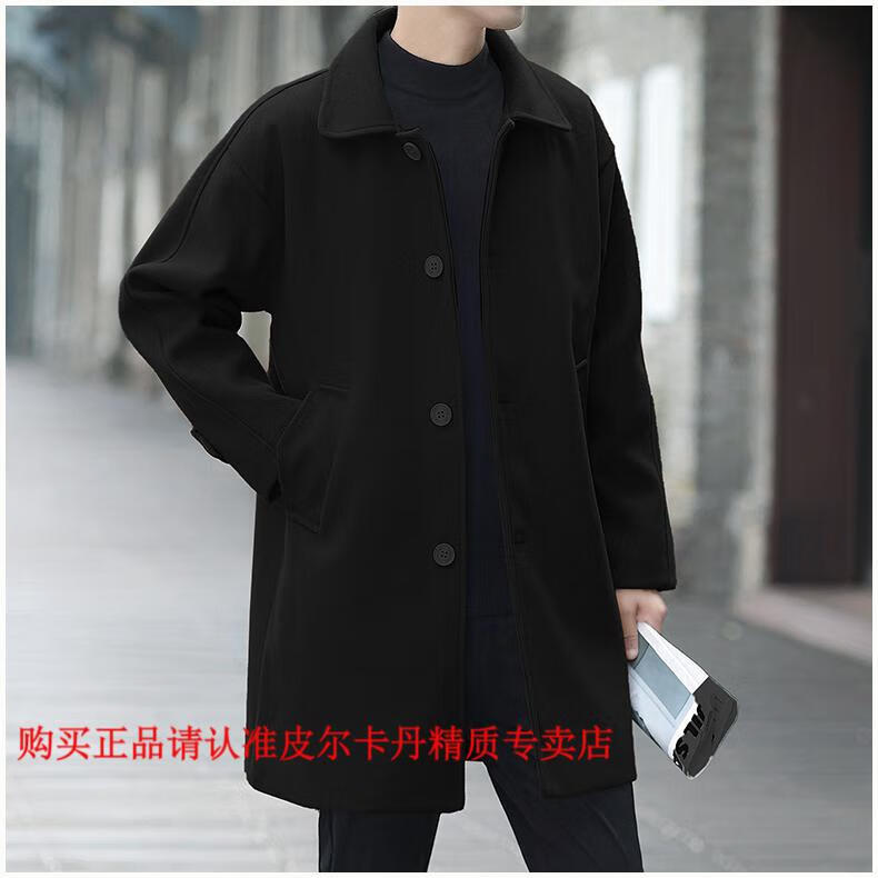 Pierre Cardin autumn and winter new trendy men's thickened mid-length windbreaker casual woolen coat loose and handsome woolen coat cotton black thickened M
