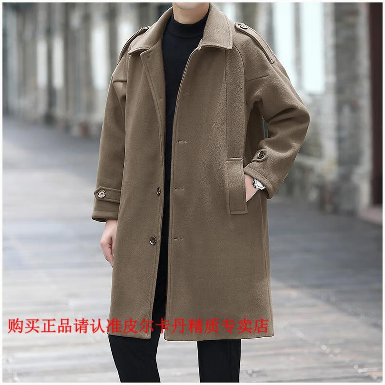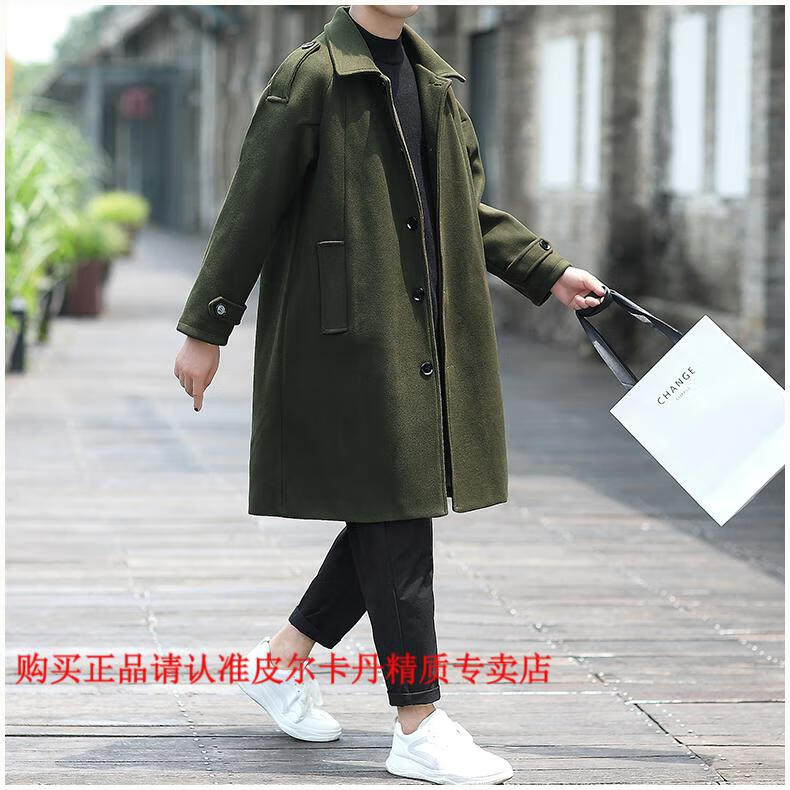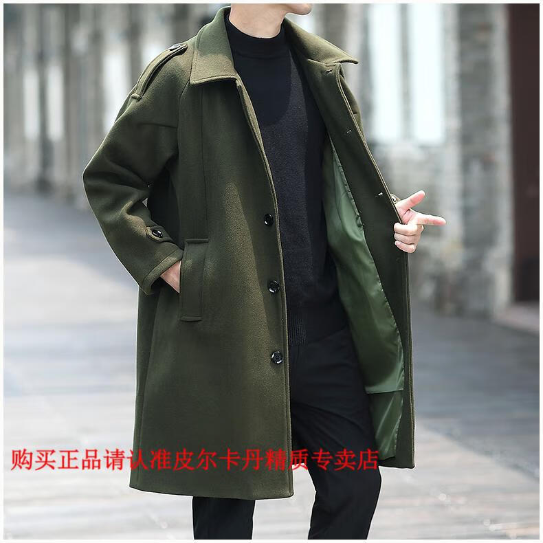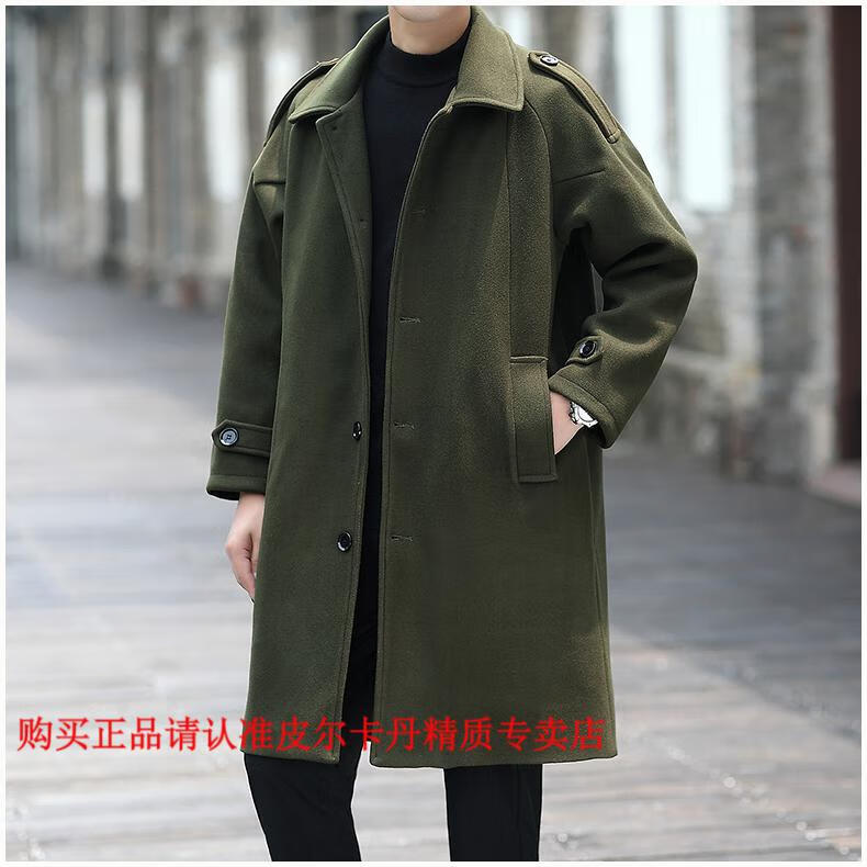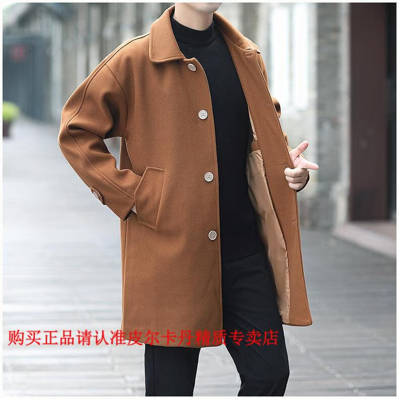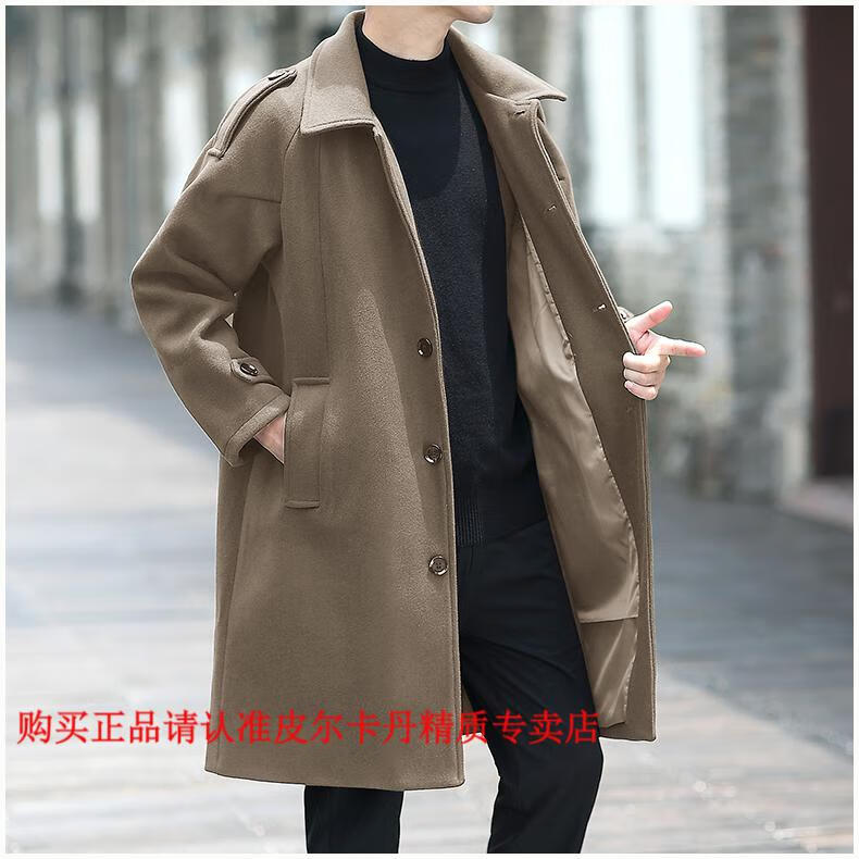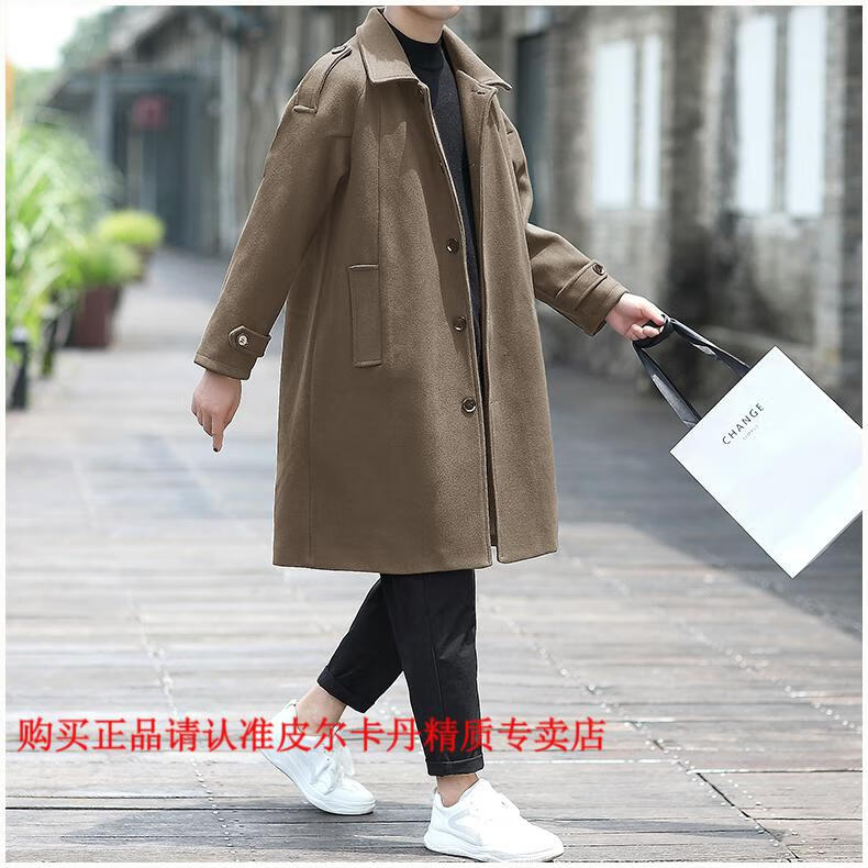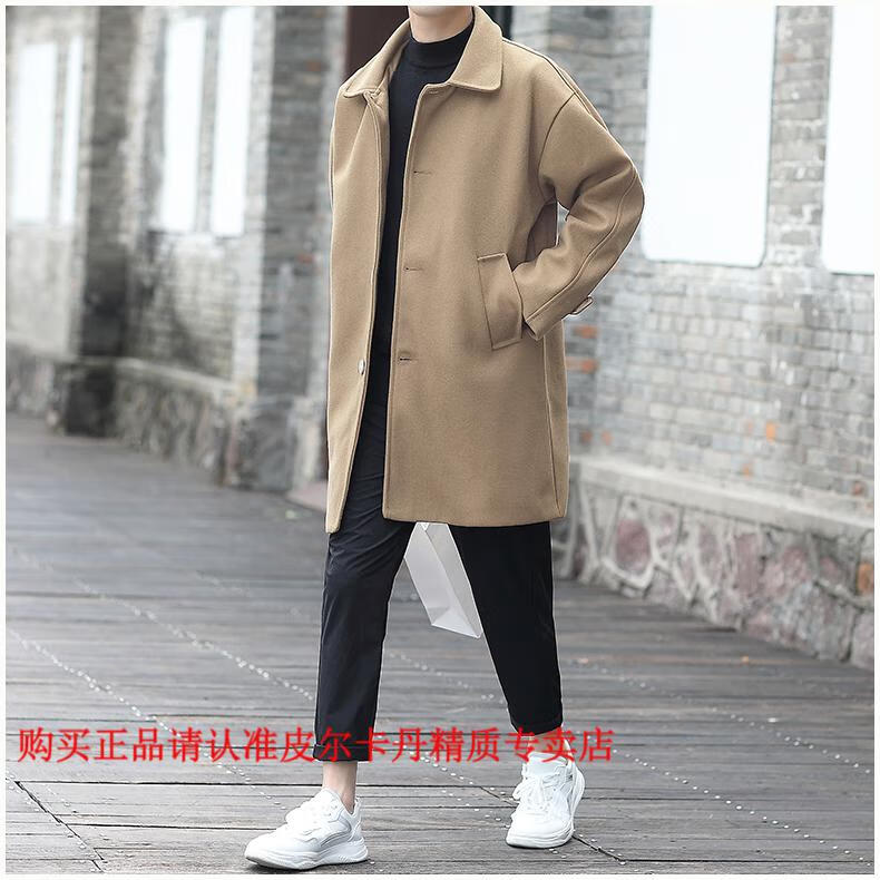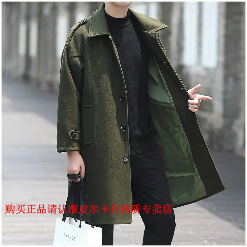 Pierre Cardin autumn and winter new trendy men's thickened mid-length windbreaker casual woolen coat loose and handsome woolen coat cotton black thickened M