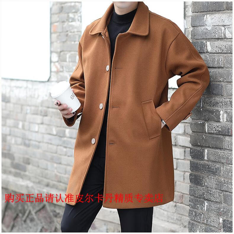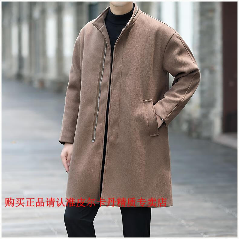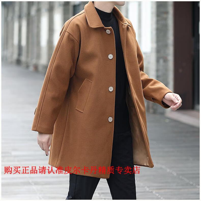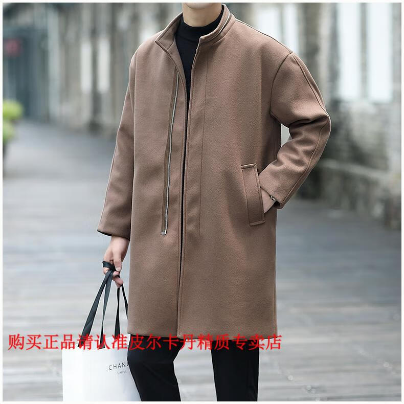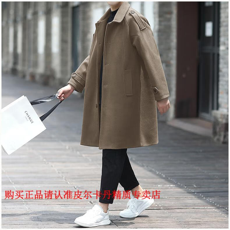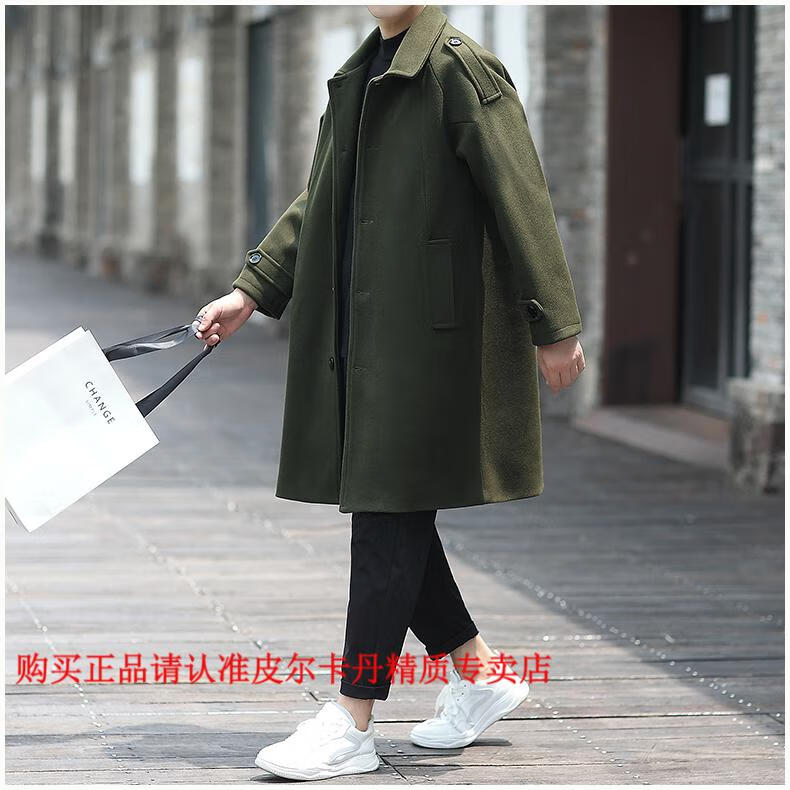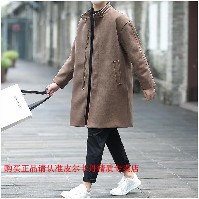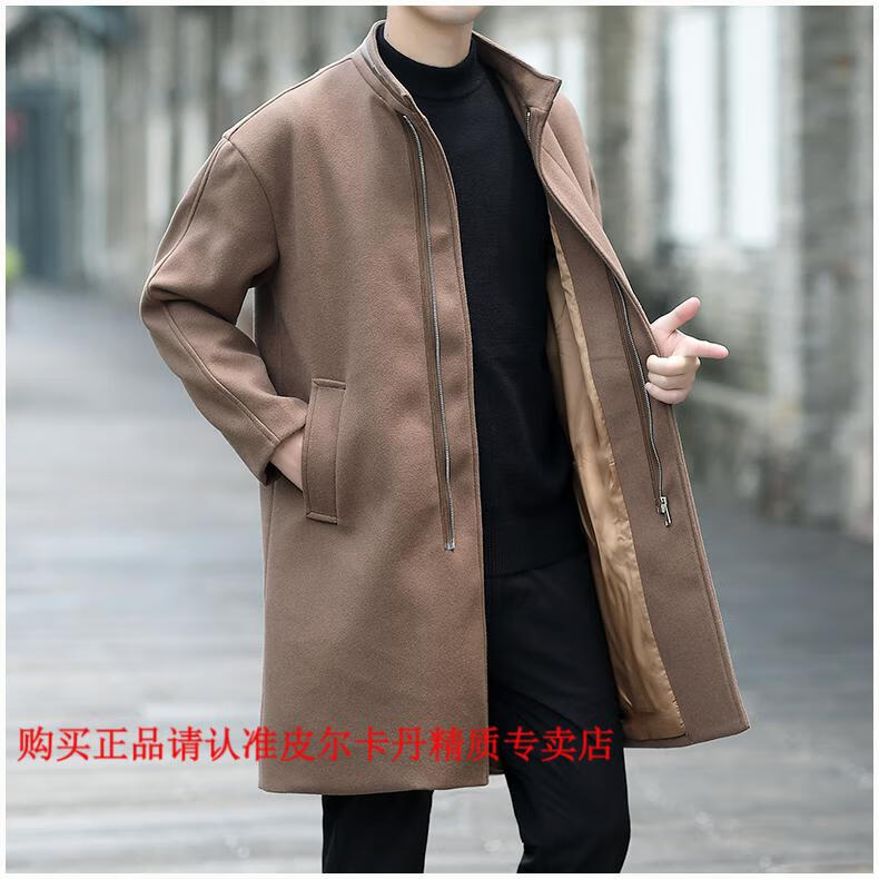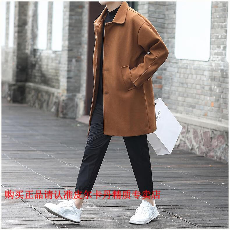 Pierre Cardin autumn and winter new trendy men's thickened mid-length windbreaker casual woolen coat loose and handsome woolen coat cotton black thickened M