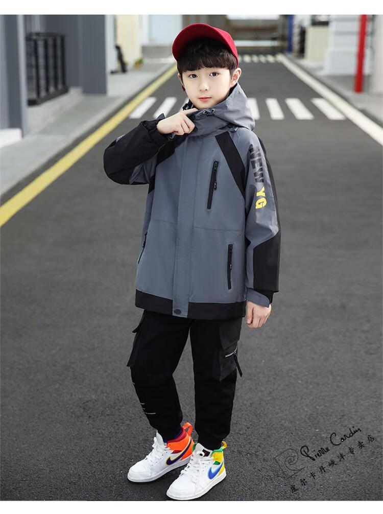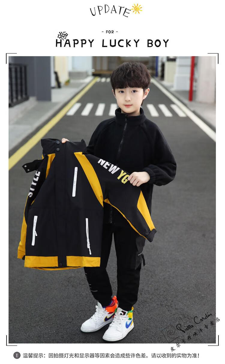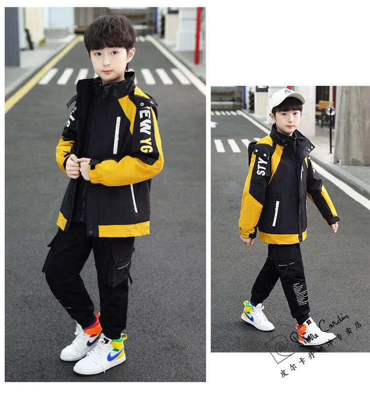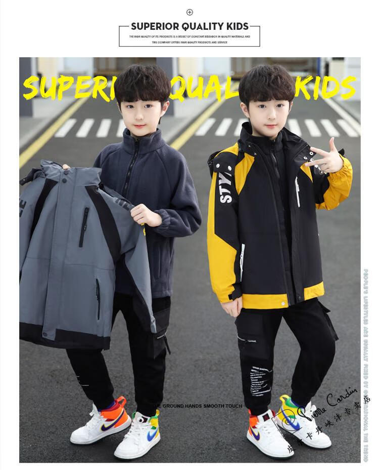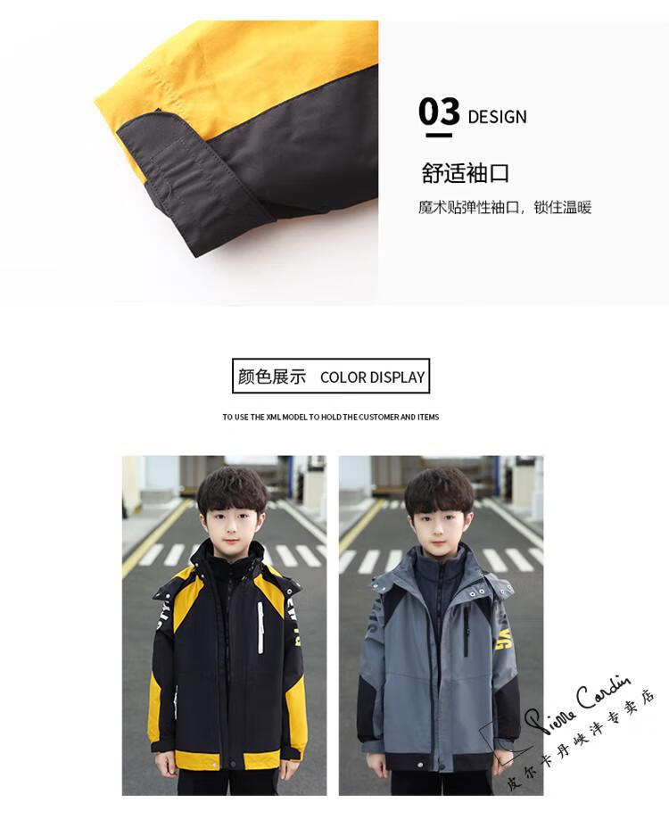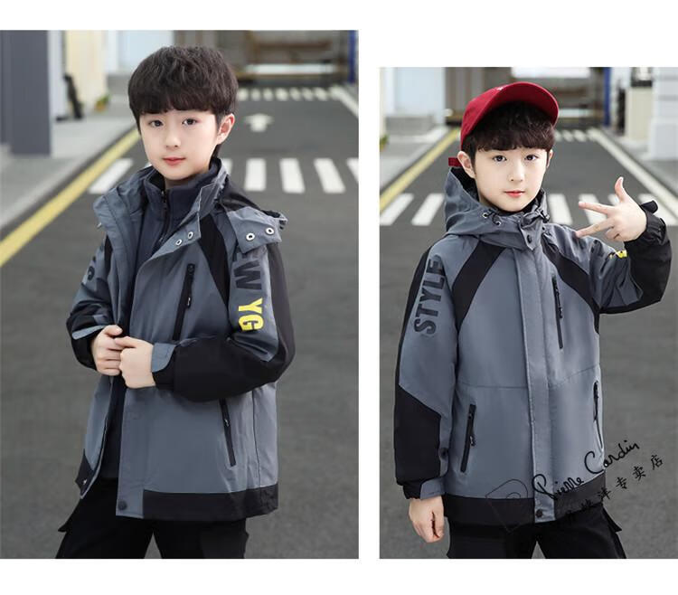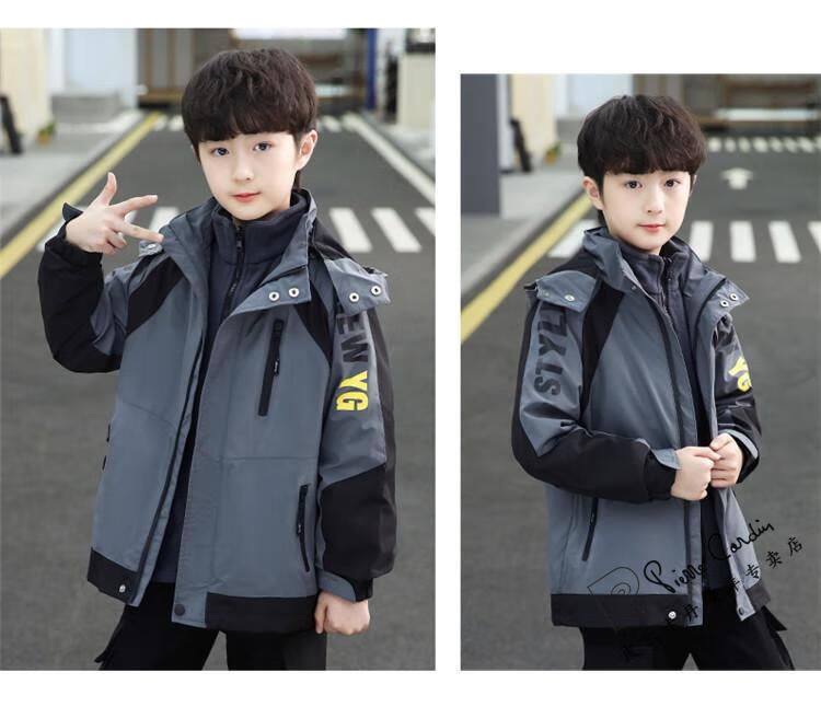 Pierre Cardin Boys Autumn and Winter Three-in-One Jacket for Medium and Large Children Detachable Jacket Thickened and Warm Winter Color Block Top Handsome Gray Cotton Thickened 160cm