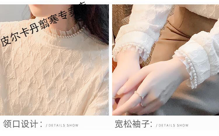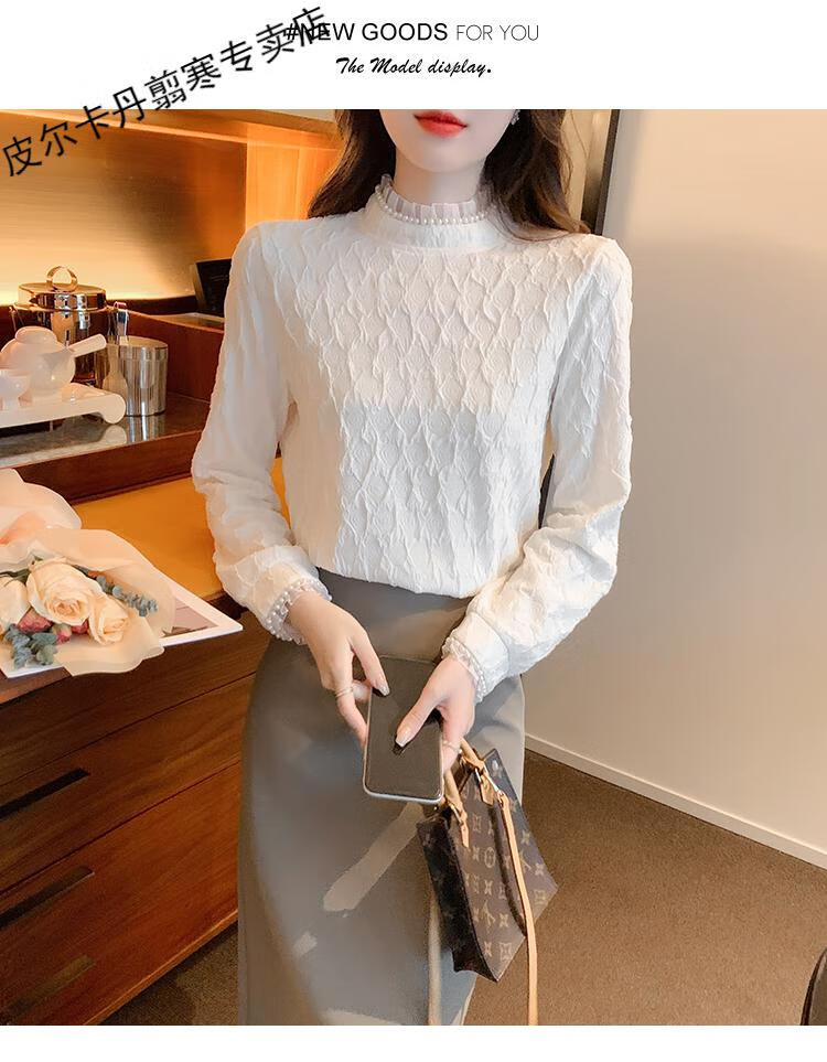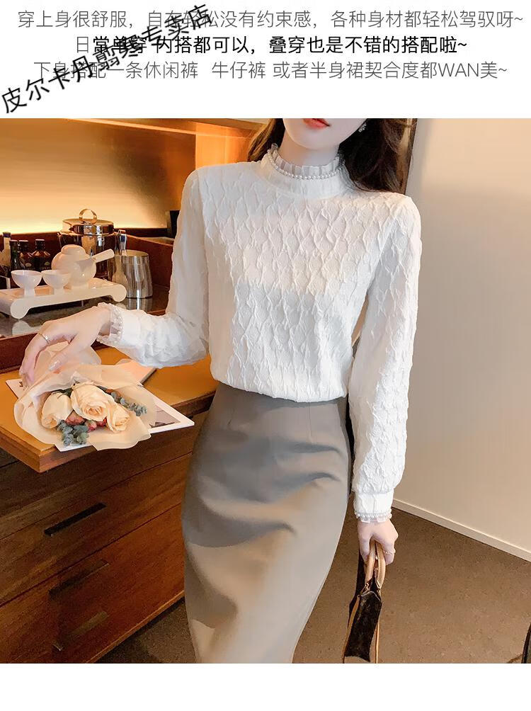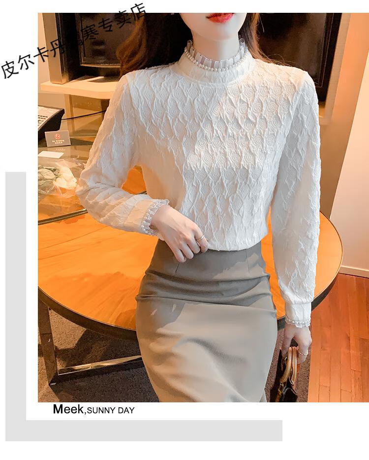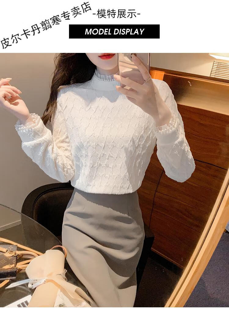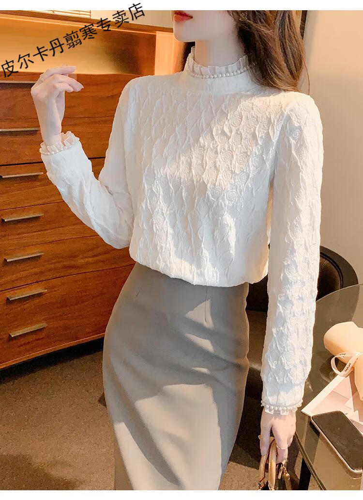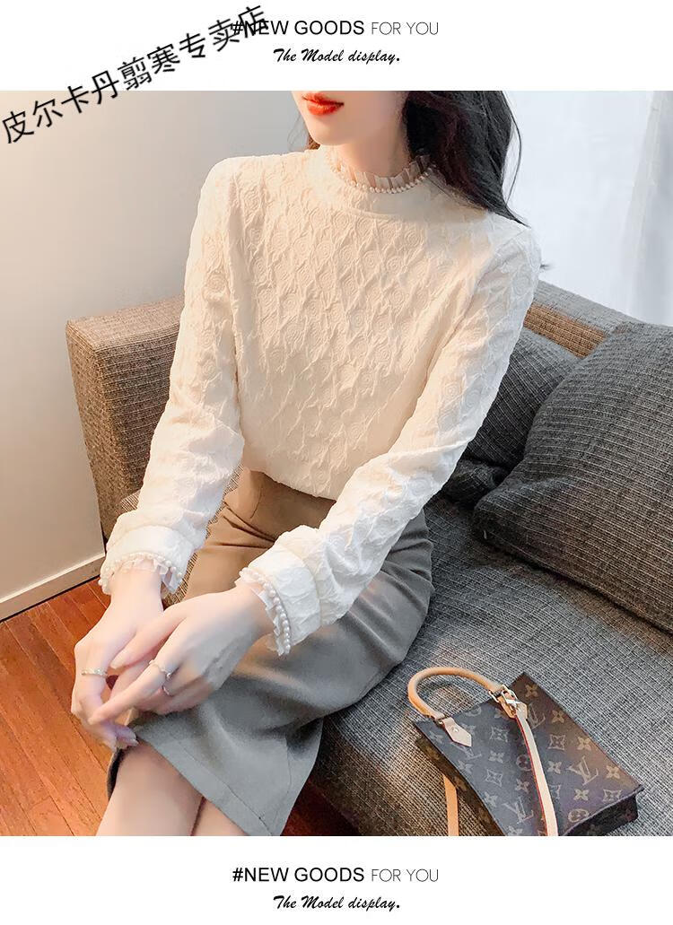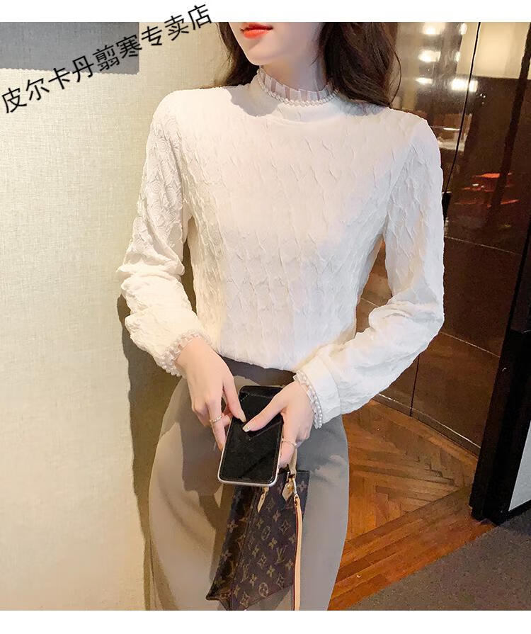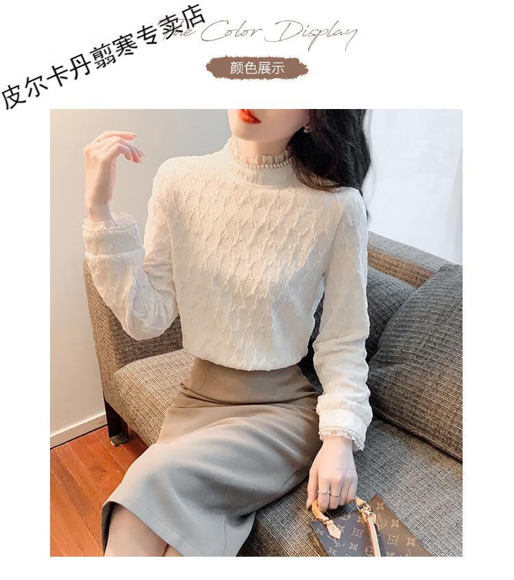 Pierre Cardin half turtleneck lace bottoming shirt for women 2025 autumn and winter new style French style plus velvet thickened lace top, milky white plus velvet M