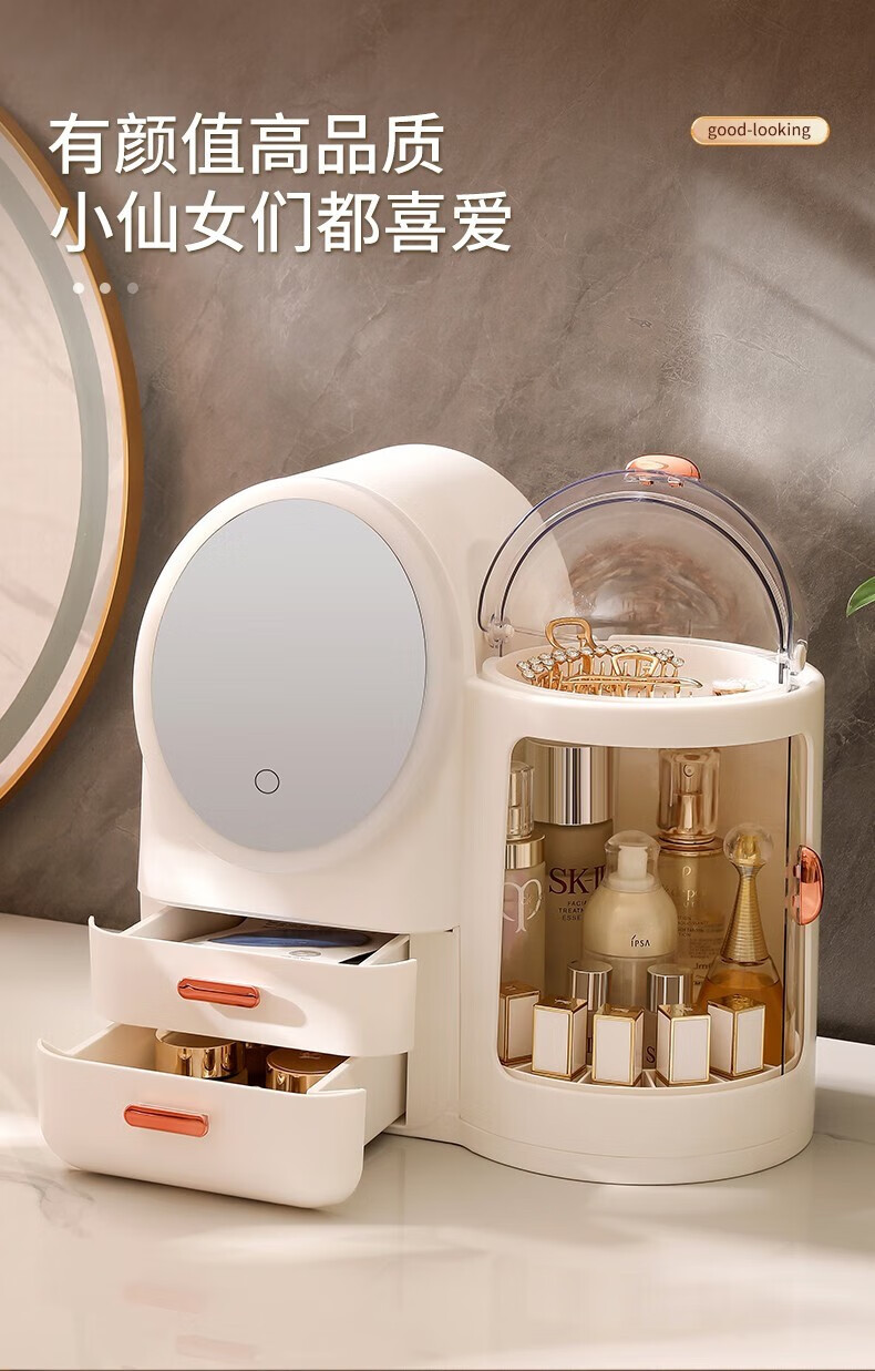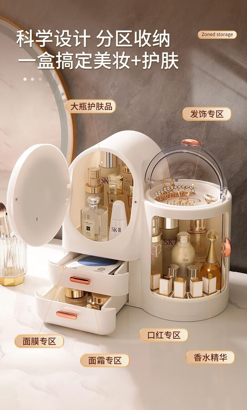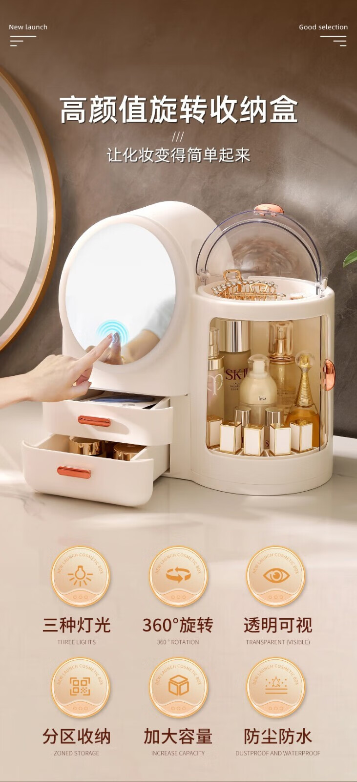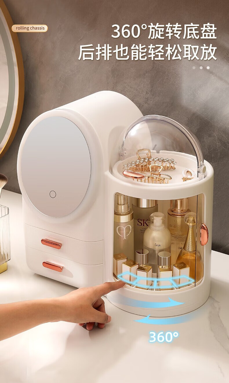 Yunya cosmetics storage box with mirror, dust-proof, rotatable large-capacity box, desktop with light, integrated skin care product storage rack, elegant white, all-in-one portable model