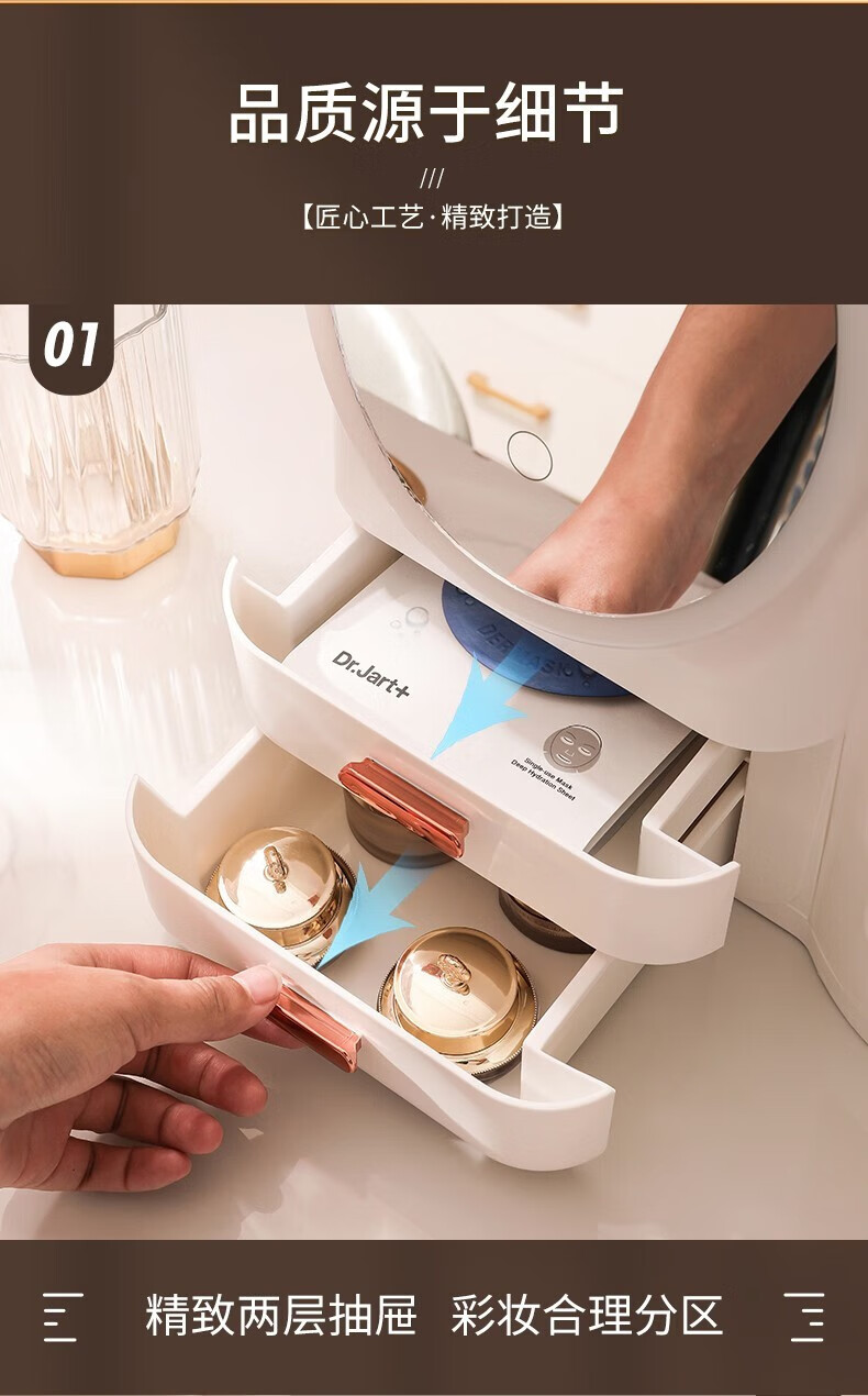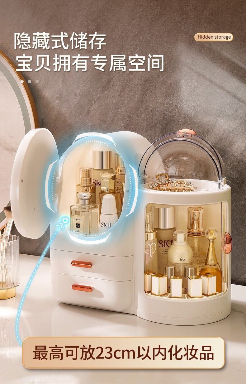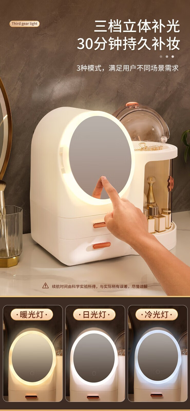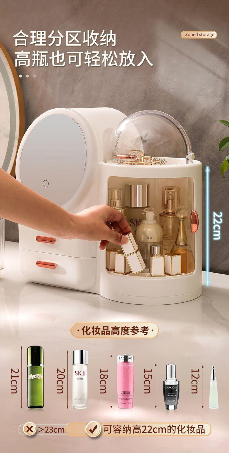 Yunya cosmetics storage box with mirror, dust-proof, rotatable large-capacity box, desktop with light, integrated skin care product storage rack, elegant white, all-in-one portable model