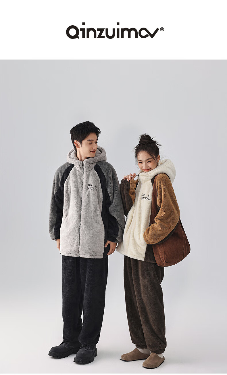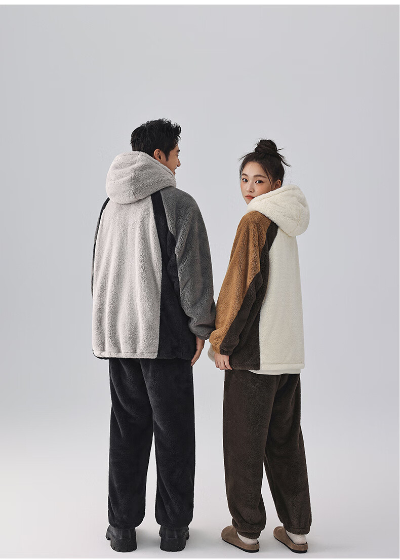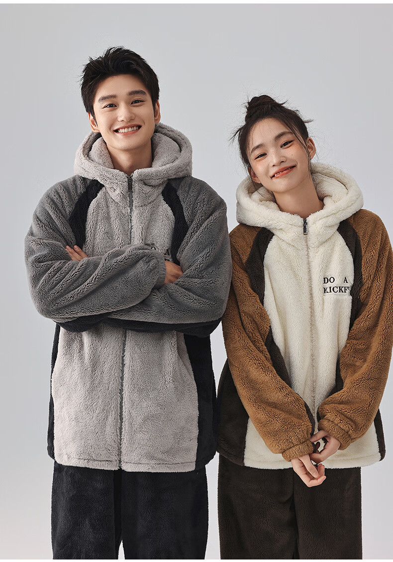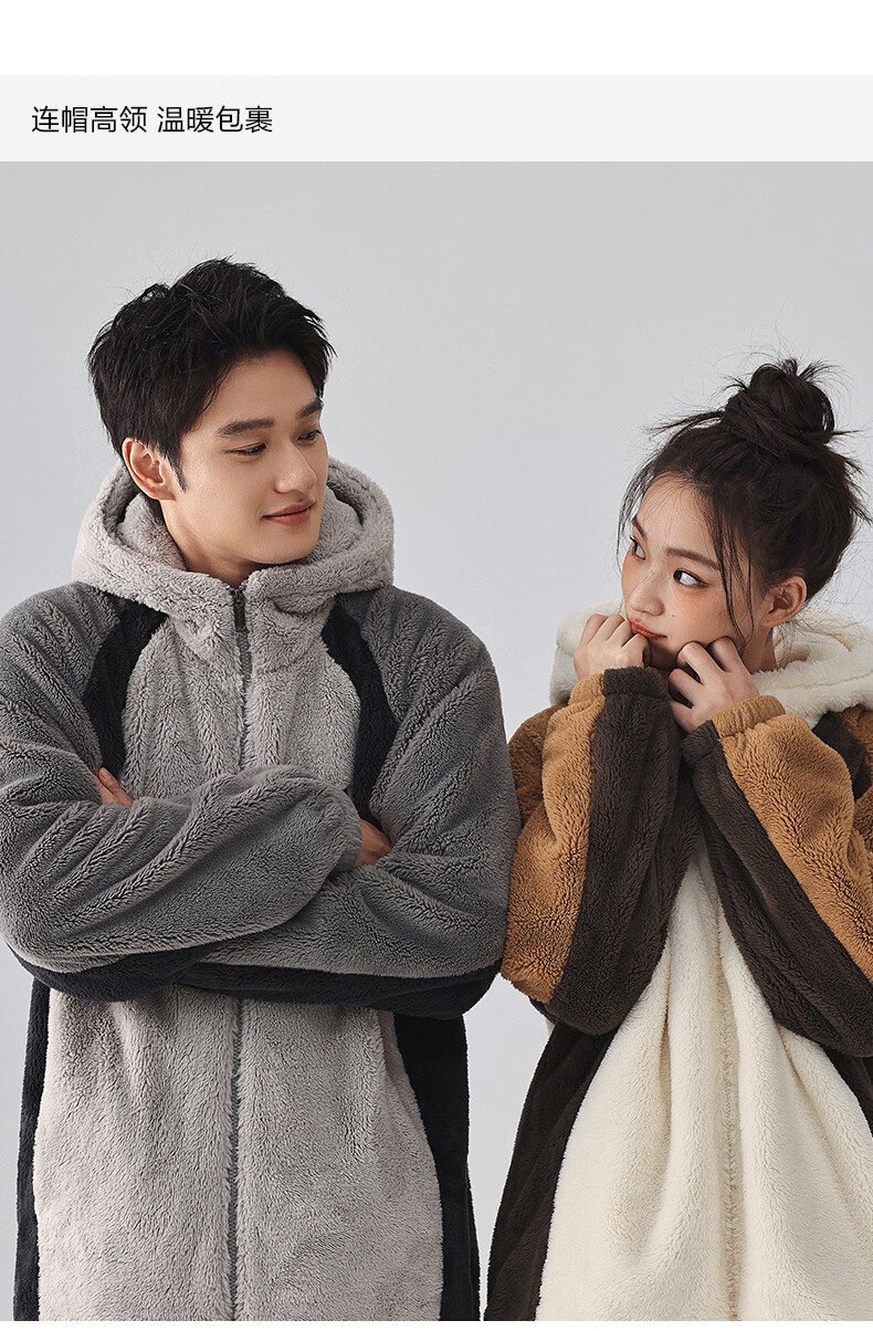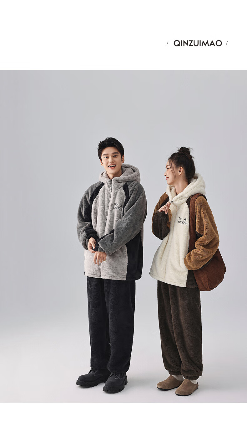 Kissing Cat Soft Velvet Hooded Wide Couple Pajamas Women's Autumn and Winter Warm Thickened Men's Suit Home Clothes 4705 Golden Brown Women's M