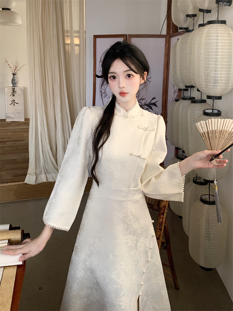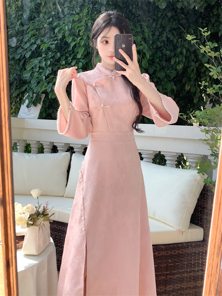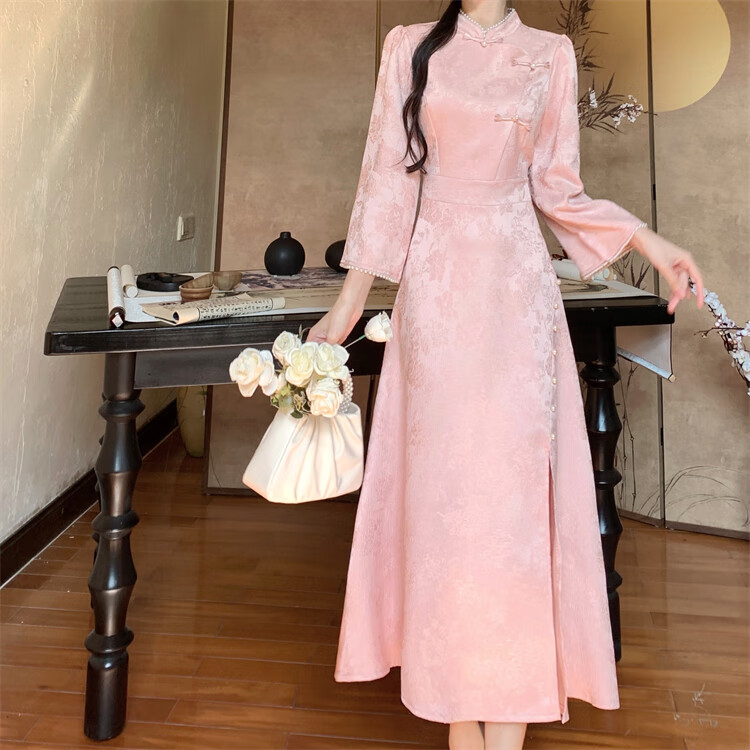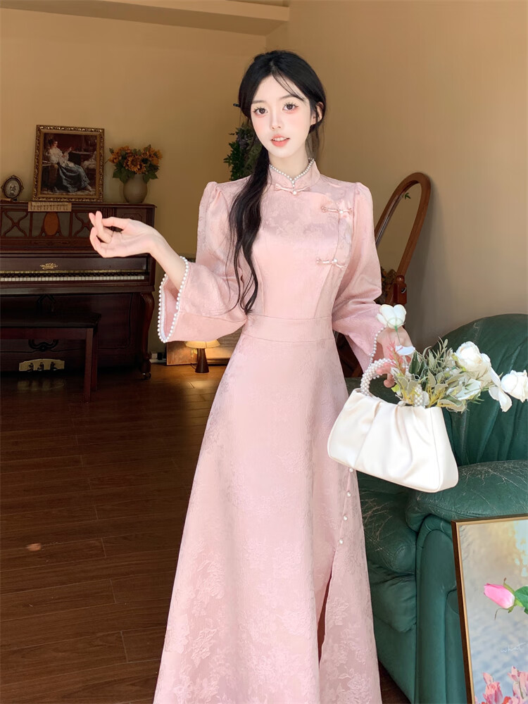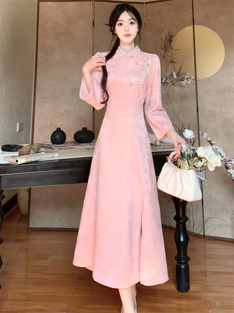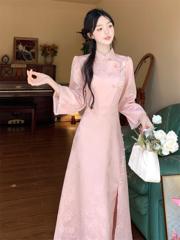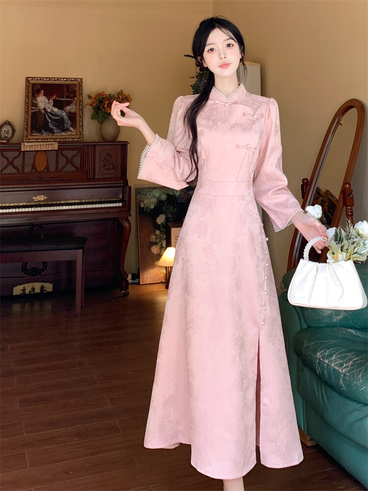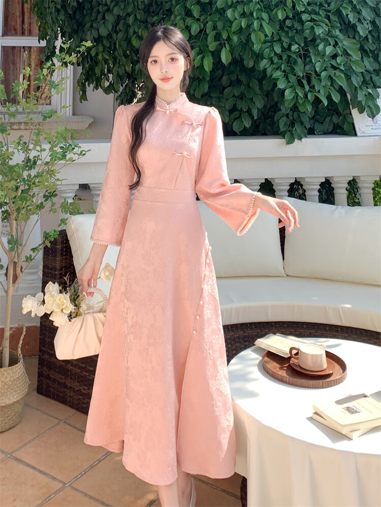 Zhi Li Guan Improved Flag New Chinese Style Light National Style Long Sleeve Dress Women's 2024 Autumn and Winter New Young Temperament Robe Daily Wear Pink Large Size XL