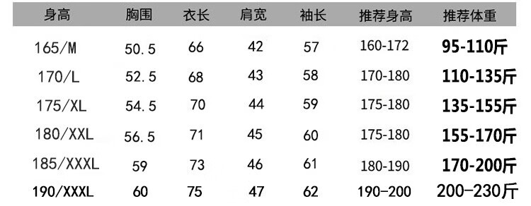 China (cm) 165 / 88-90 170 / 96-98 175 / 108-110 180 / 118-122 185 / 126-130