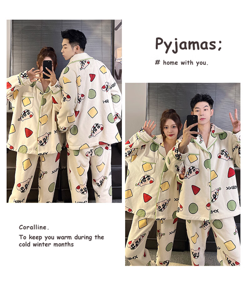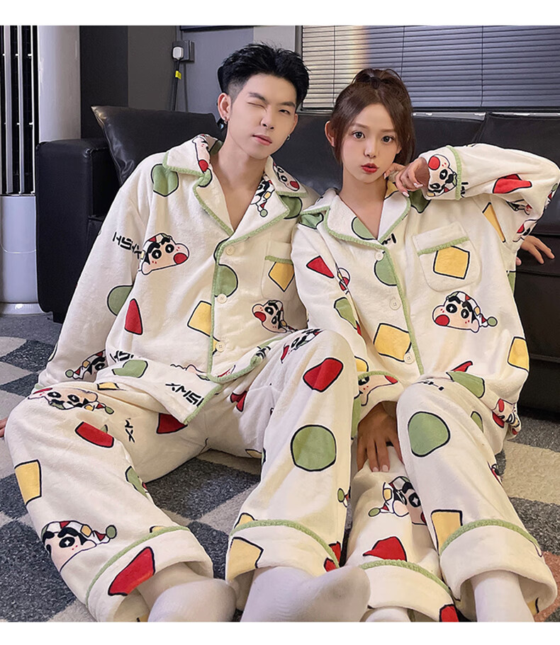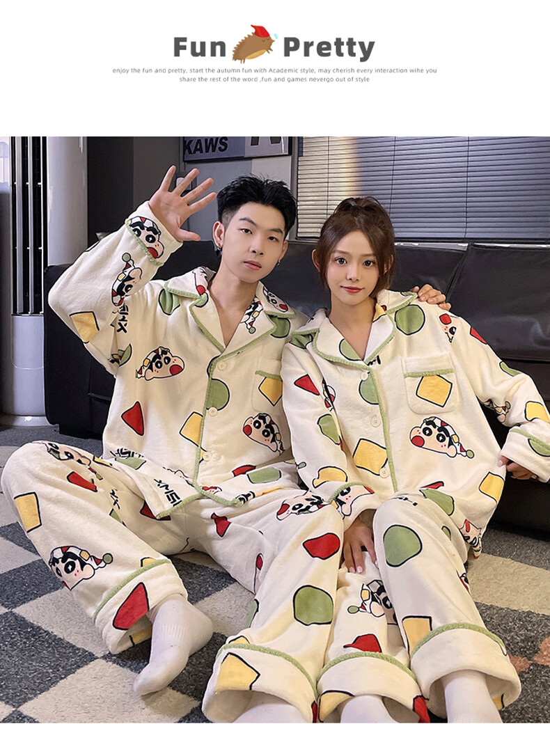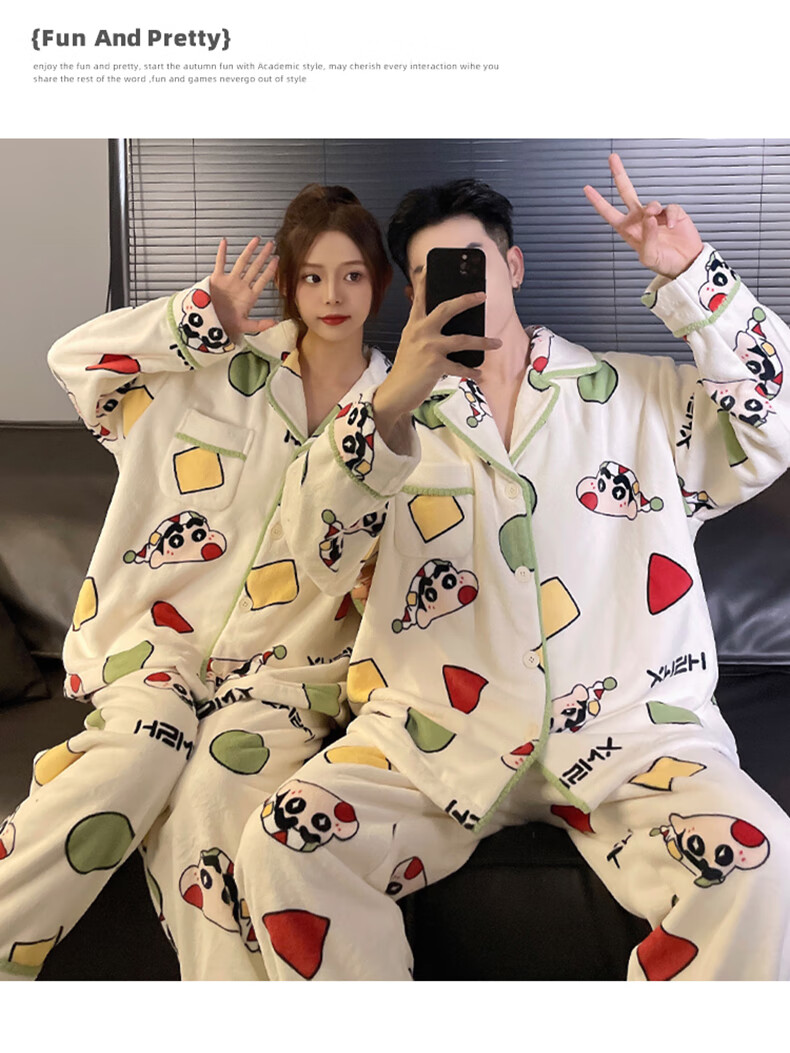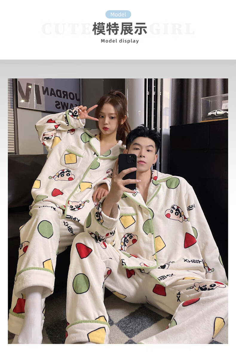 Full bundle of Crayon Shin-chan coral velvet autumn and winter pajamas for women, plus velvet and thickened home clothes, couple flannel men's suit, plush #M10# couple cardigan Crayon Shin-chan 2XL male size (weight 140-160Jin Jin is equal to 0.5 kg)