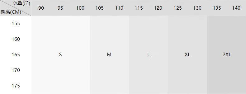 China (cm) 160-165/84-86 165-170 / 88-90 167-172 / 92-96 168-173 / 98-102 170-176 / 106-110