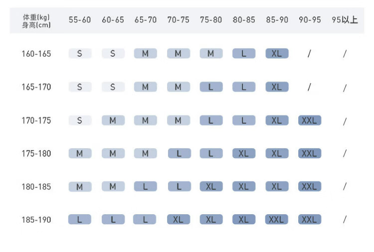 China (cm) 165 / 88-90 170 / 96-98 175 / 108-110 180 / 118-122 185 / 126-130
