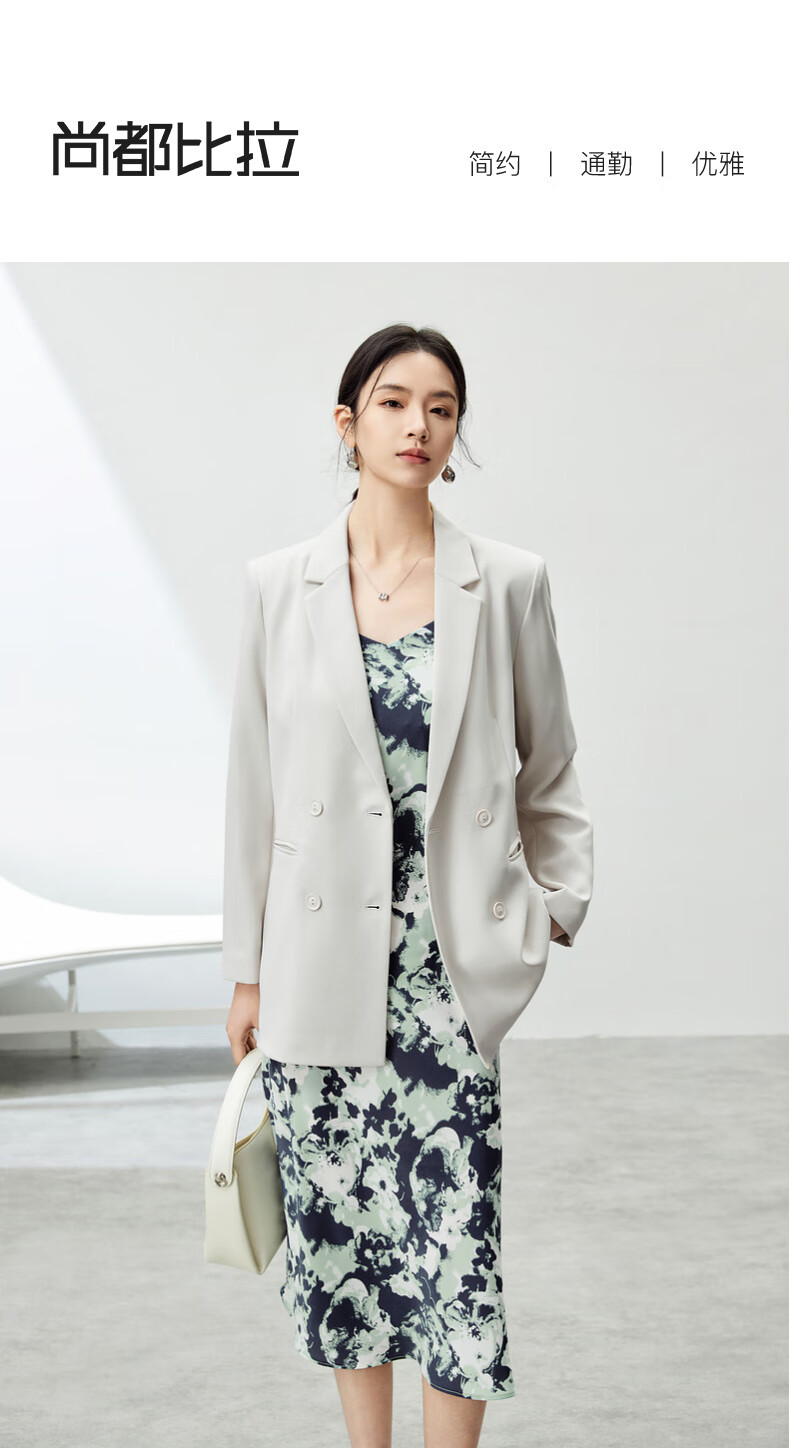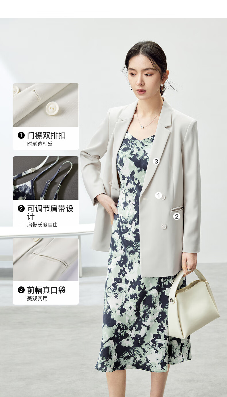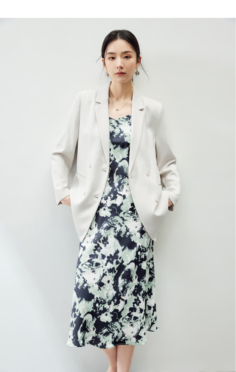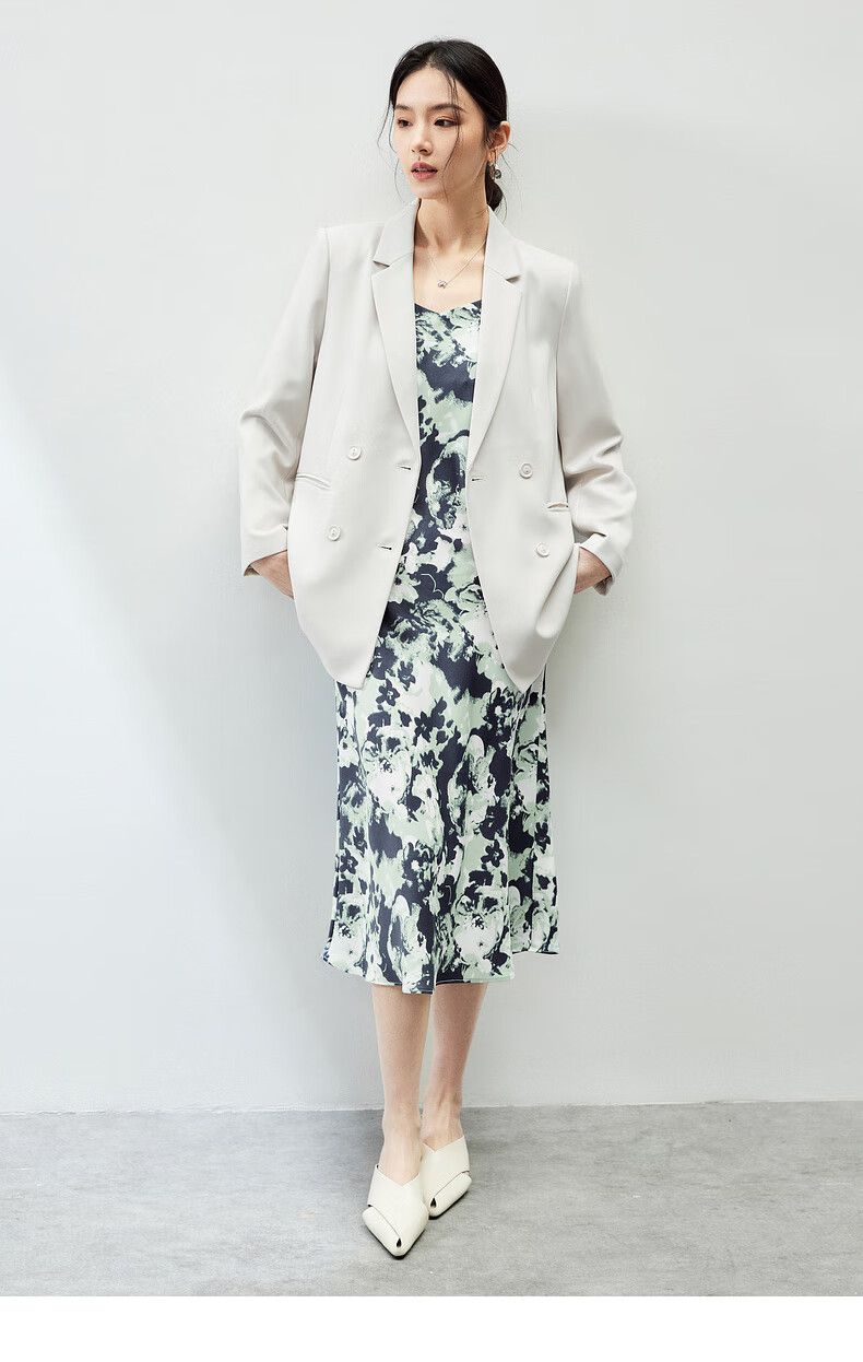 Chandubila fashionable and elegant double-breasted blazer romantic printed suspender dress suit apricot with gray blue XL