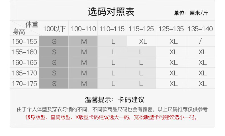 China (cm) 160-165/84-86 165-170 / 88-90 167-172 / 92-96 168-173 / 98-102 170-176 / 106-110