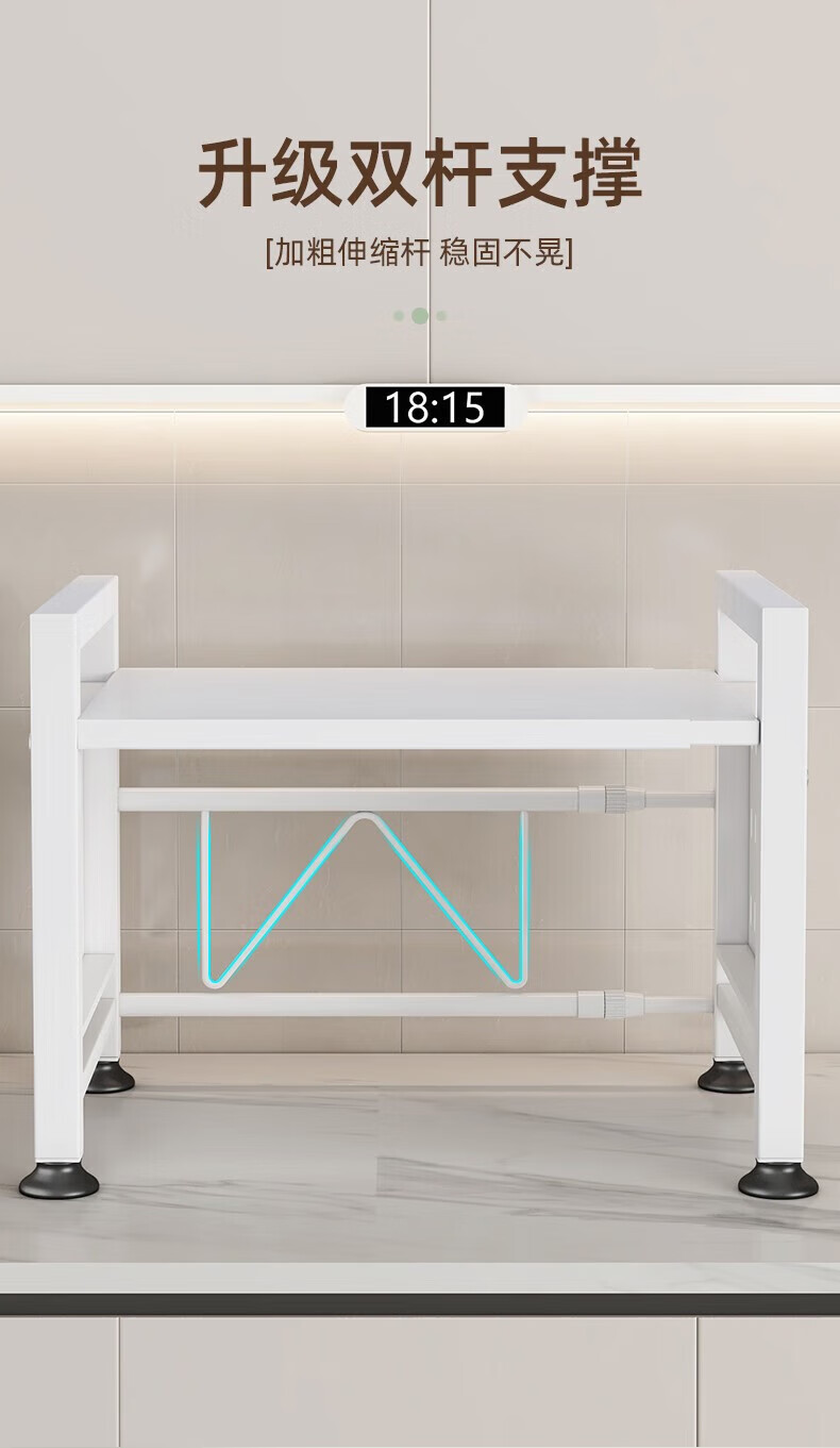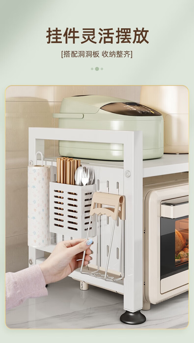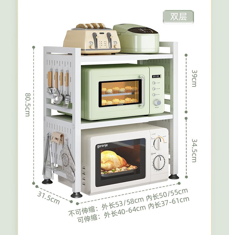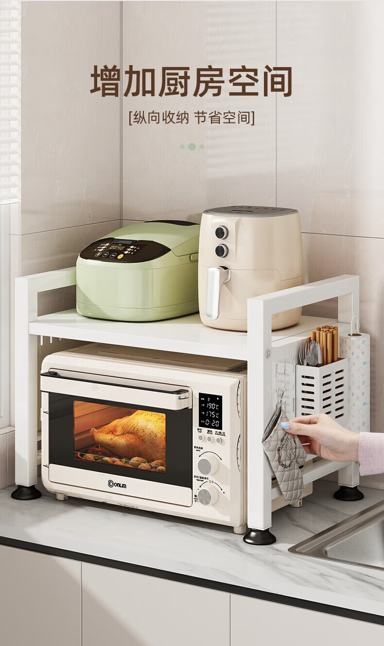 YOUQIN retractable kitchen microwave shelf storage rack multi-functional household countertop rice cooker oven storage bracket white double layer telescopic style + 6 hooks