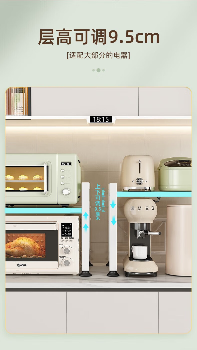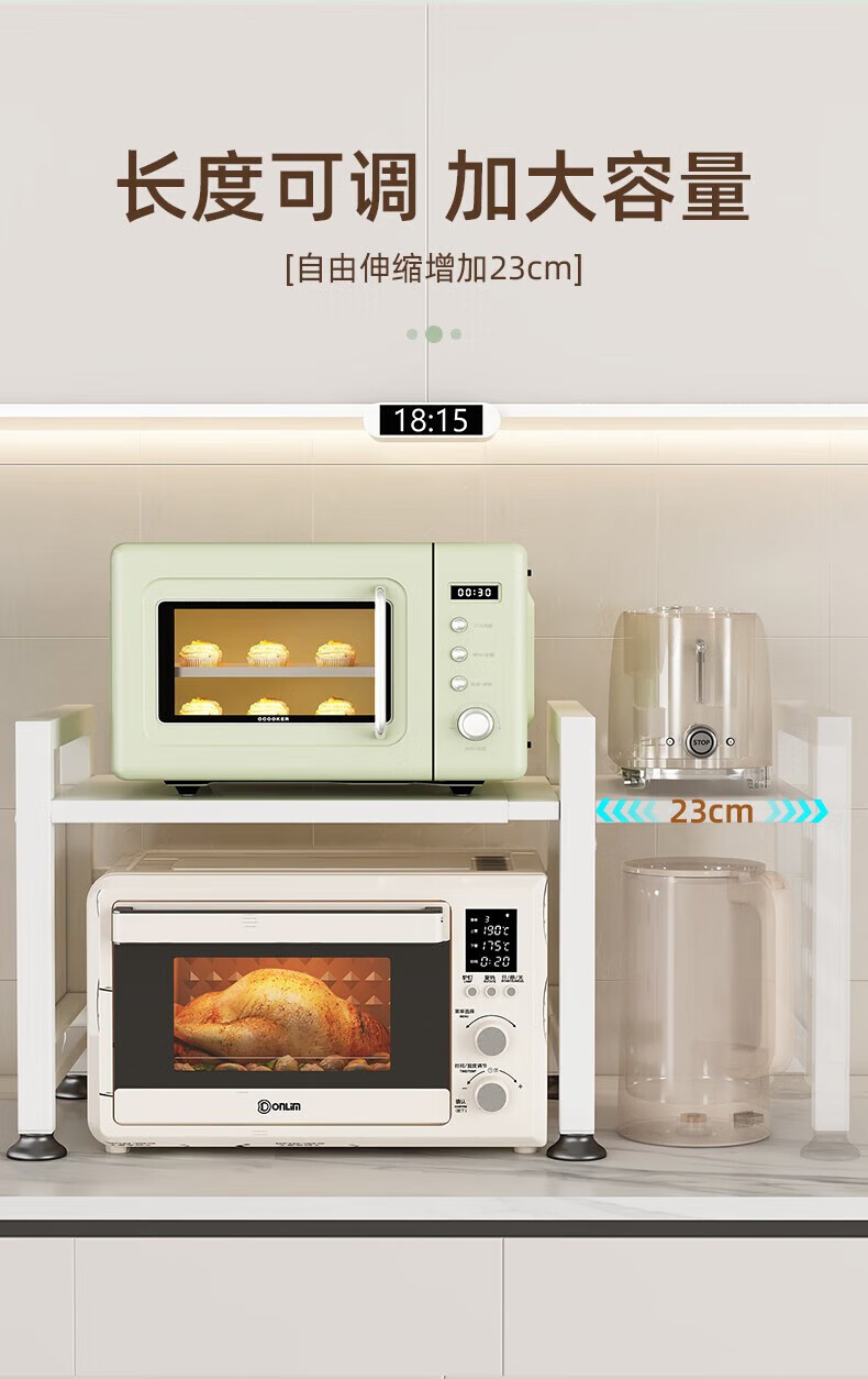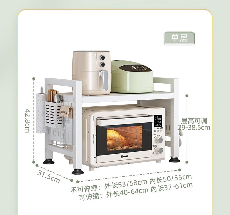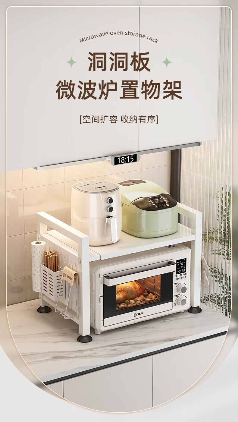 YOUQIN retractable kitchen microwave shelf storage rack multi-functional household countertop rice cooker oven storage bracket white double layer telescopic style + 6 hooks