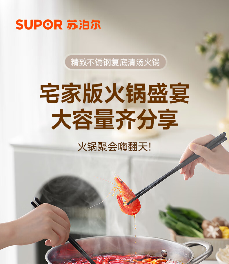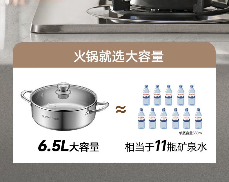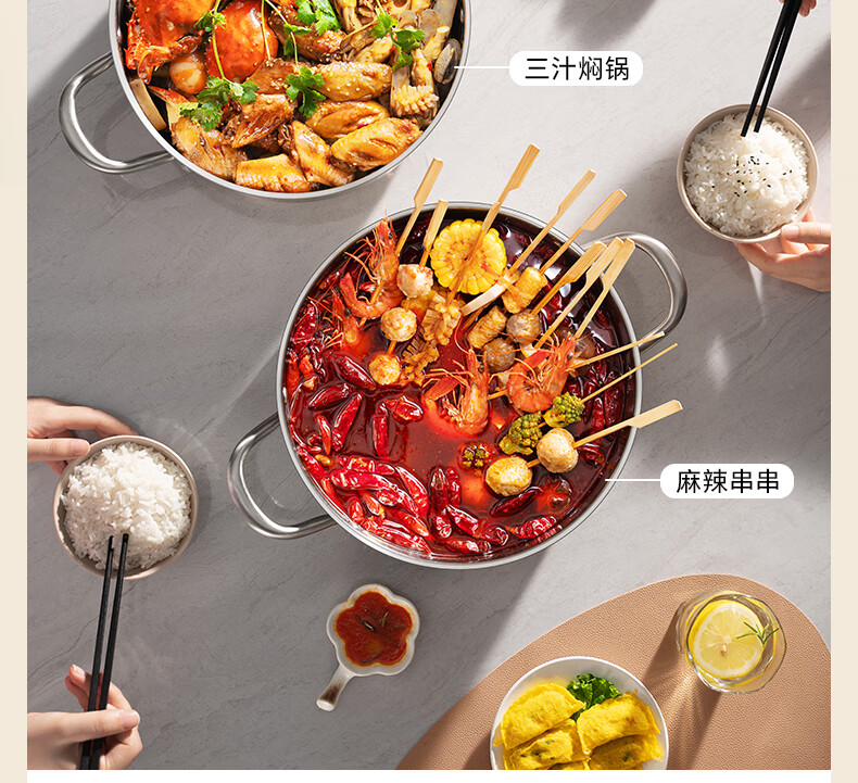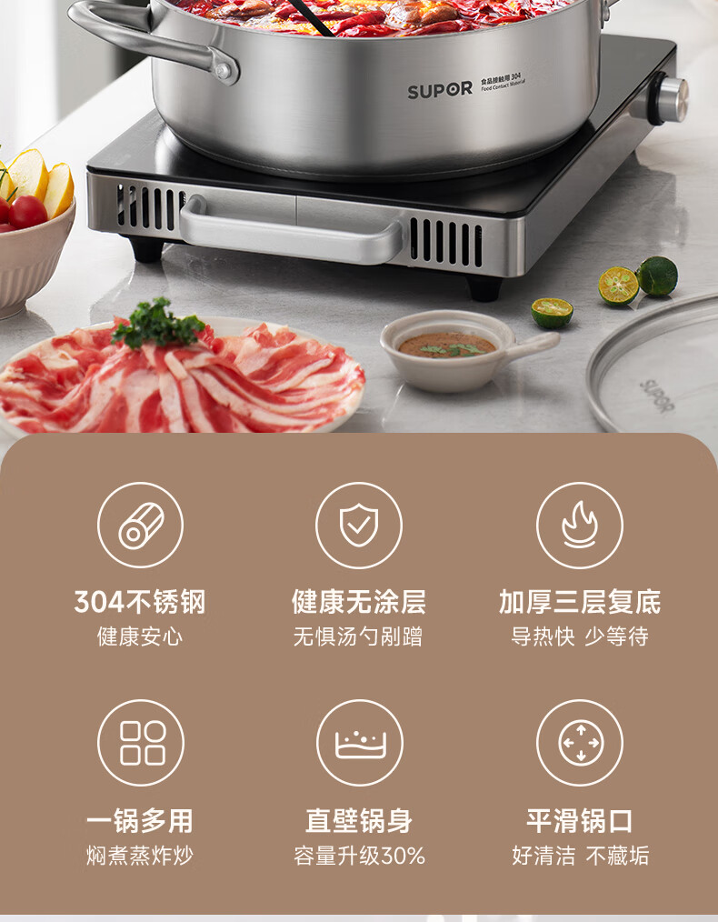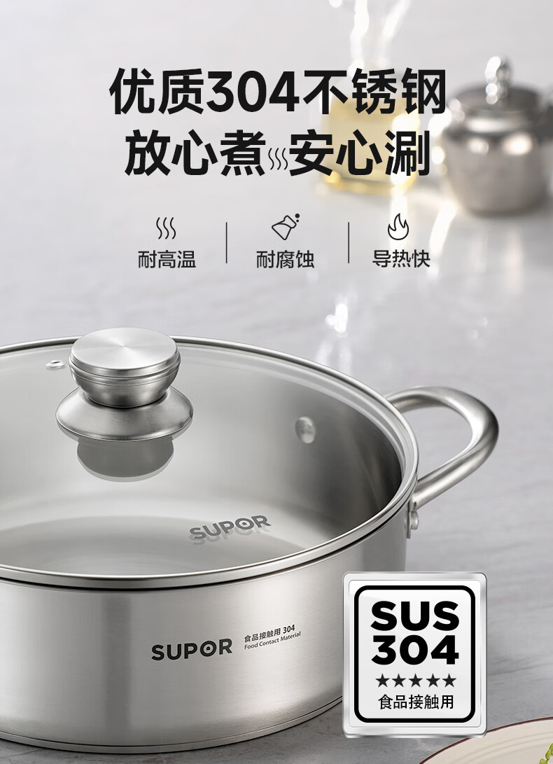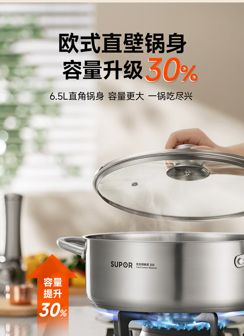 SUPOR hot pot special pot large capacity 304 stainless steel thickened double bottom hot pot soup pot induction cooker household multi-function pot large stainless steel hot pot 6.5L 30cm